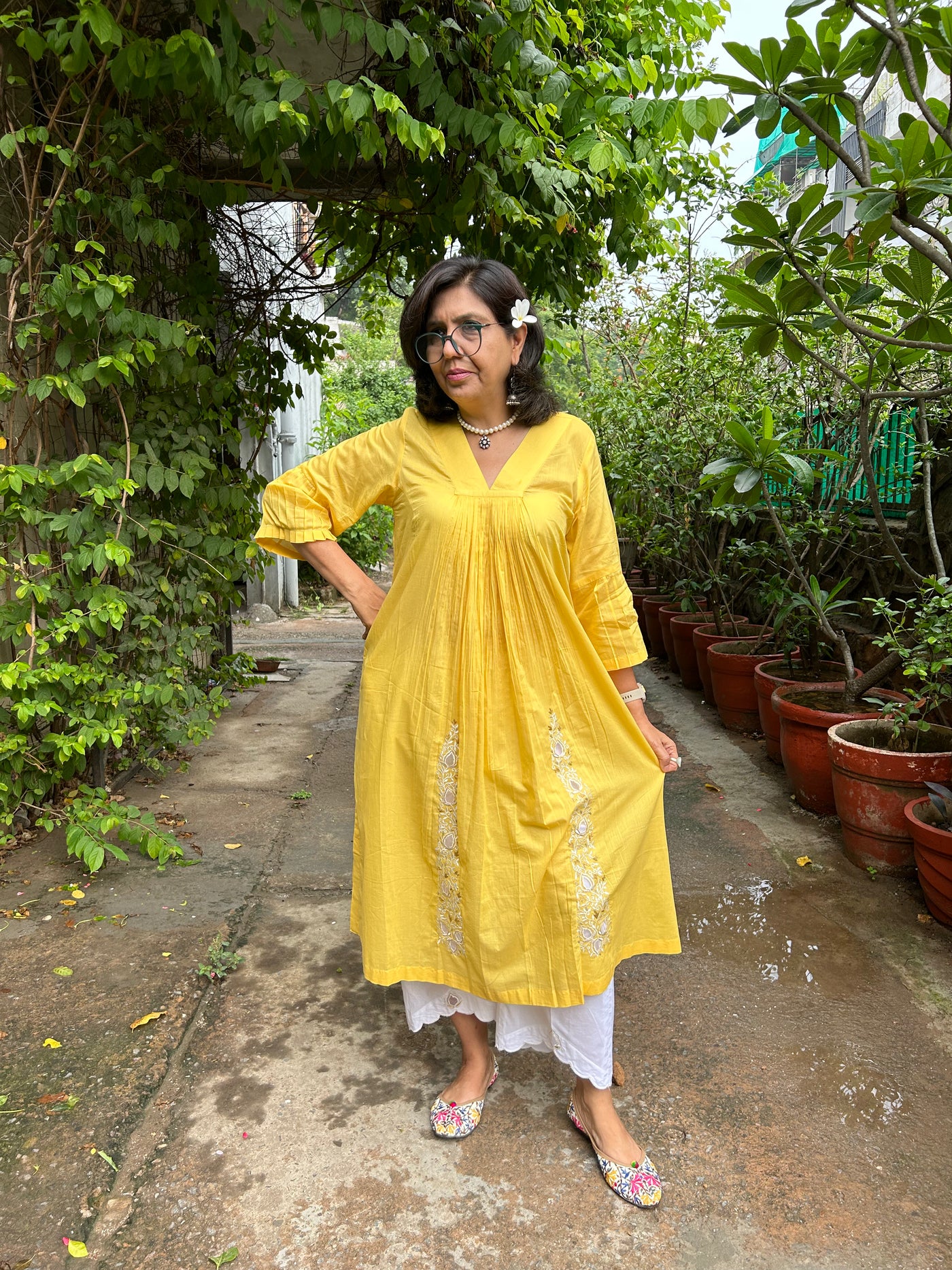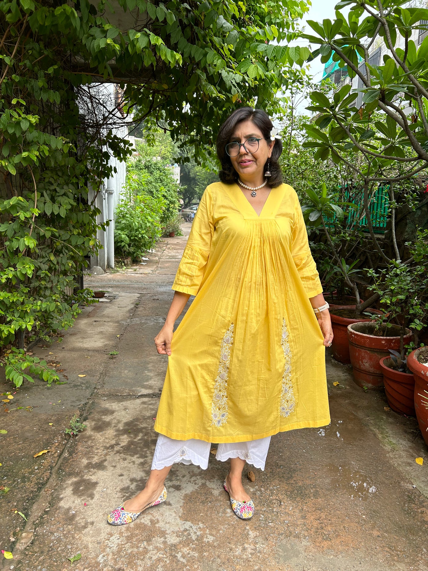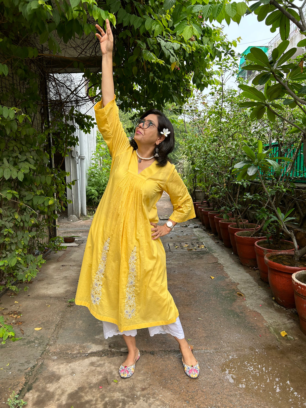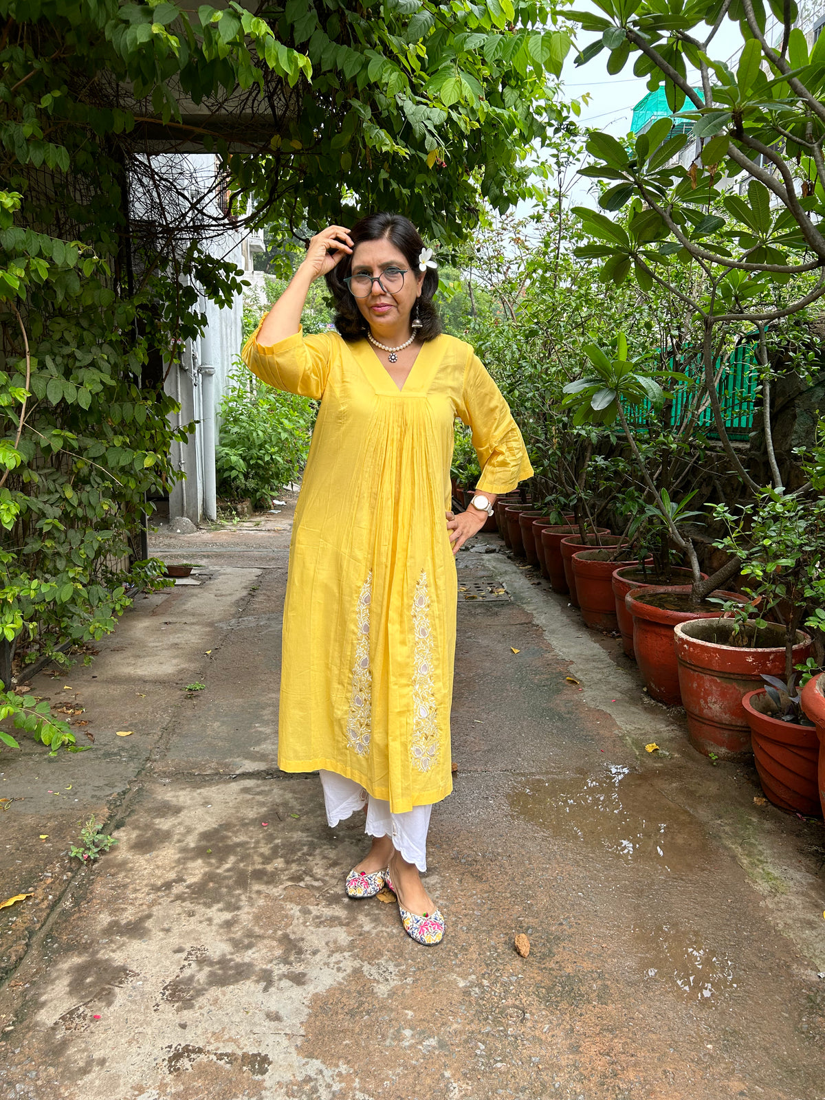 A pure soft cotton muslin kurta with delicate pleating and intricate thread, good zari n jaali work is paired with a bottom with scalloping and jaali boota embroidery.