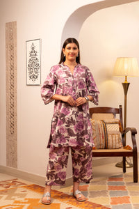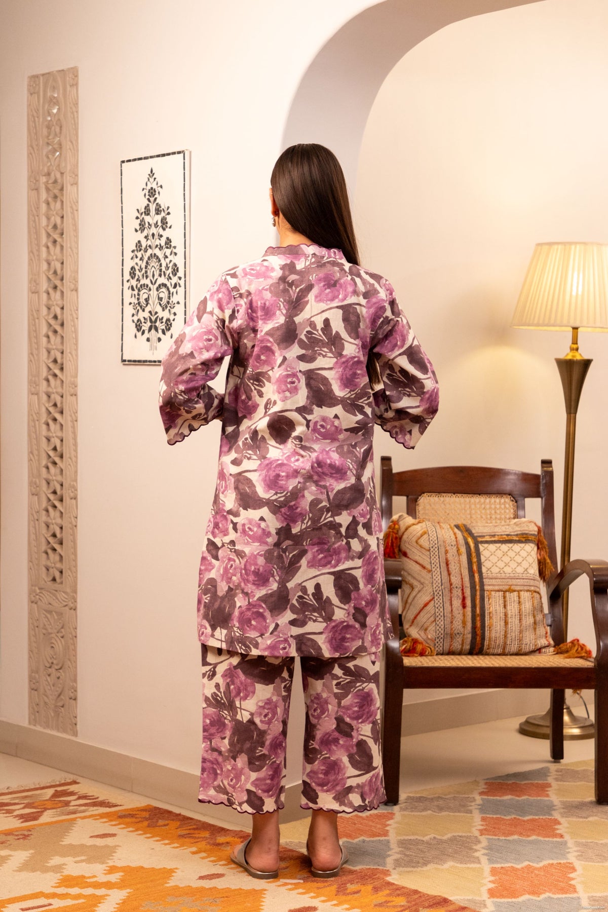 Effortlessly elegant, the Purple Rose Co-ord Set features a rich purple base adorned with burgundy rose and leaf prints throughout. The kurta showcases scalloped detailing on the neckline and three-fourth sleeves, while the straight pants mirror the scallop accents on the hem, creating a cohesive and refined look. Crafted in luxurious linen-cotton fabric, this set is perfect for office wear, luxury airport looks, lunches, dinners, and versatile everyday styling.