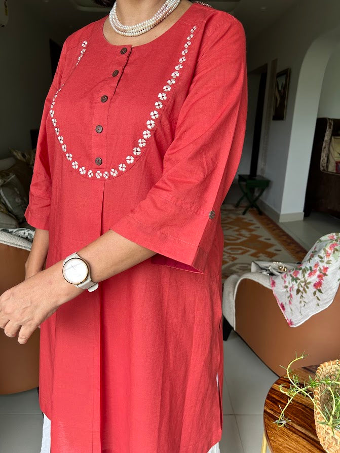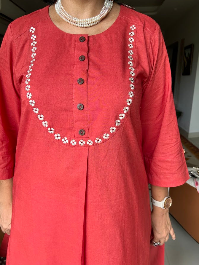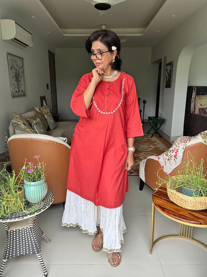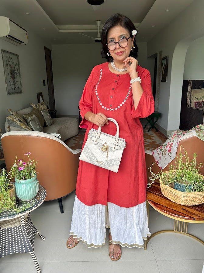 This kurta has beautiful delicate flowers on the yoke and contrasting facing can be paired with crinkled sharara with gota.