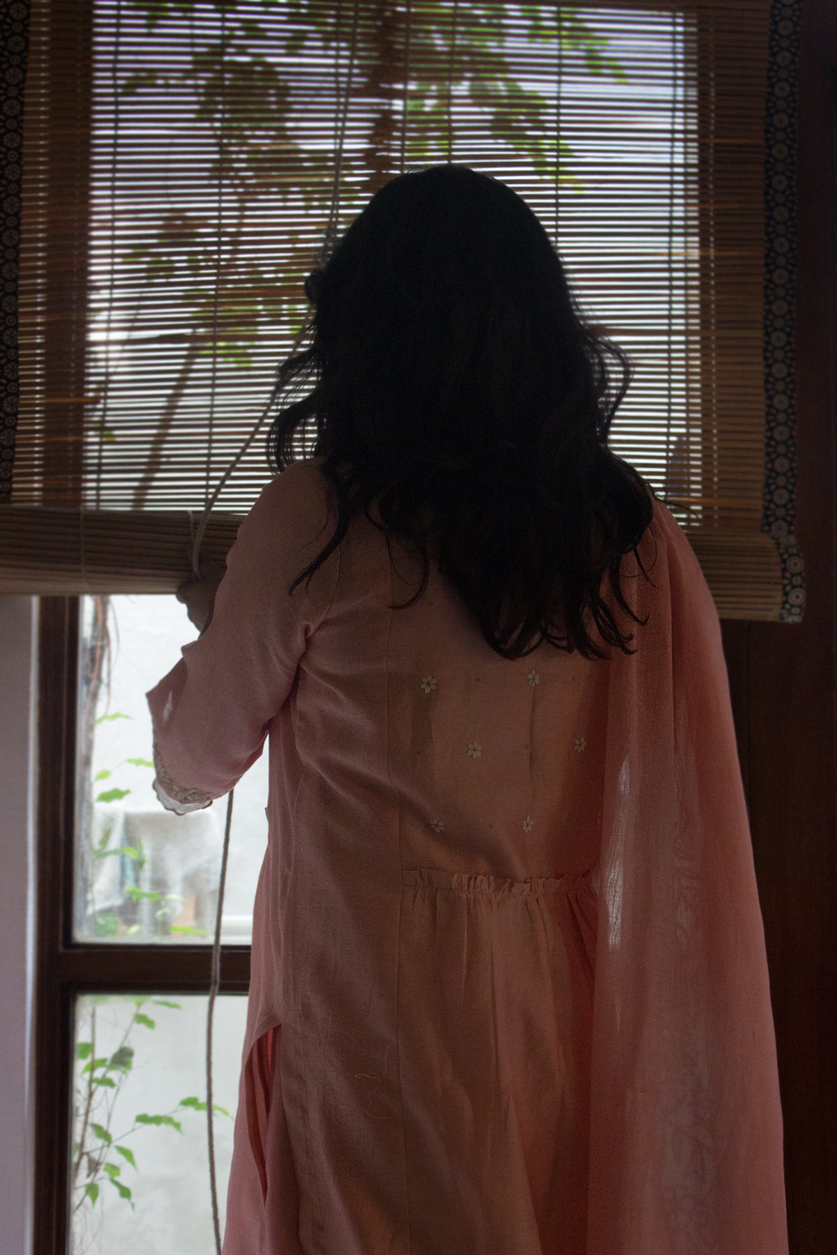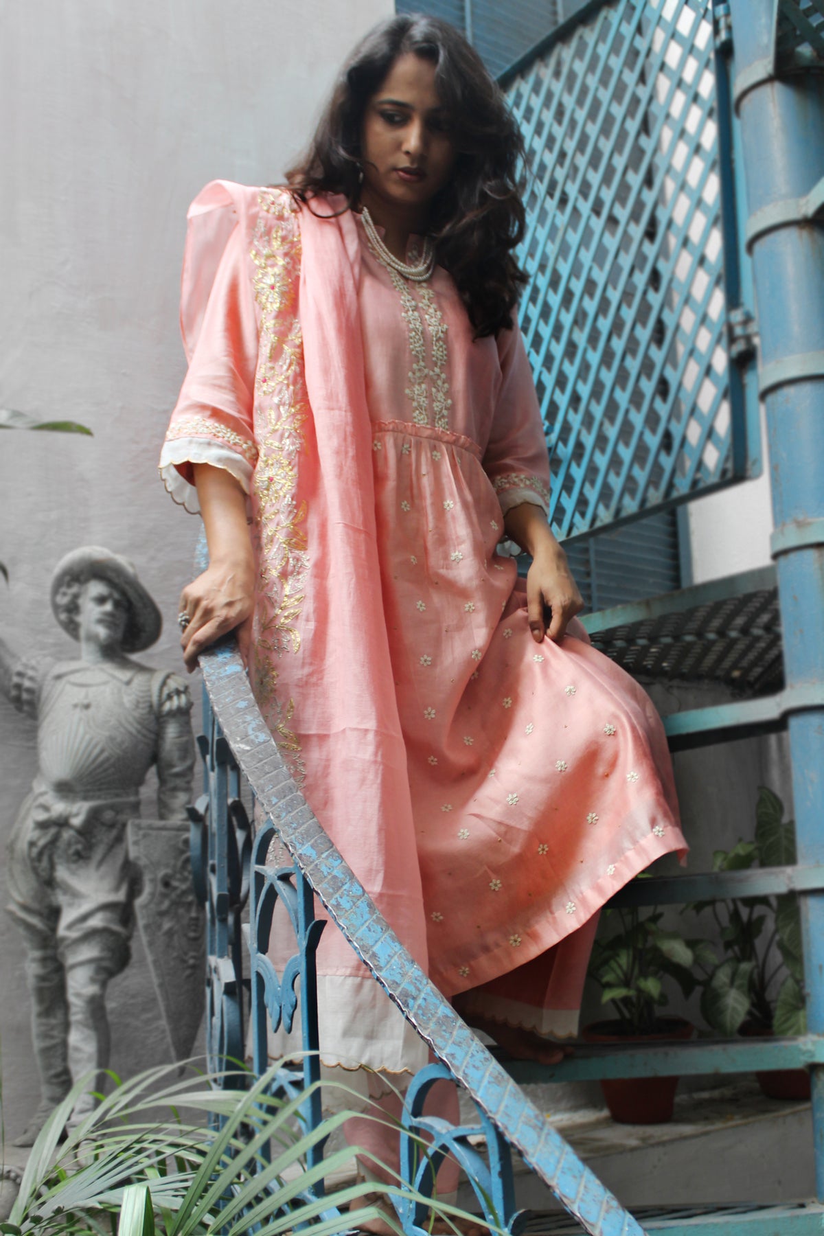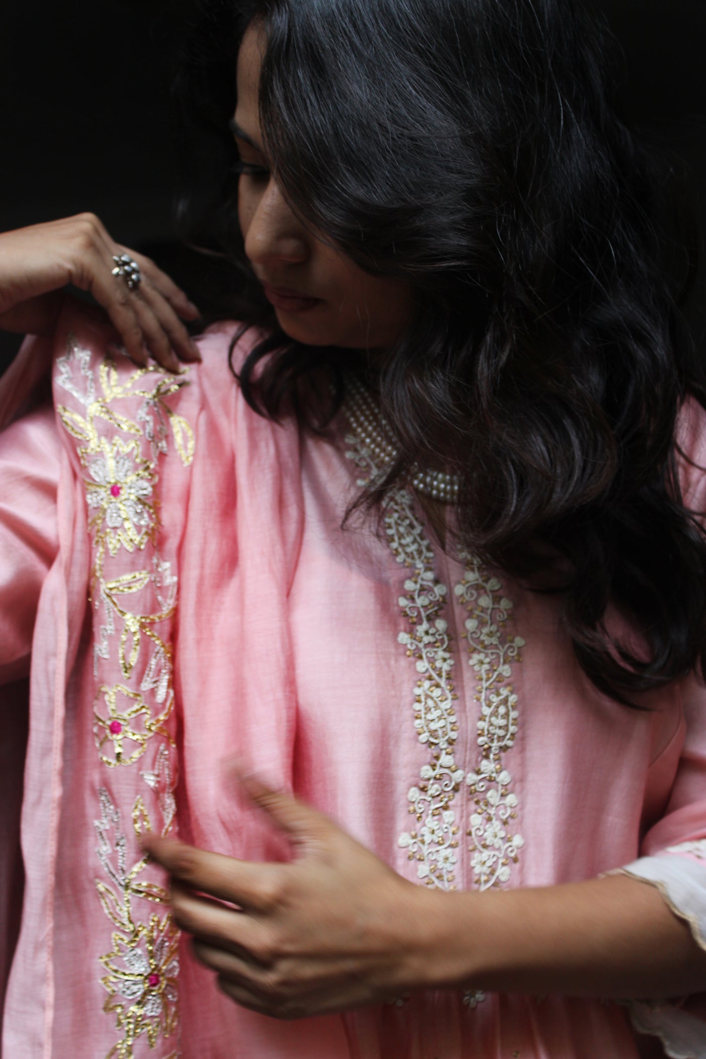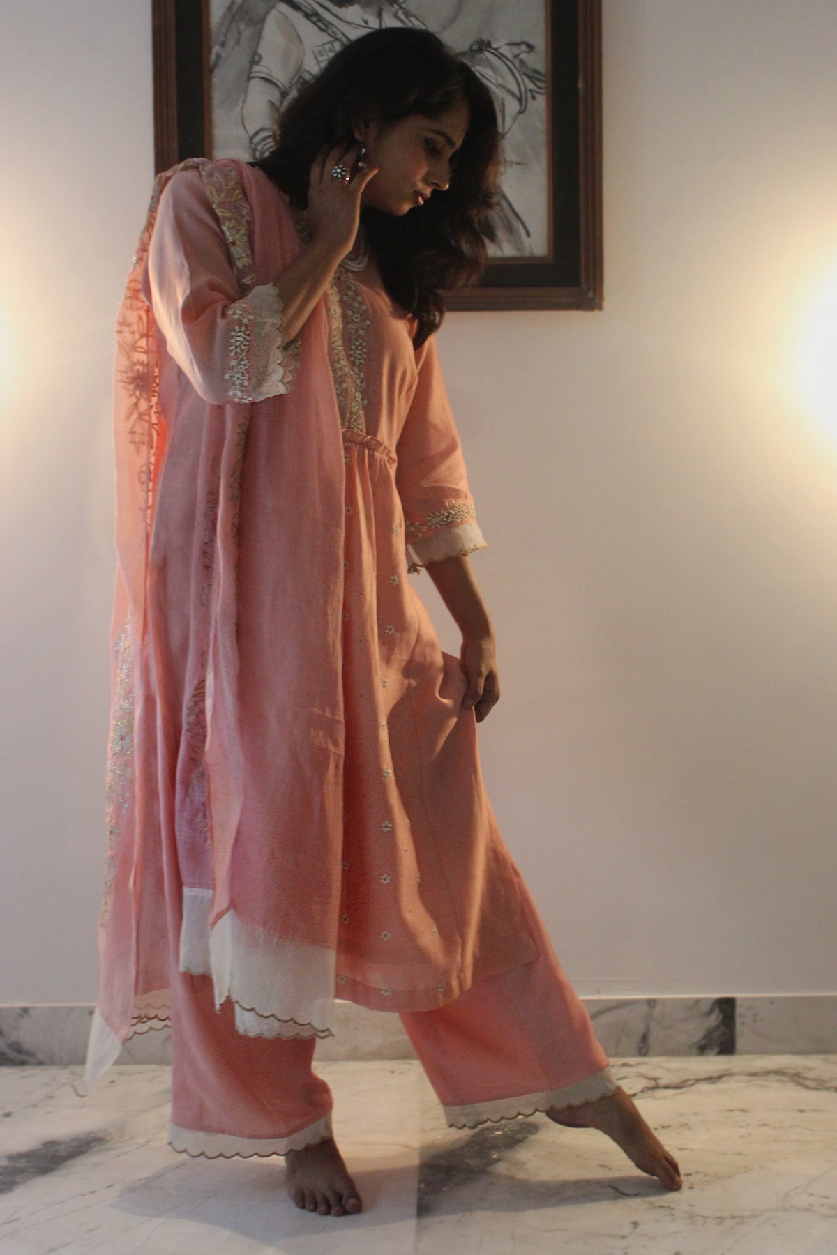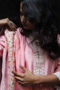A pure Chanderi silk kurta with for in tilla embroidery is paired with a cotton silk bottom with scallop edgings and dupatta with floral gota grand dupatta