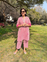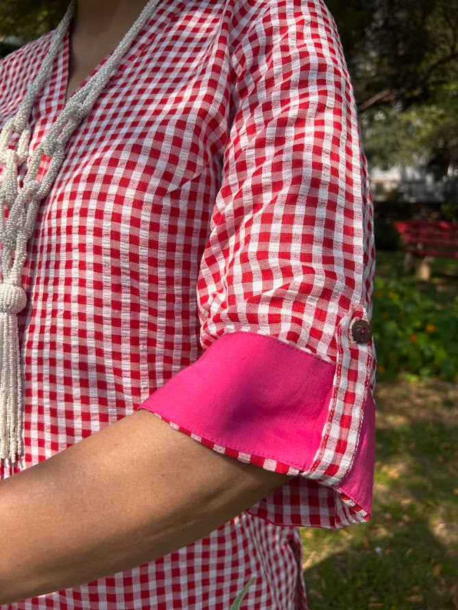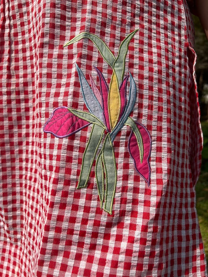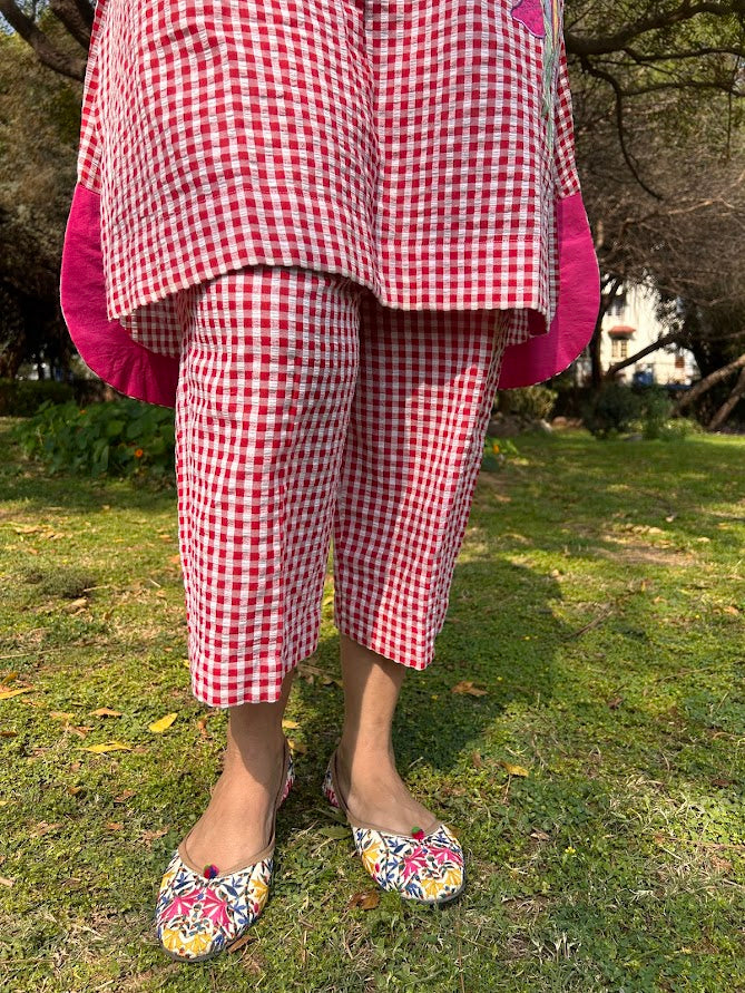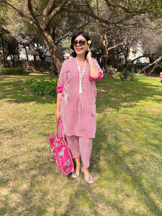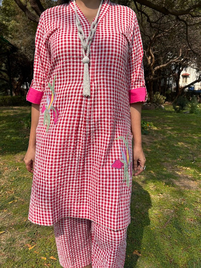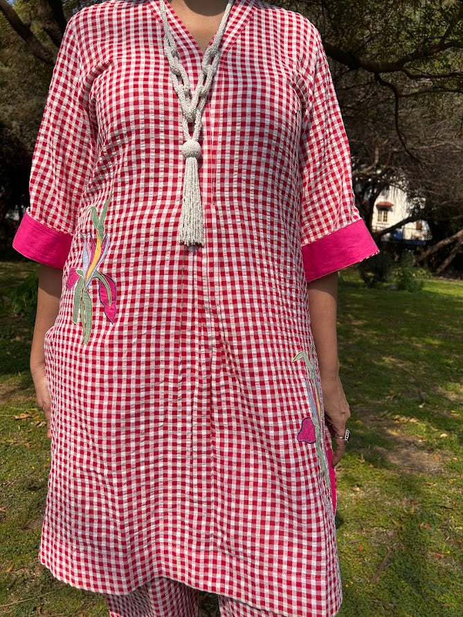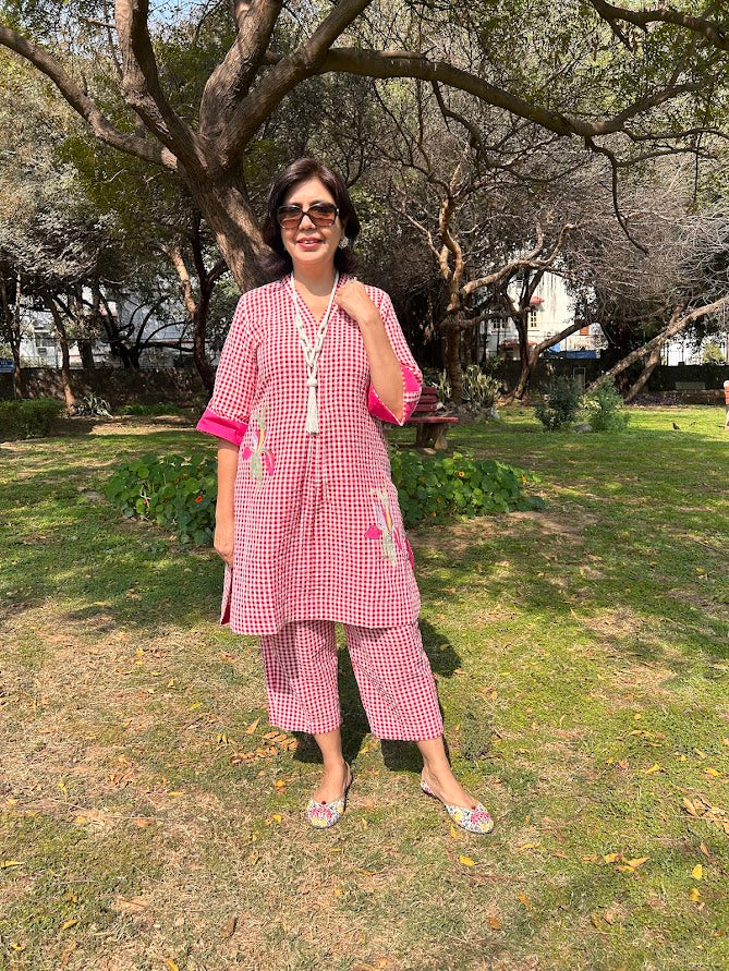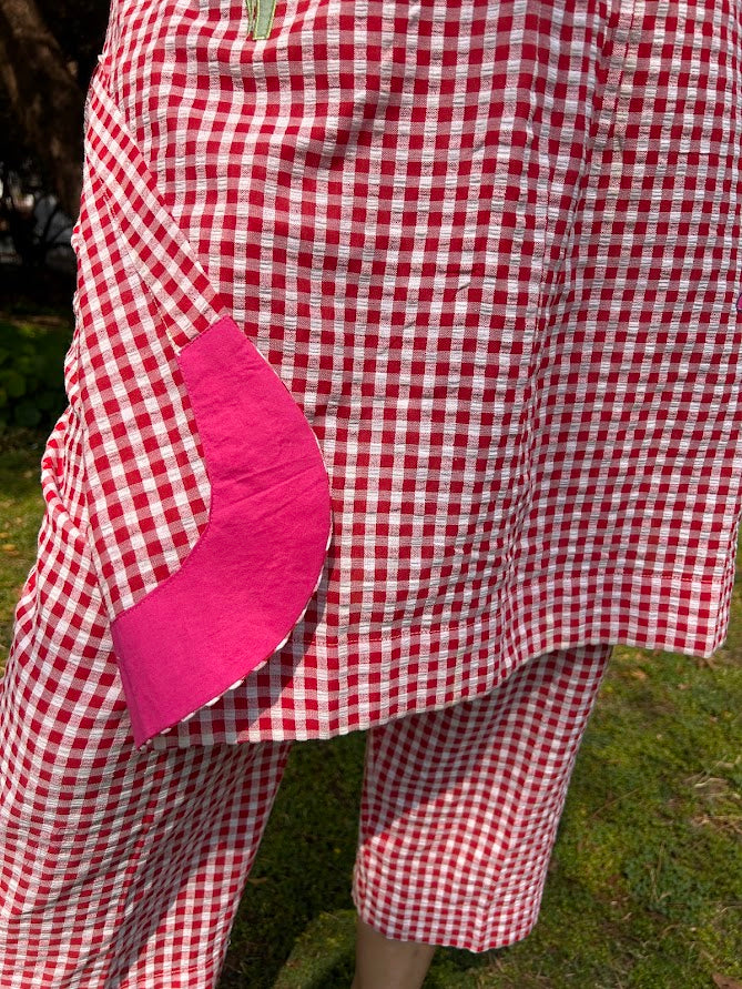 A pure cotton checks co ord set with applique and with pocket detailing and contrasting facing.