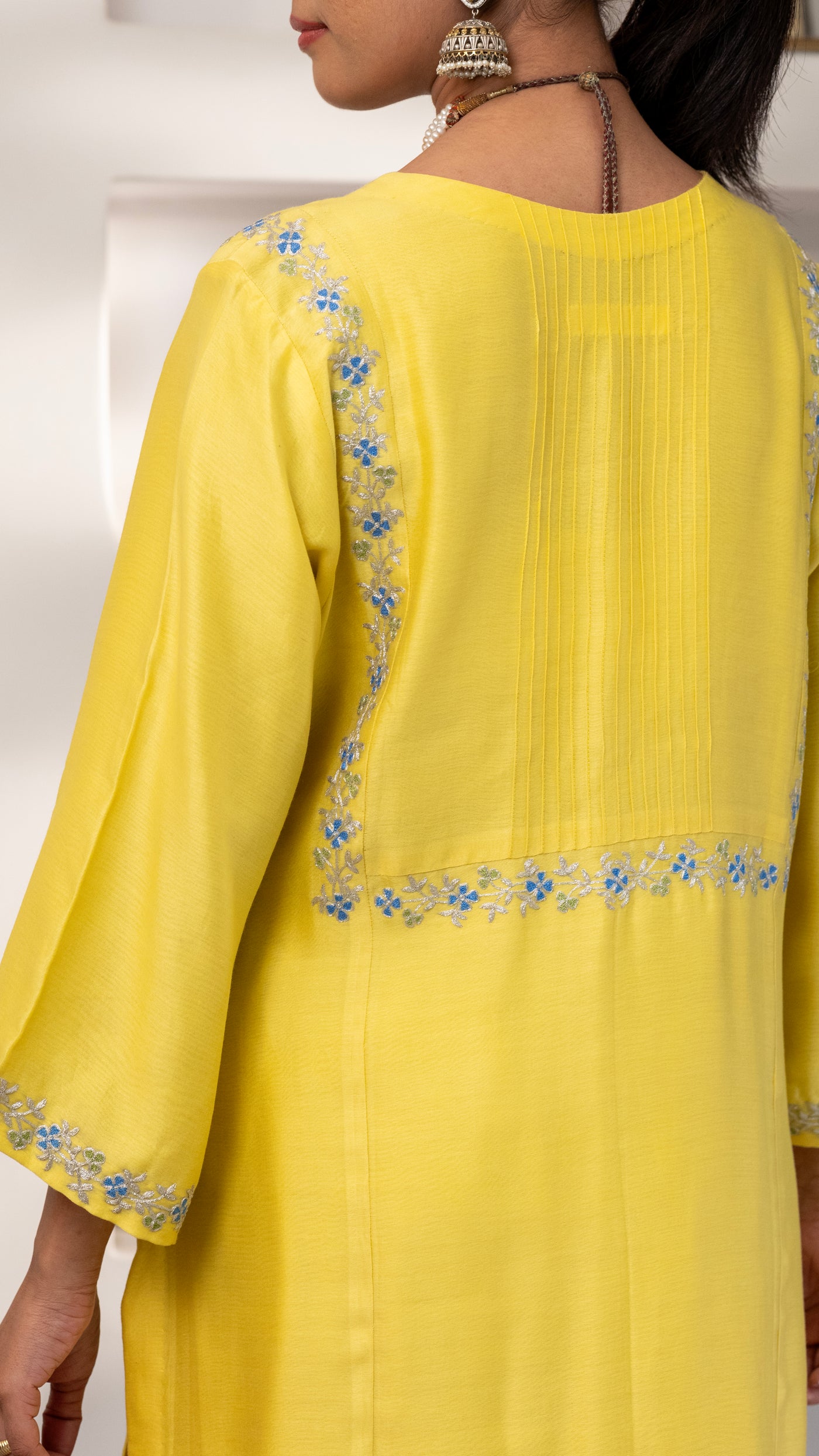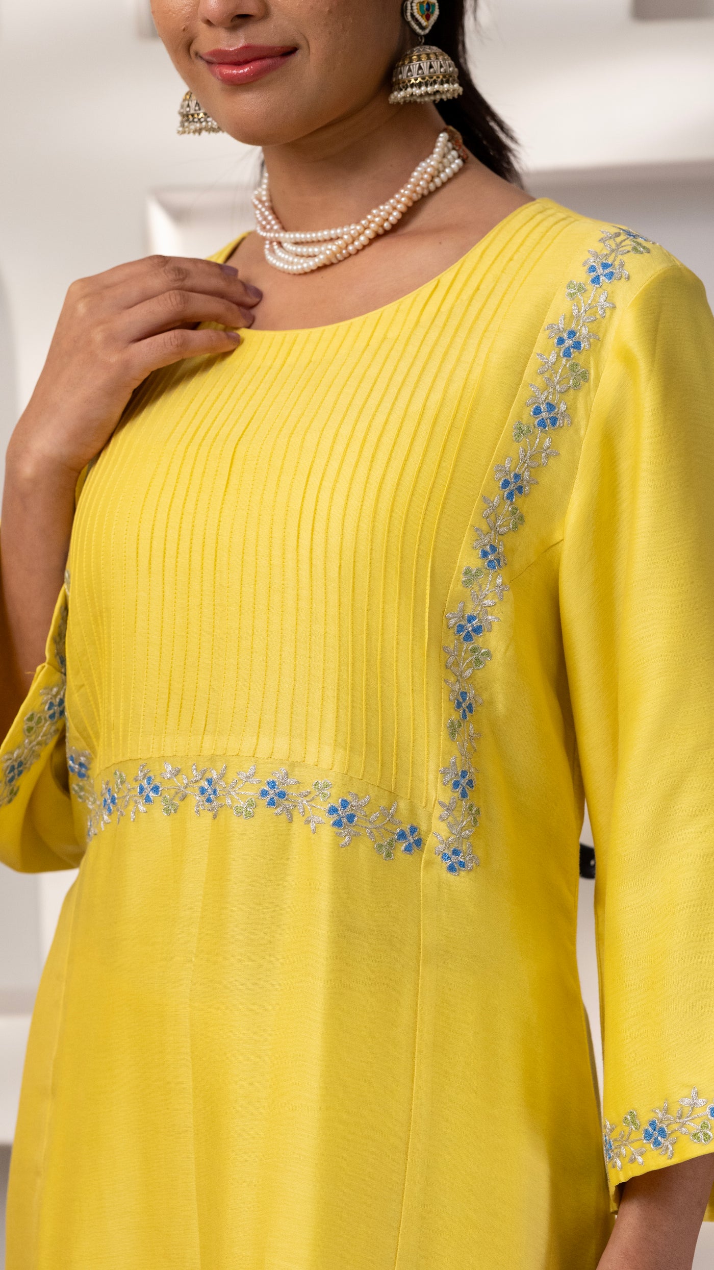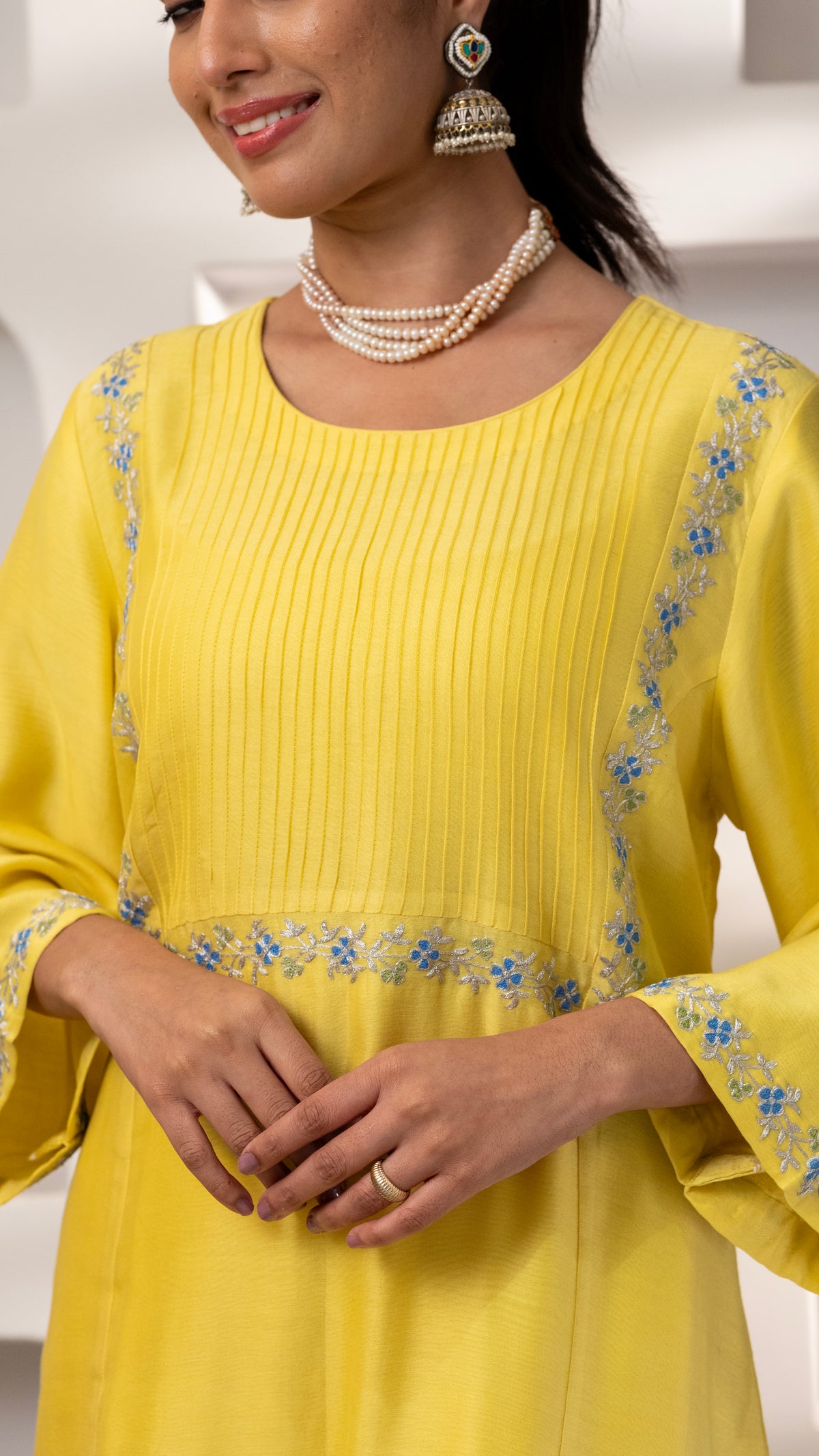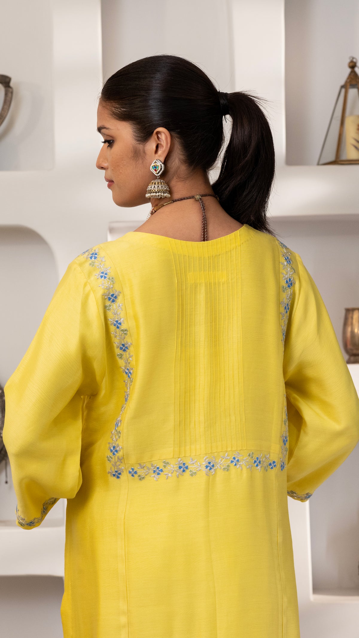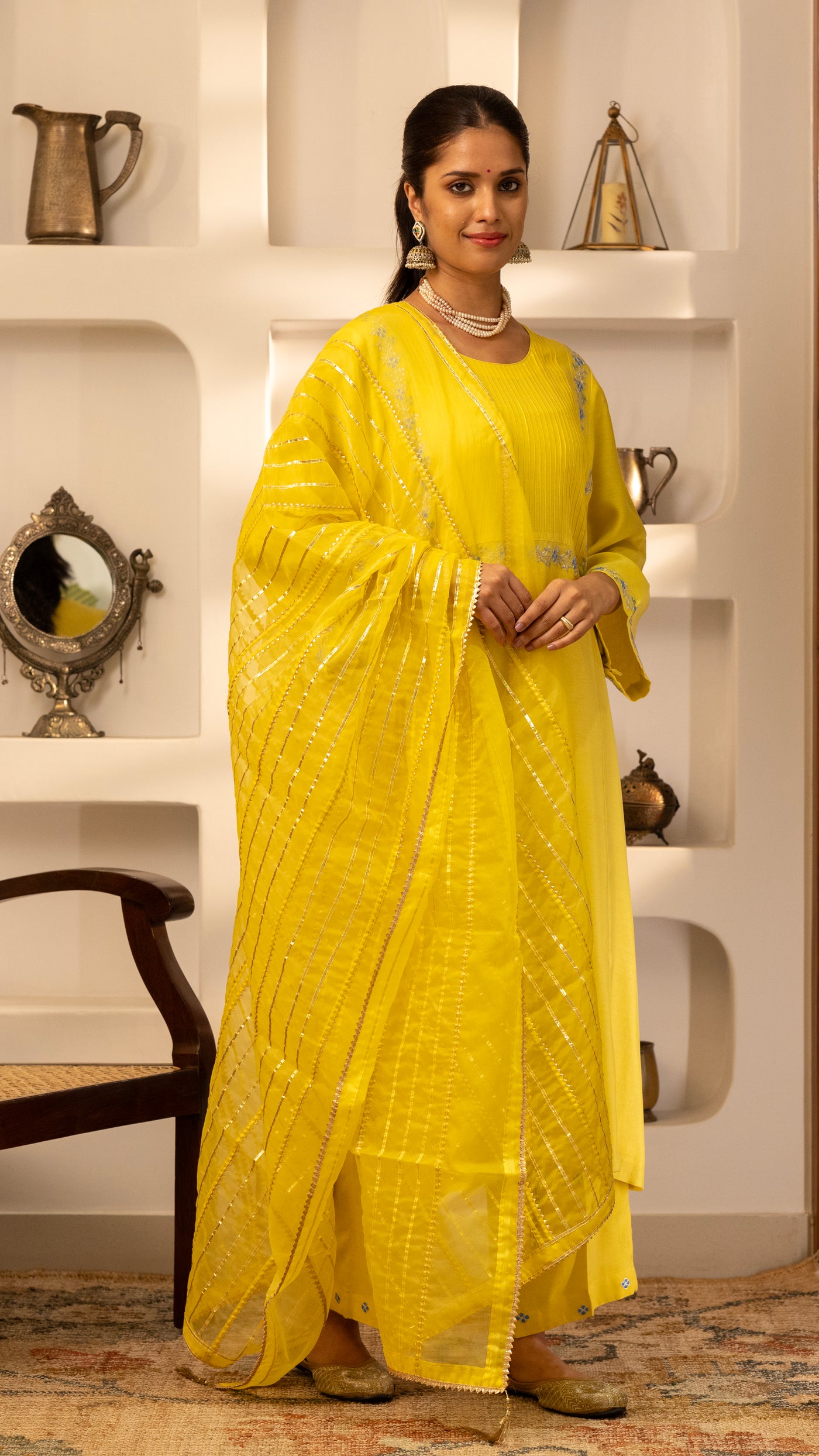 A pure chanderi silk kurta with floral thread and Tilla embroidery on the front and back with delicate pintucks is paired with a cotton silk pants with bootis and pocket. The set is paired with an organza dupatta.