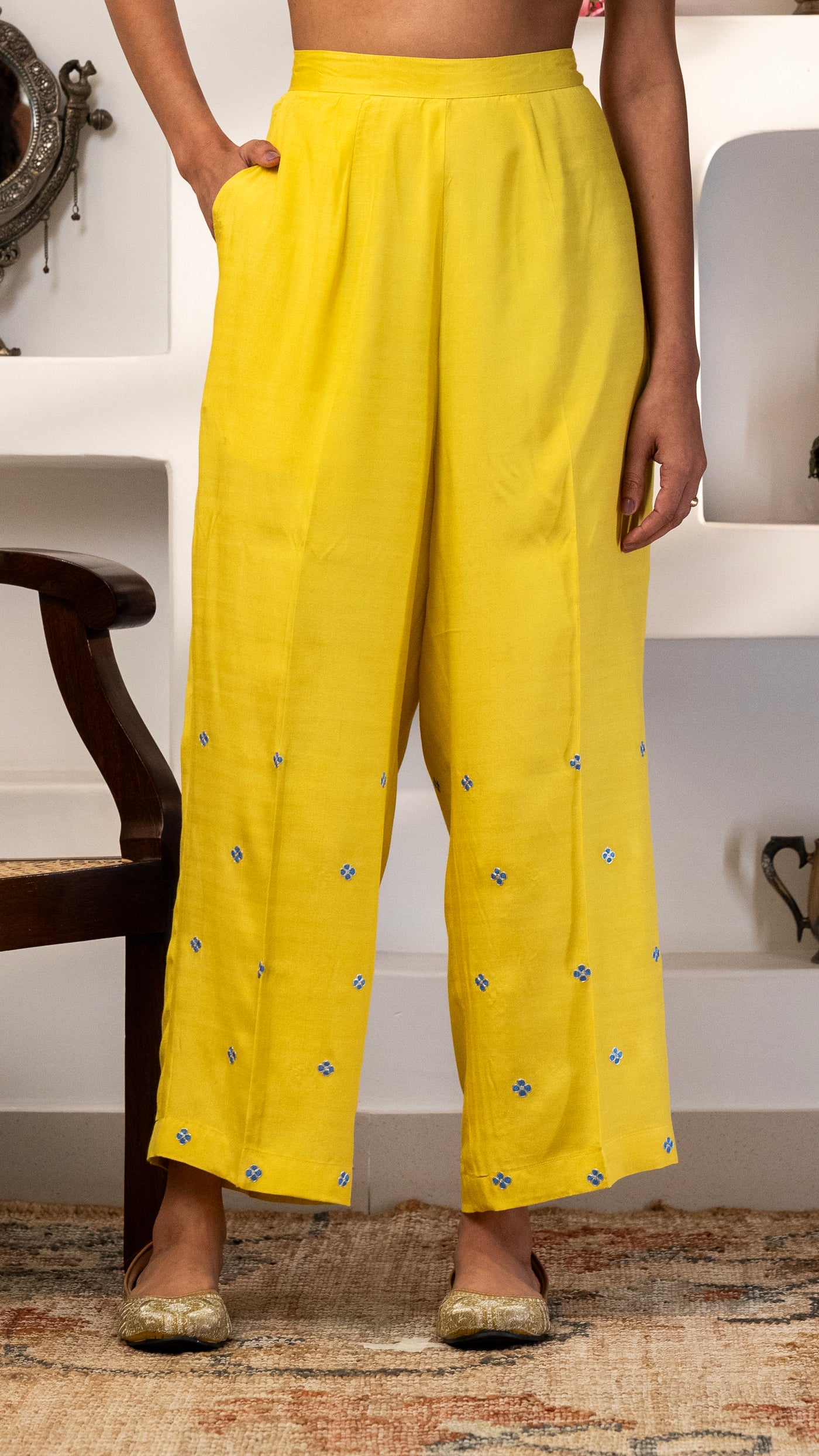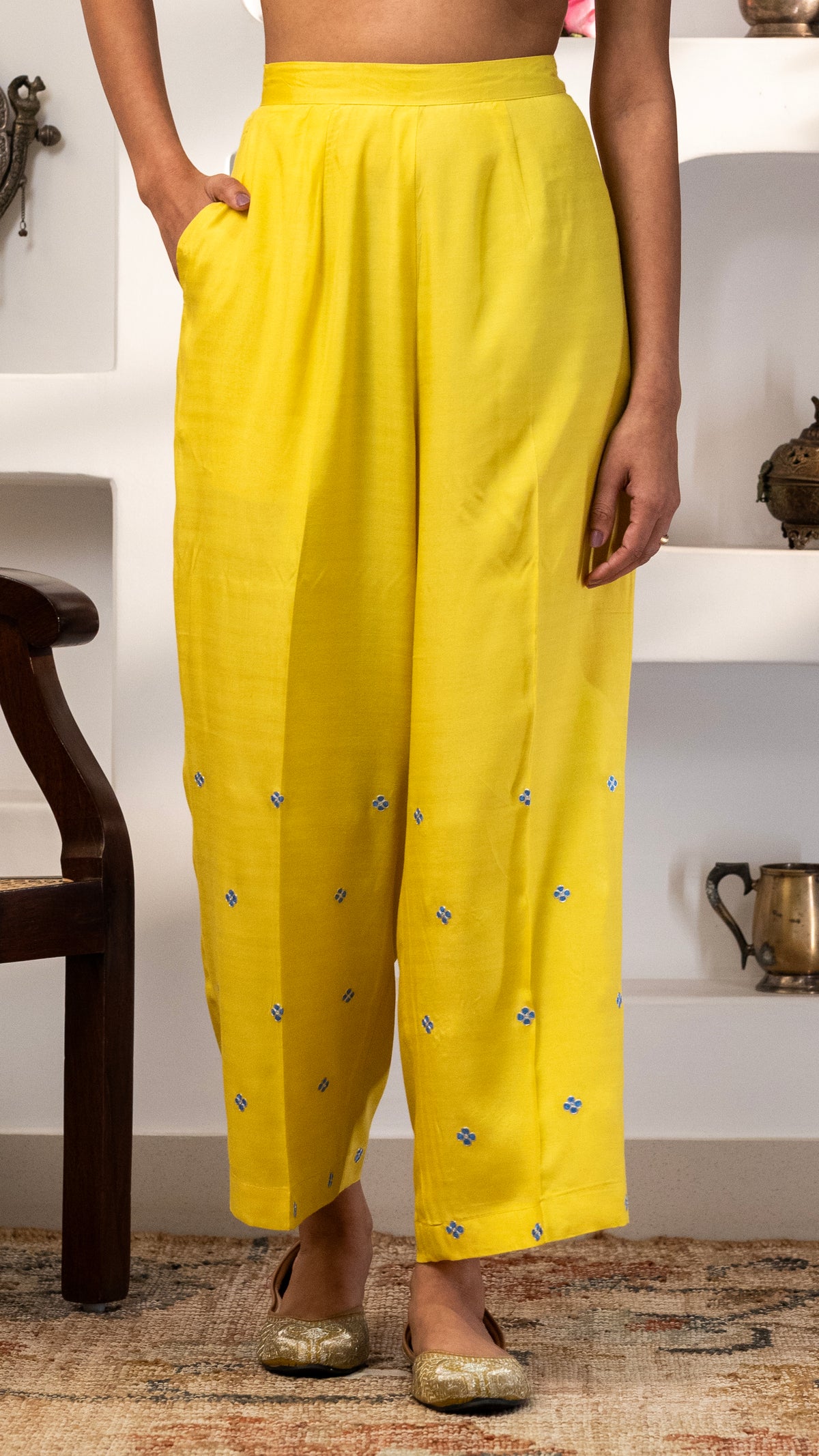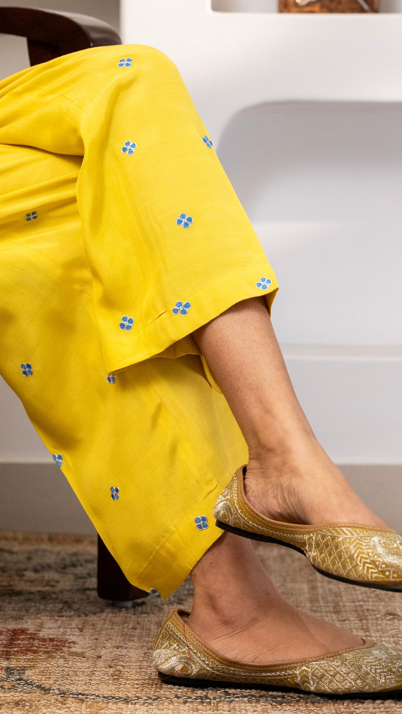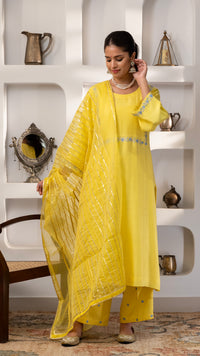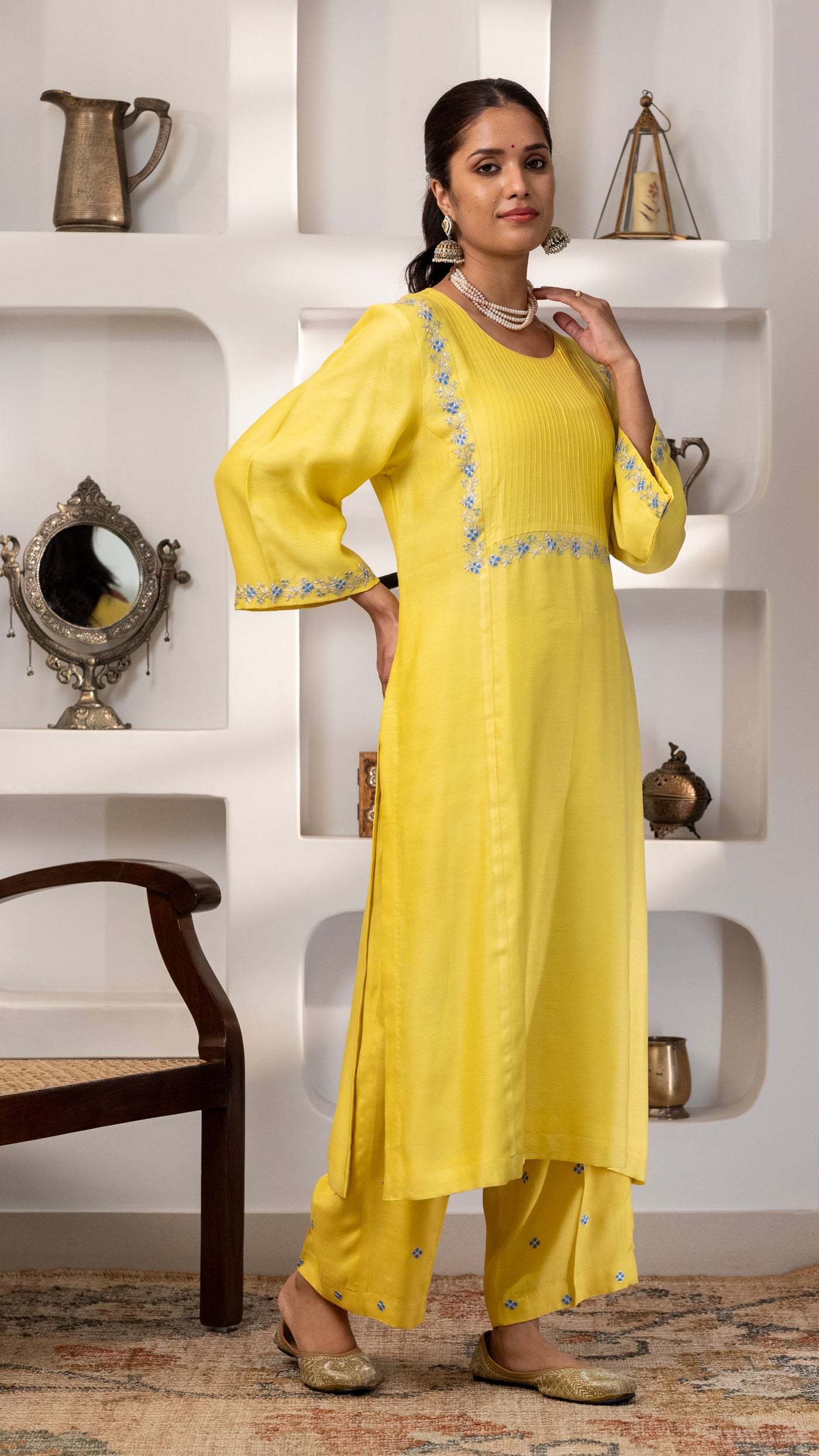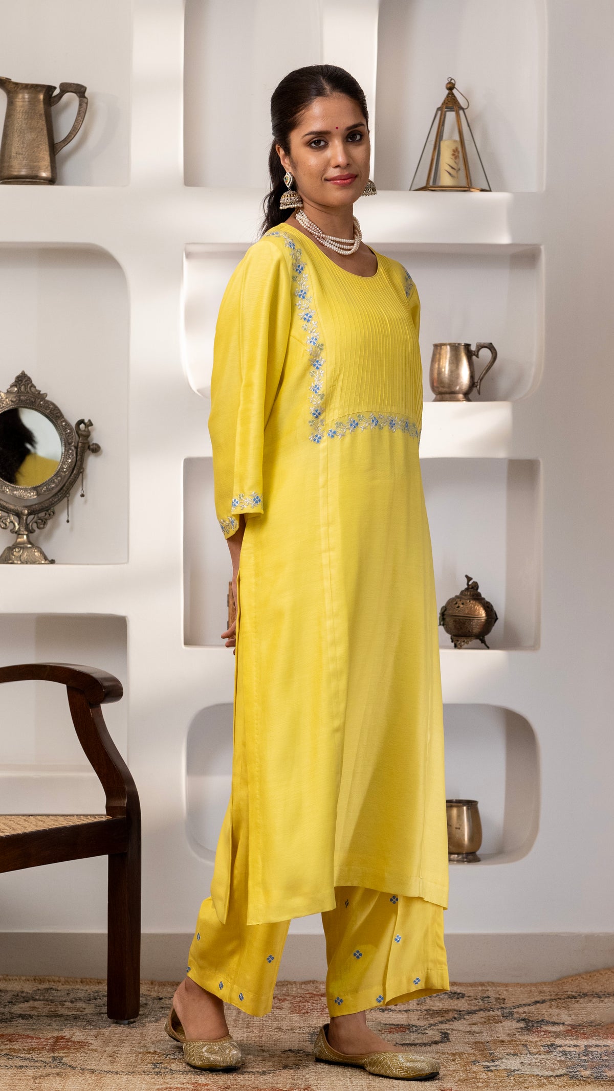 A pure chanderi silk kurta with floral thread and Tilla embroidery on the front and back with delicate pintucks is paired with a cotton silk pants with bootis and pocket. The set is paired with an organza dupatta.