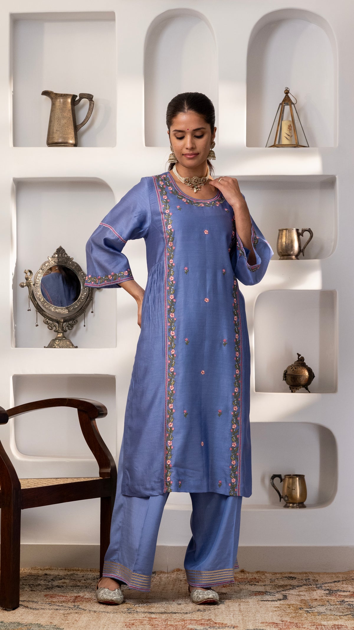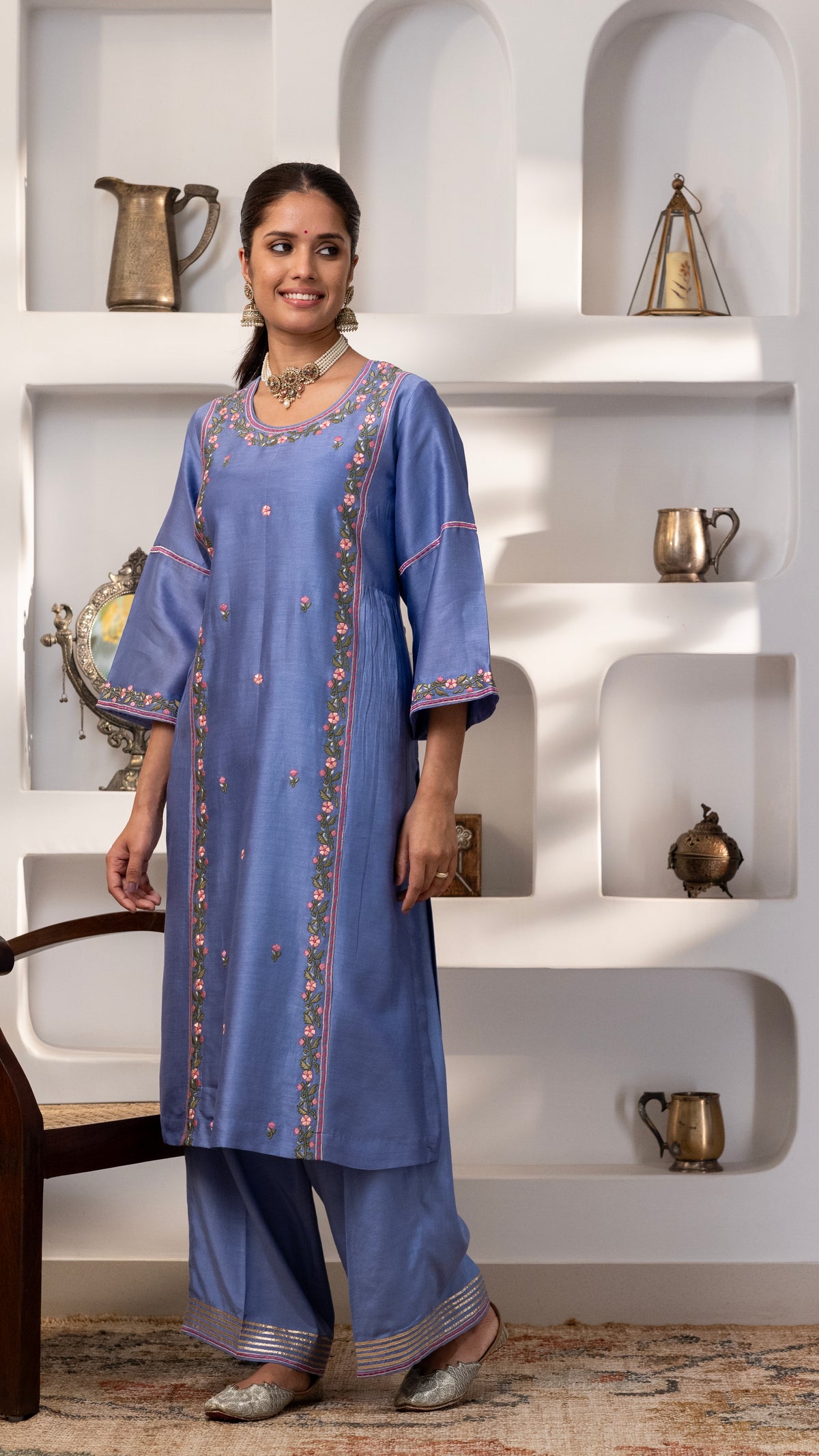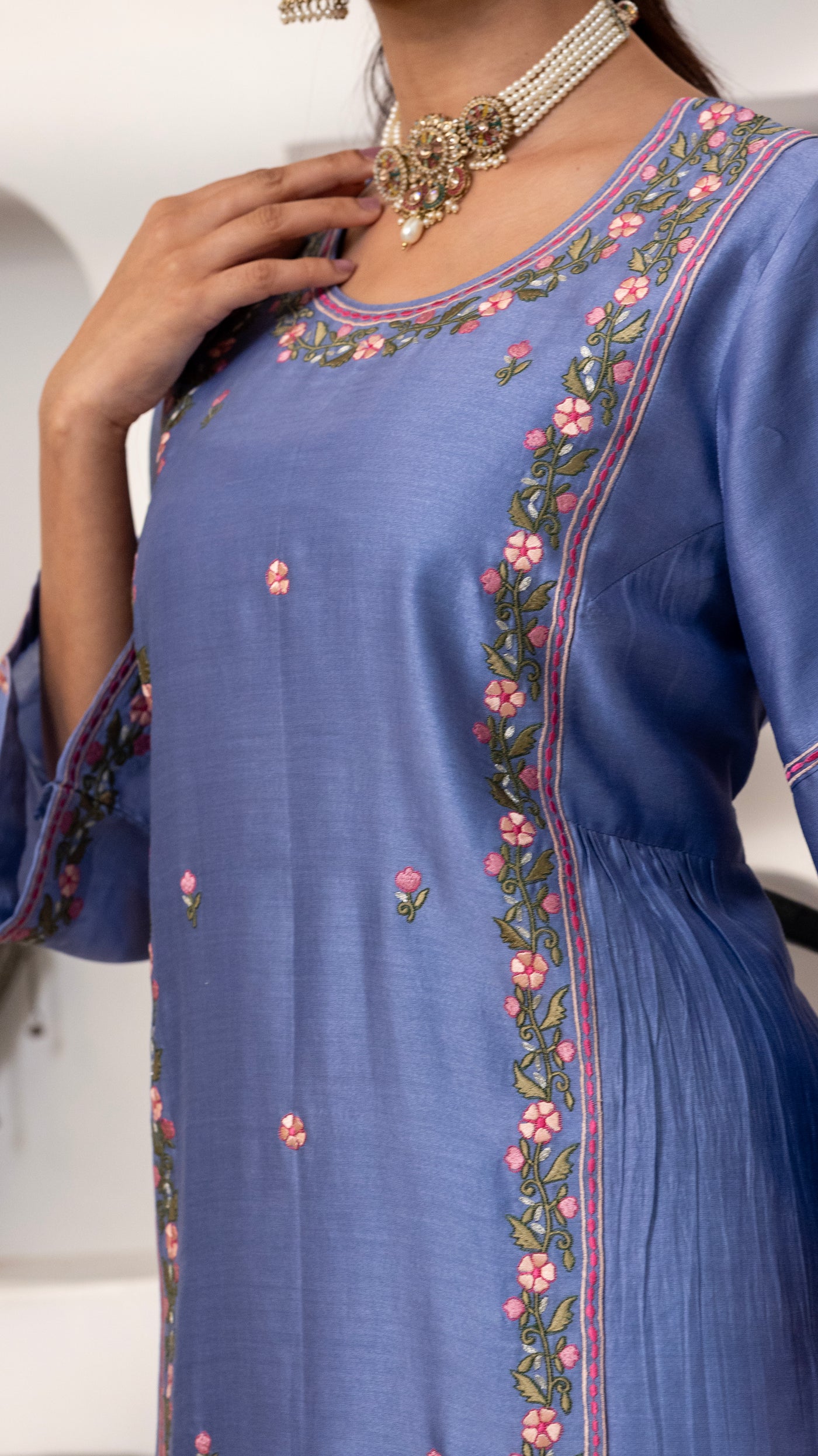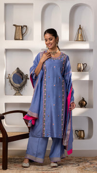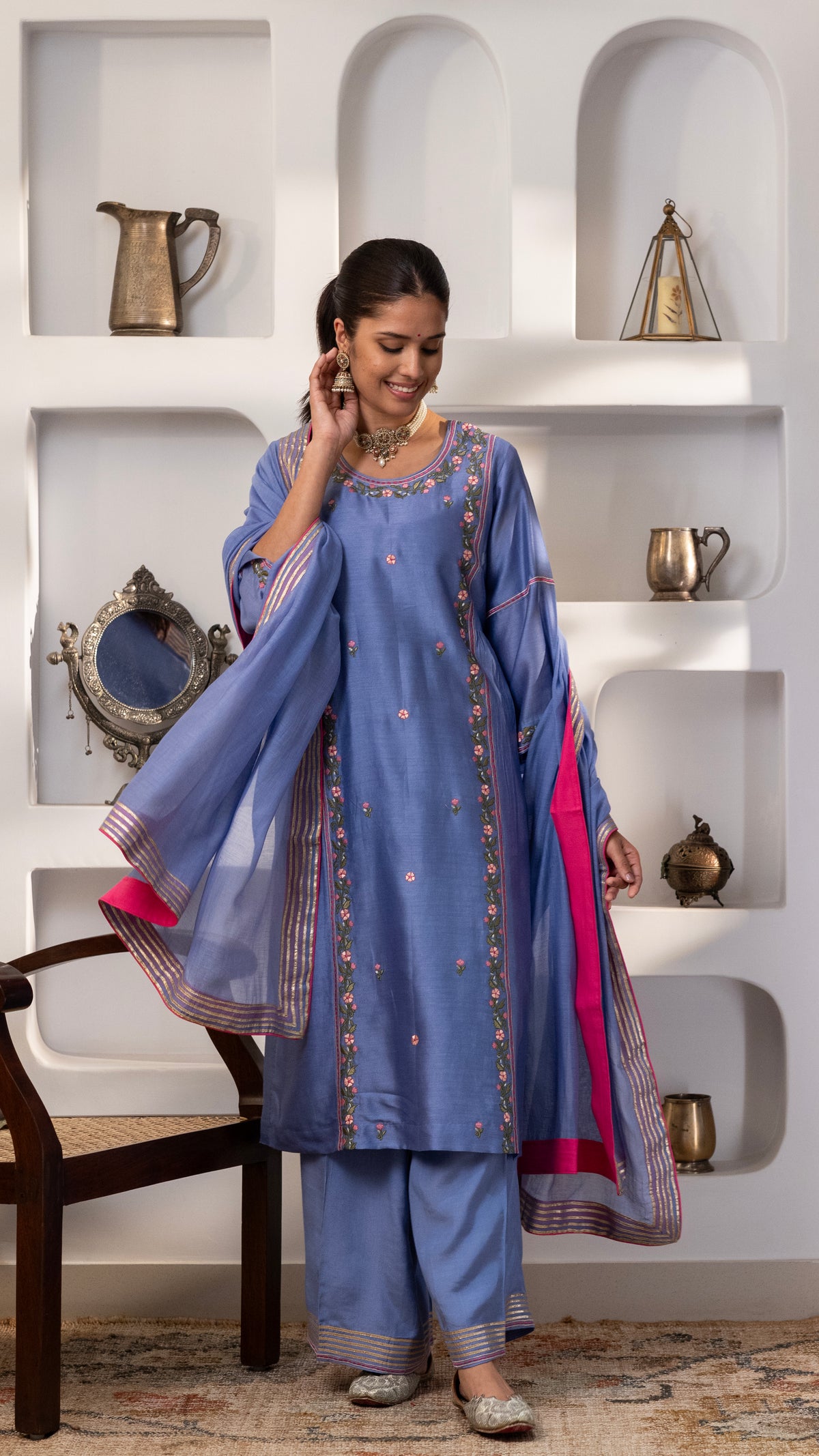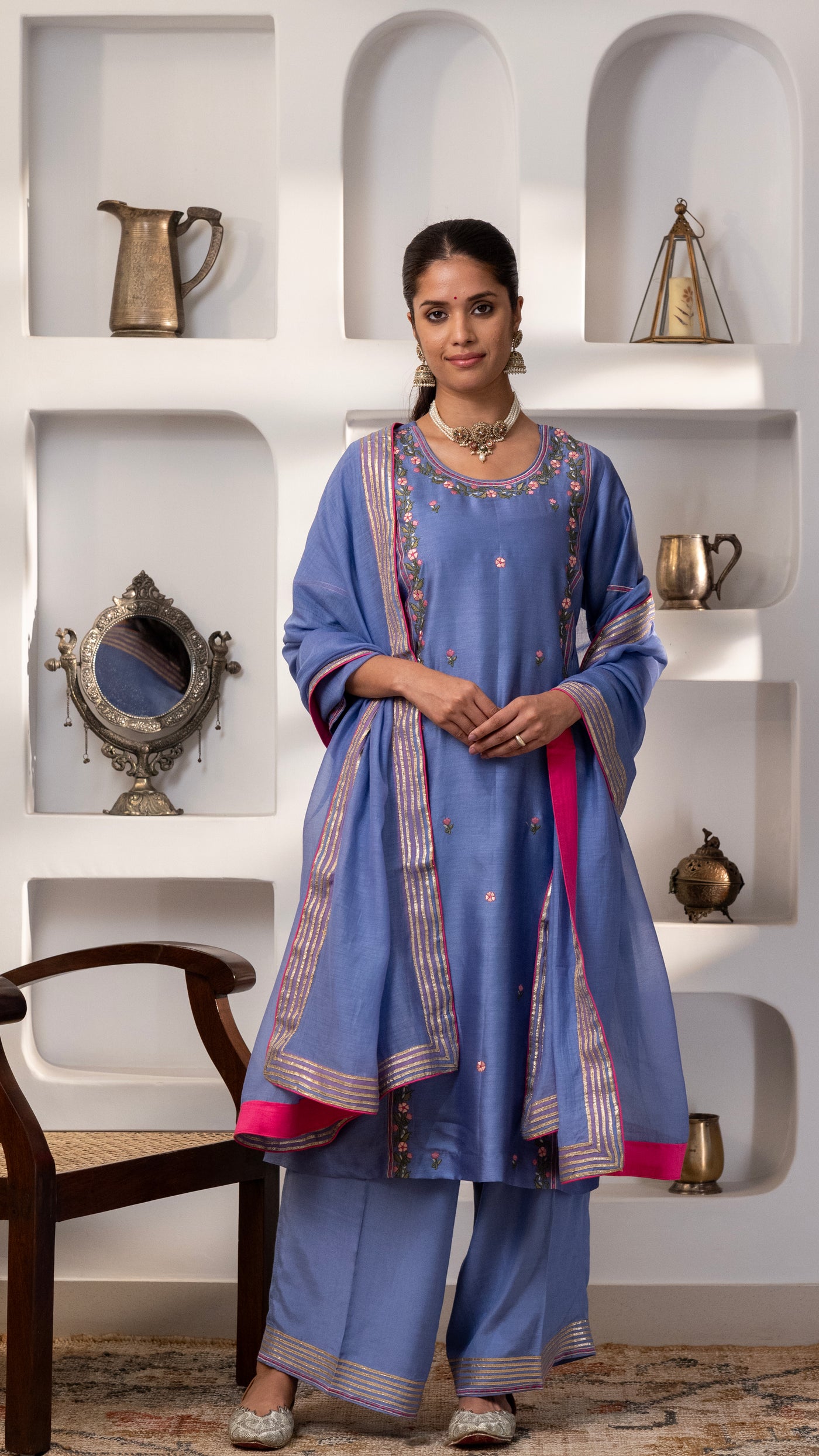 A pure chanderi silk kurta with a burst of floral thread embroidery on the front , sleeves, back us paired with cotton silk pants with embroidery and Gota work. The dupatta is a pure chanderi muslin dupatta with piping, contrast facing and Gota work.