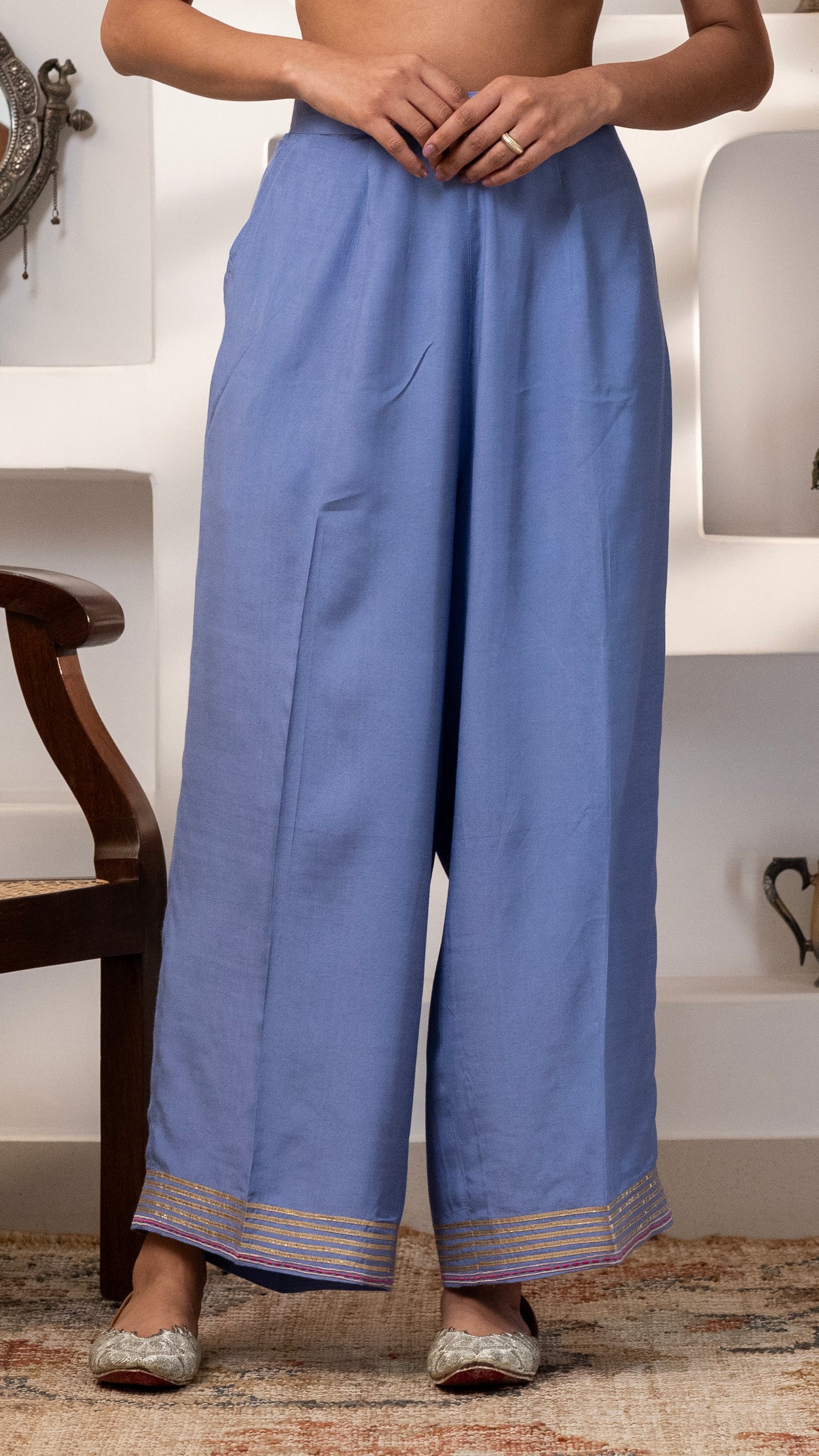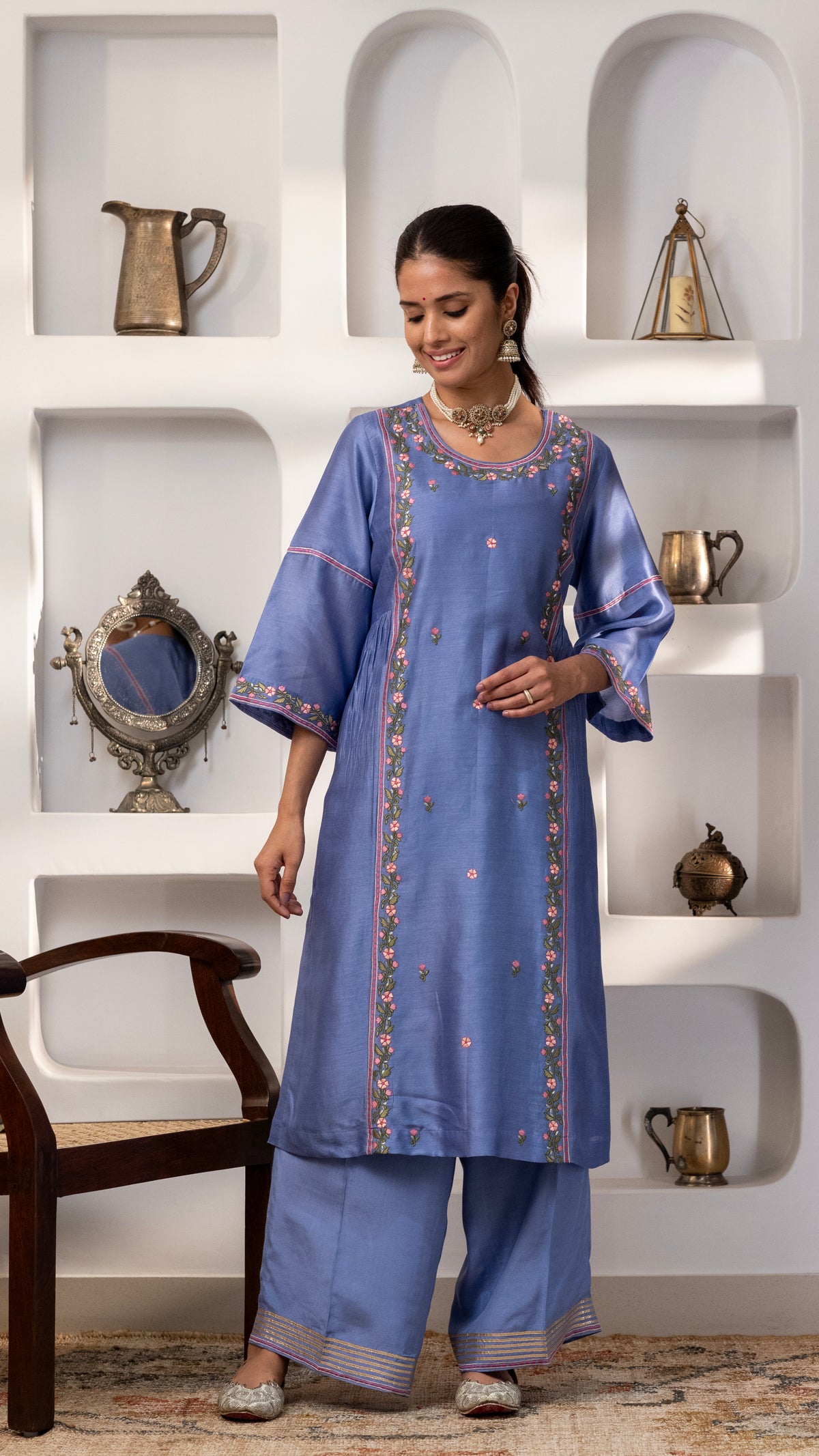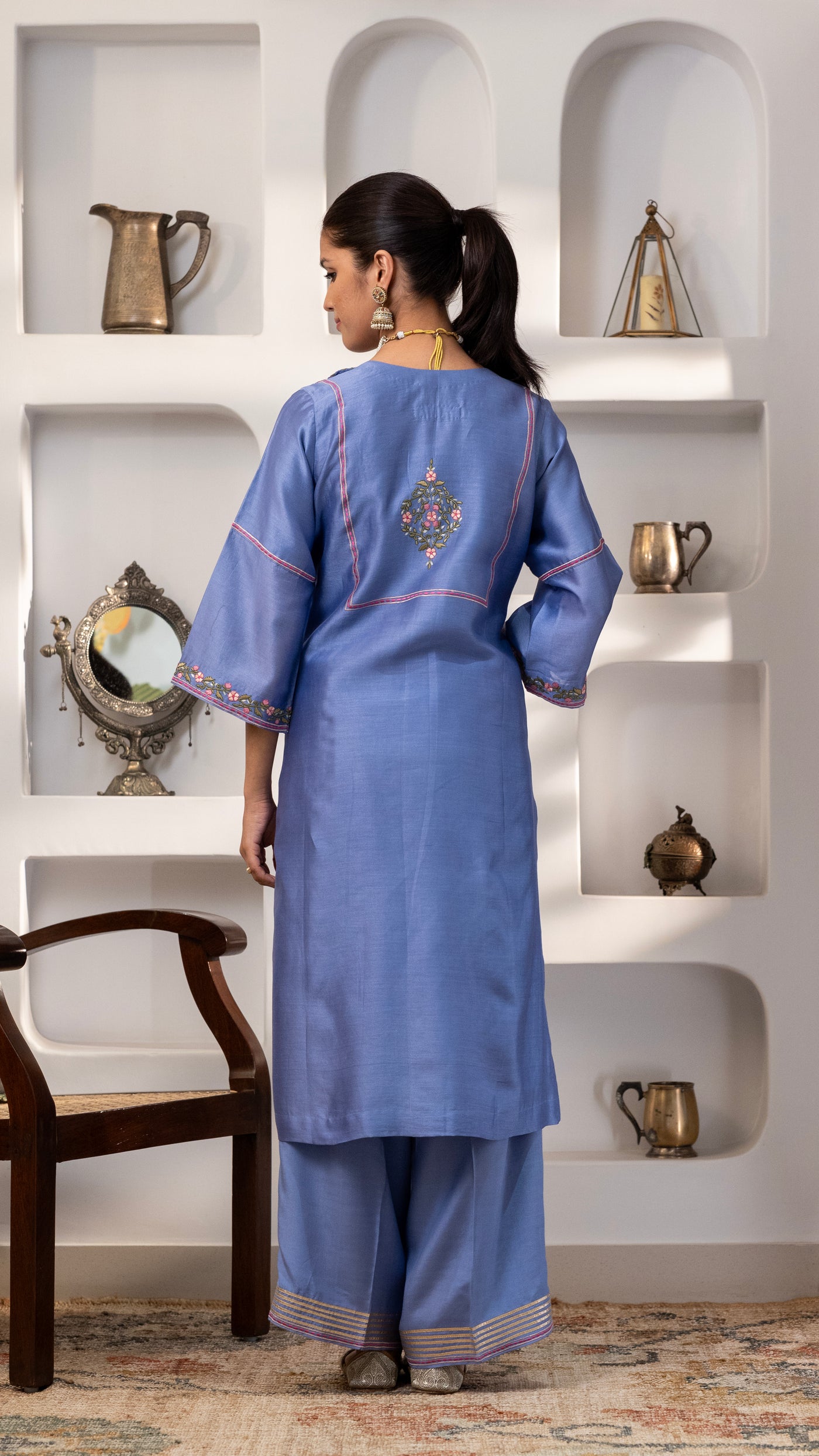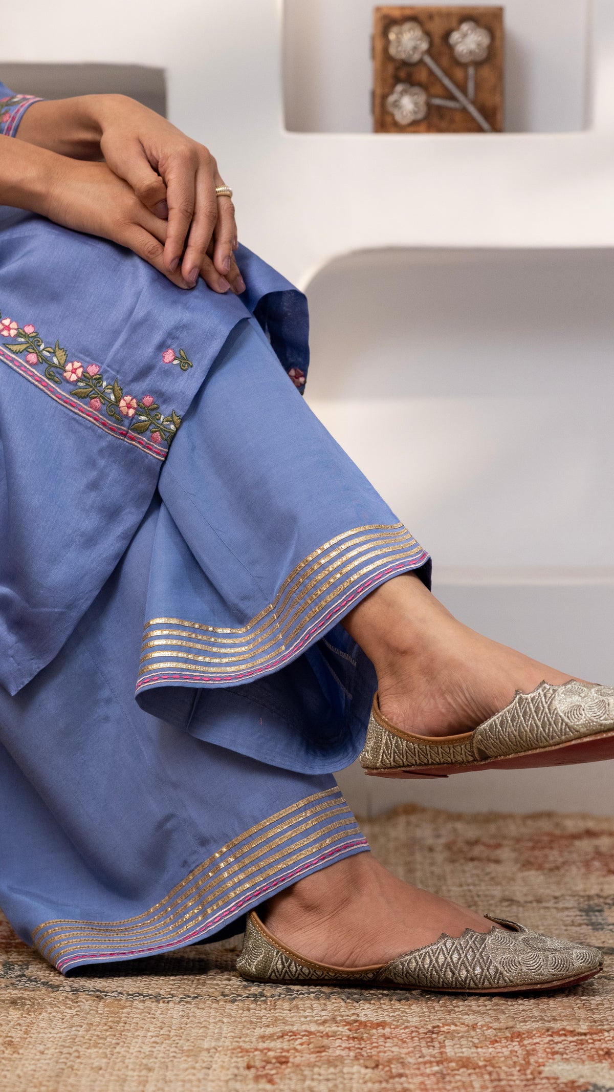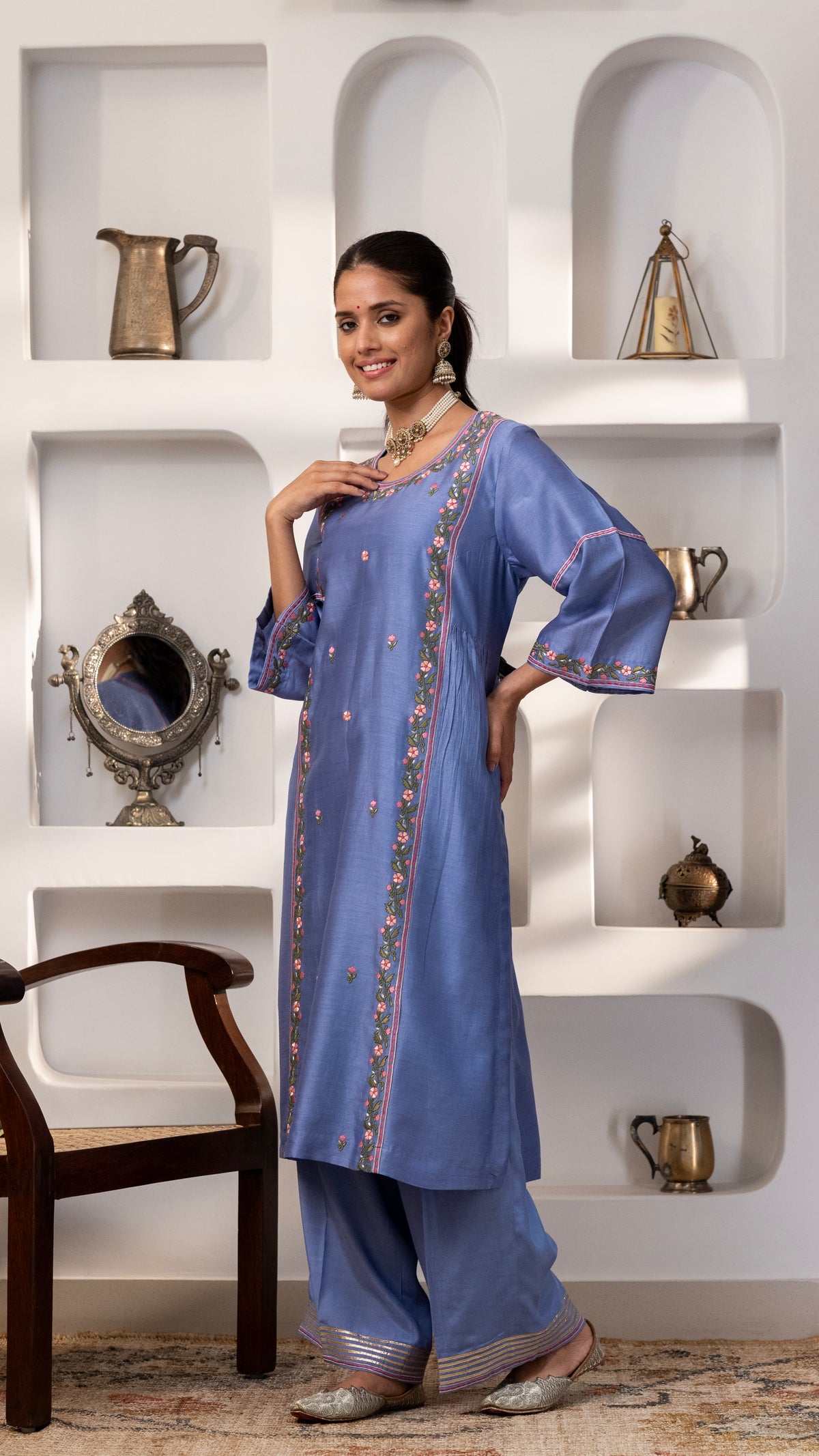 A pure chanderi silk kurta with a burst of floral thread embroidery on the front , sleeves, back us paired with cotton silk pants with embroidery and Gota work. The dupatta is a pure chanderi muslin dupatta with piping, contrast facing and Gota work.