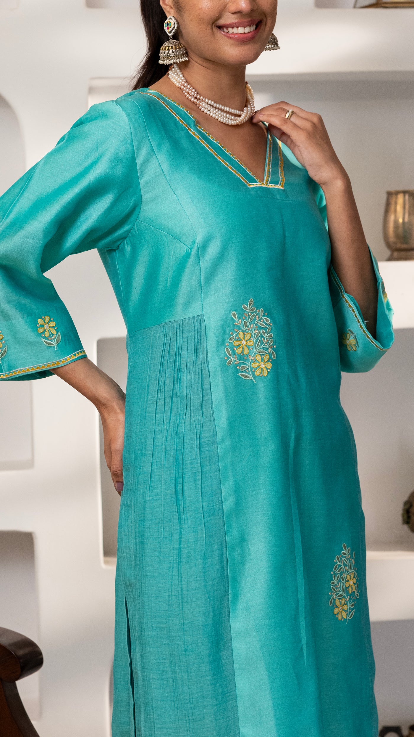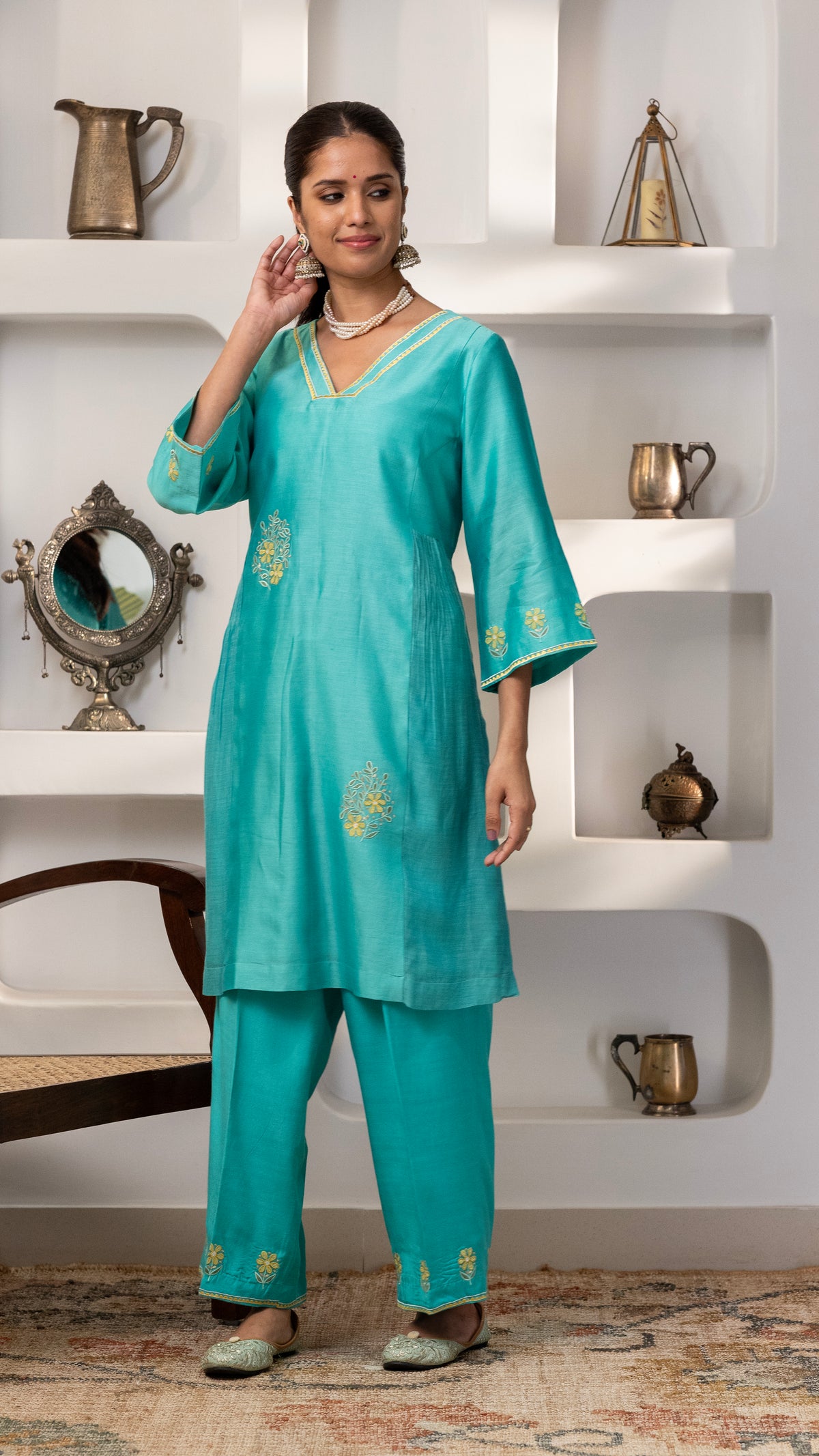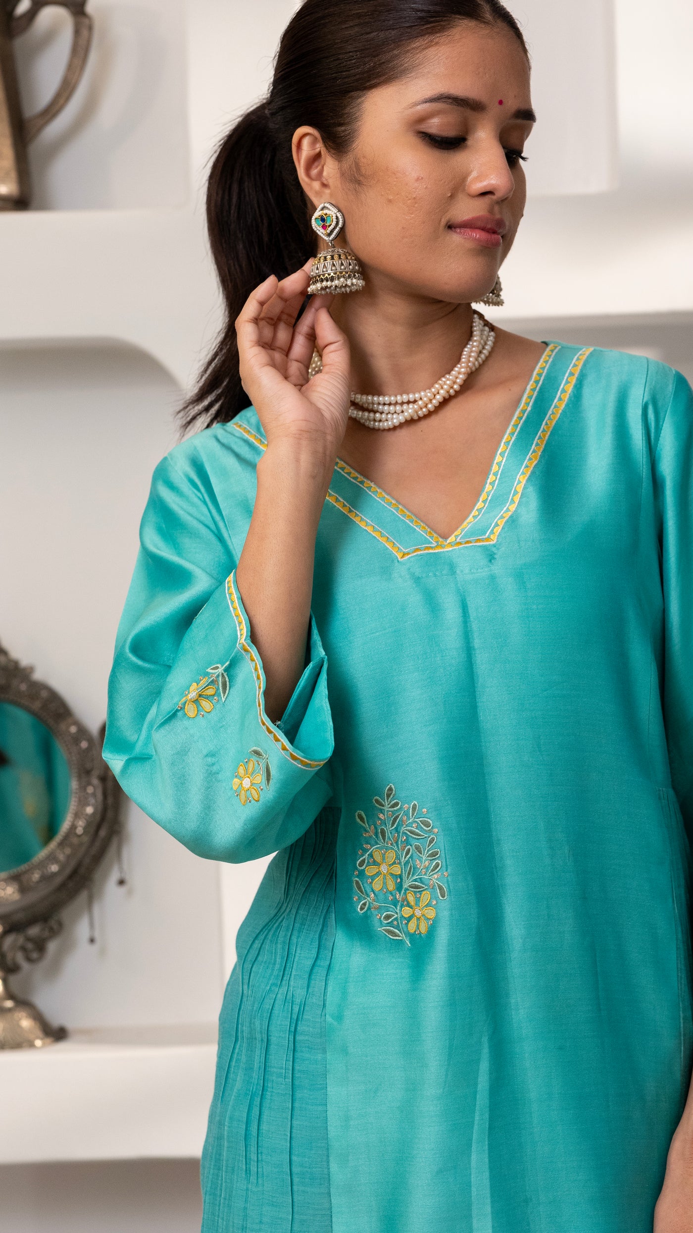 A pure chanderi silk kurta with contrasting applique floral embroidery and delicate thread work detailing is paired with pants with applique embroidery.