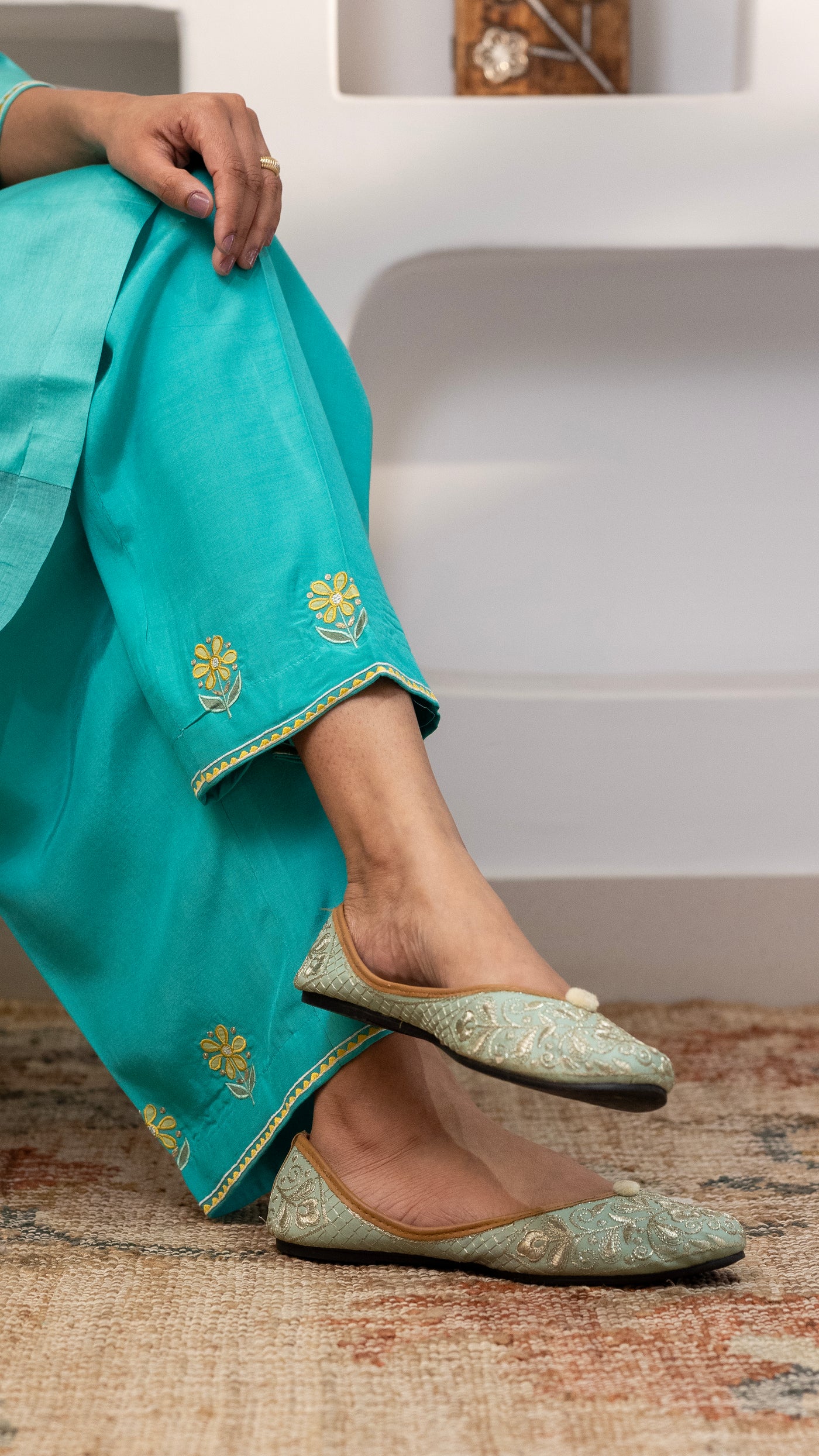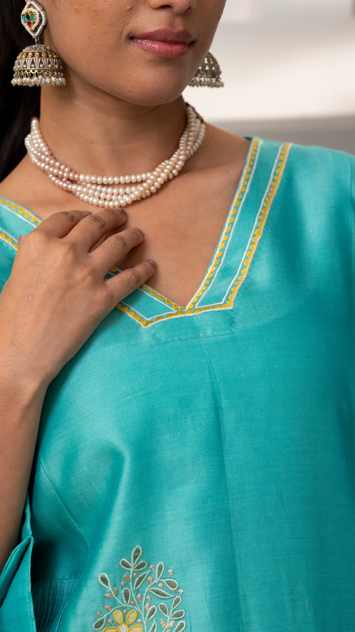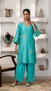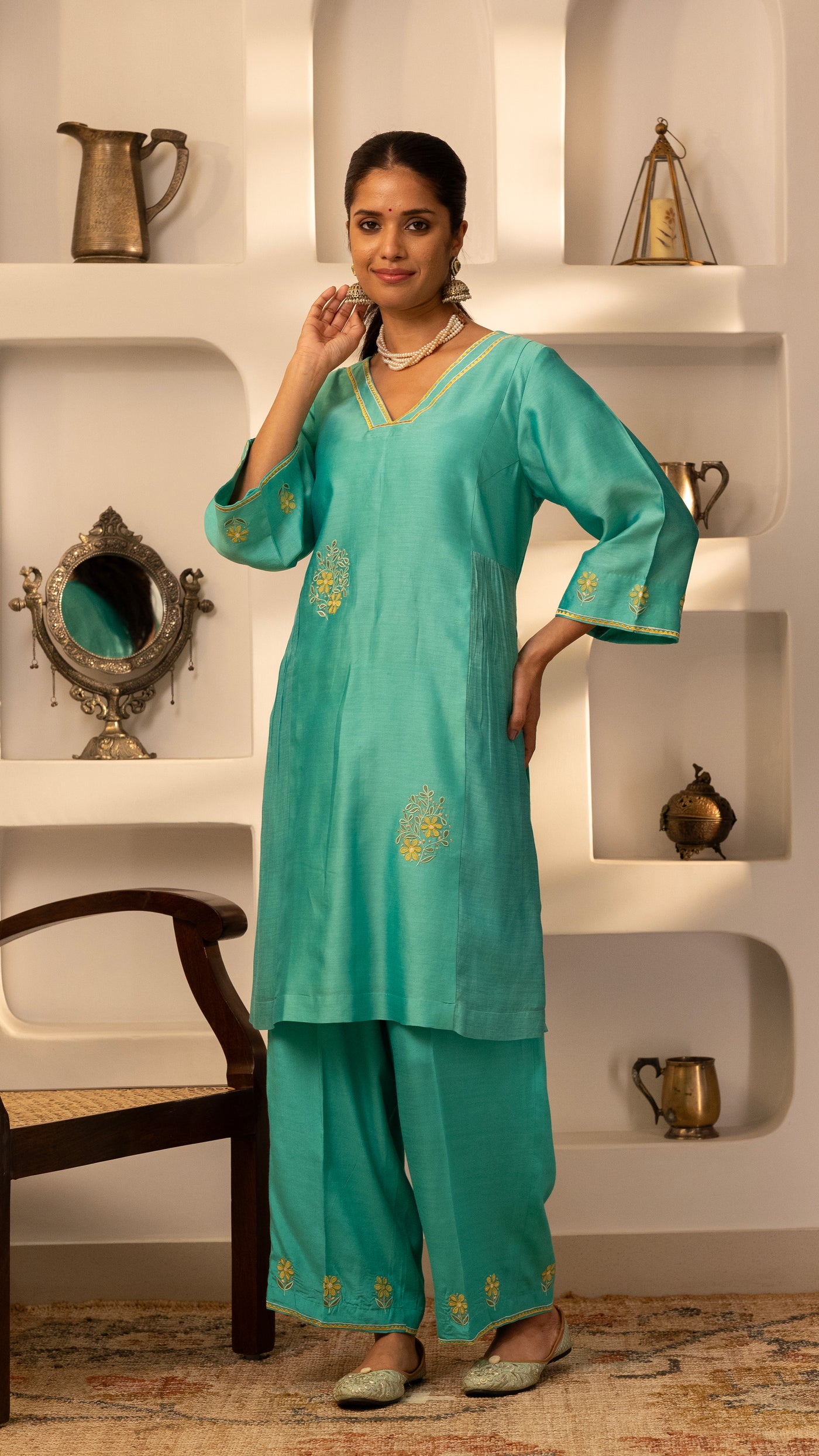 A pure chanderi silk kurta with contrasting applique floral embroidery and delicate thread work detailing is paired with pants with applique embroidery.