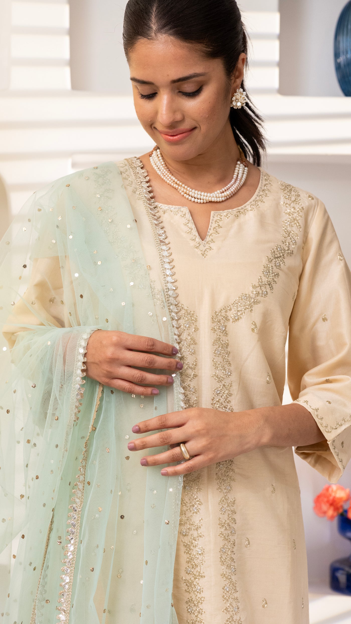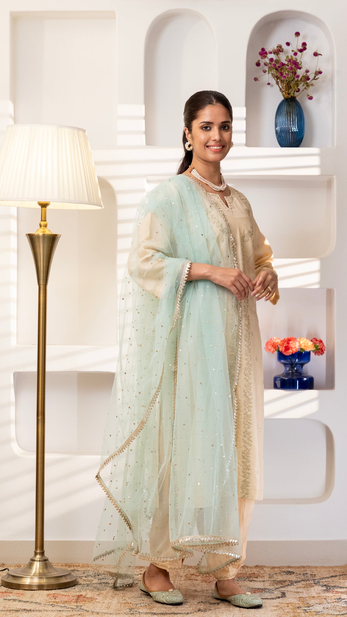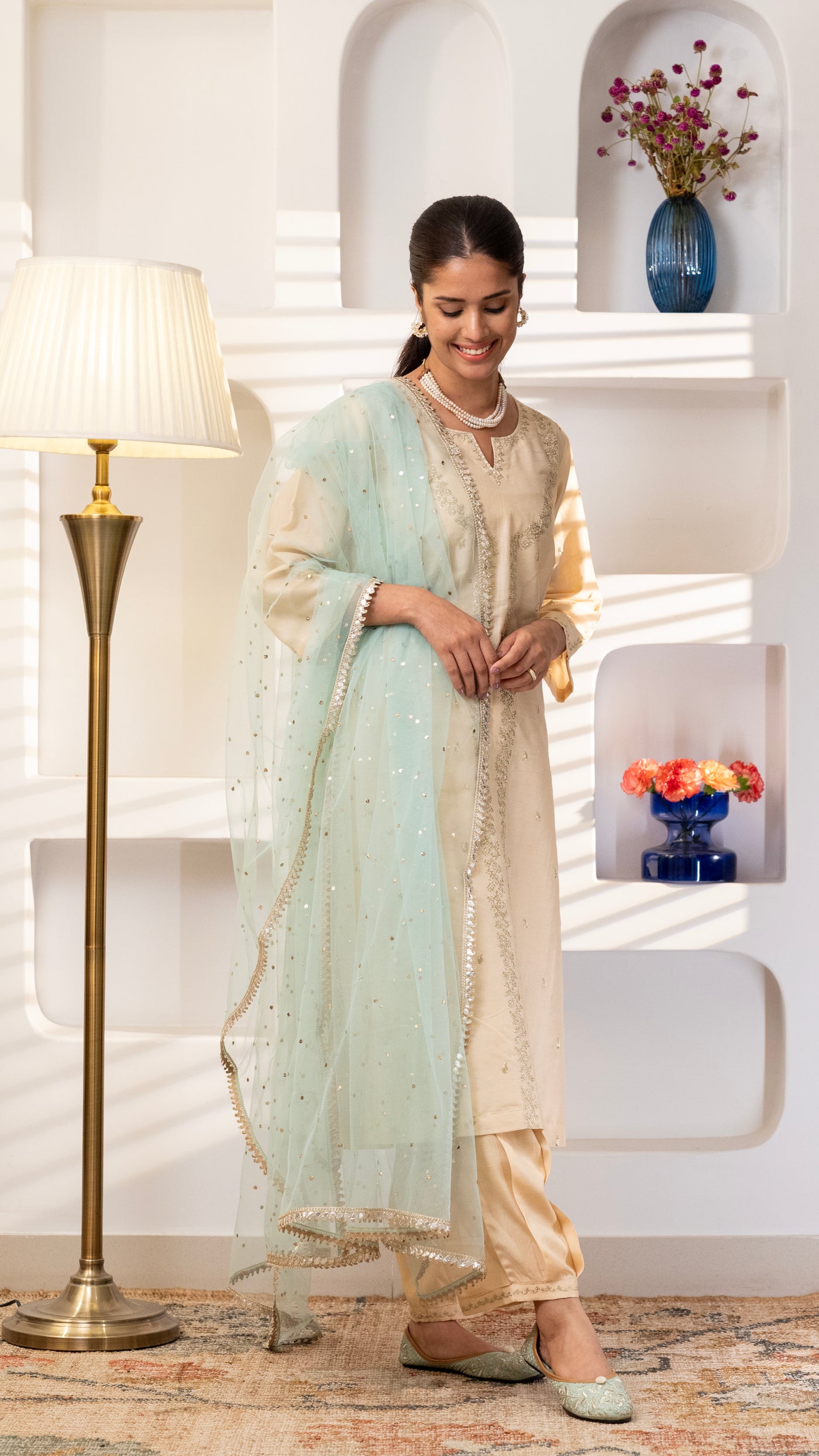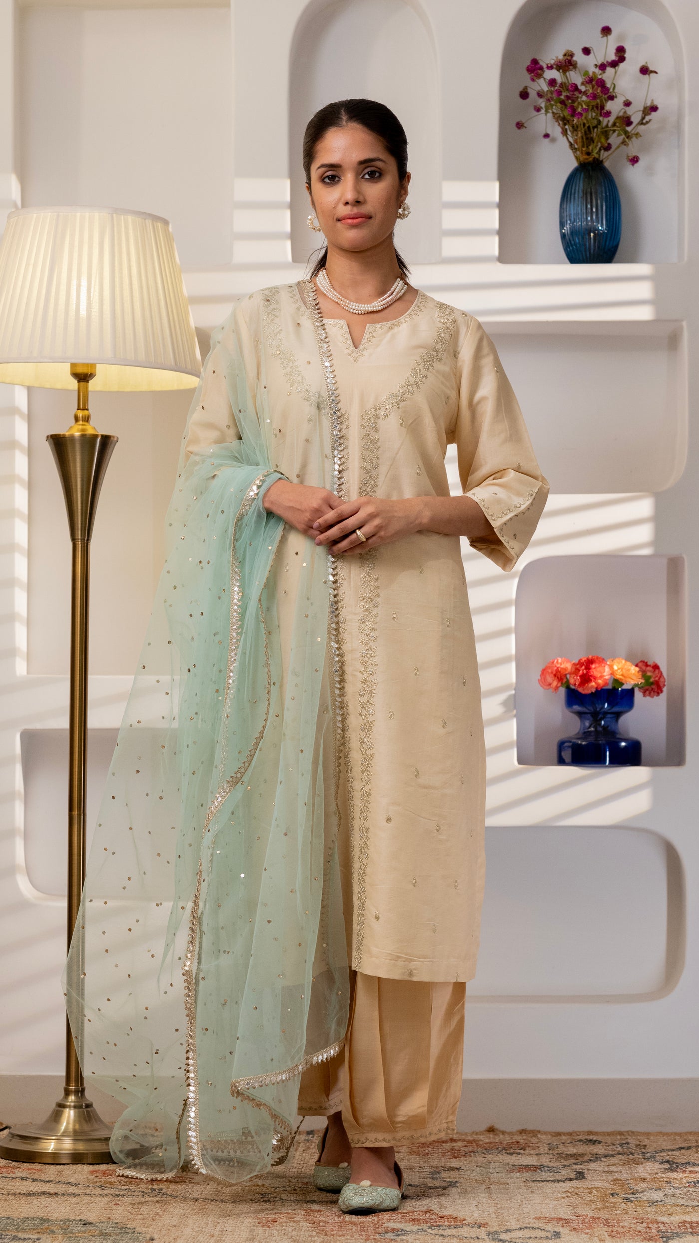 A pure chanderi silk pale peachish kurta with intricate Tilla embroidery is paired with cotton silk pants with embroidery. Dupatta is a contrasting pale green net with Mukesh and lace on 4 sides