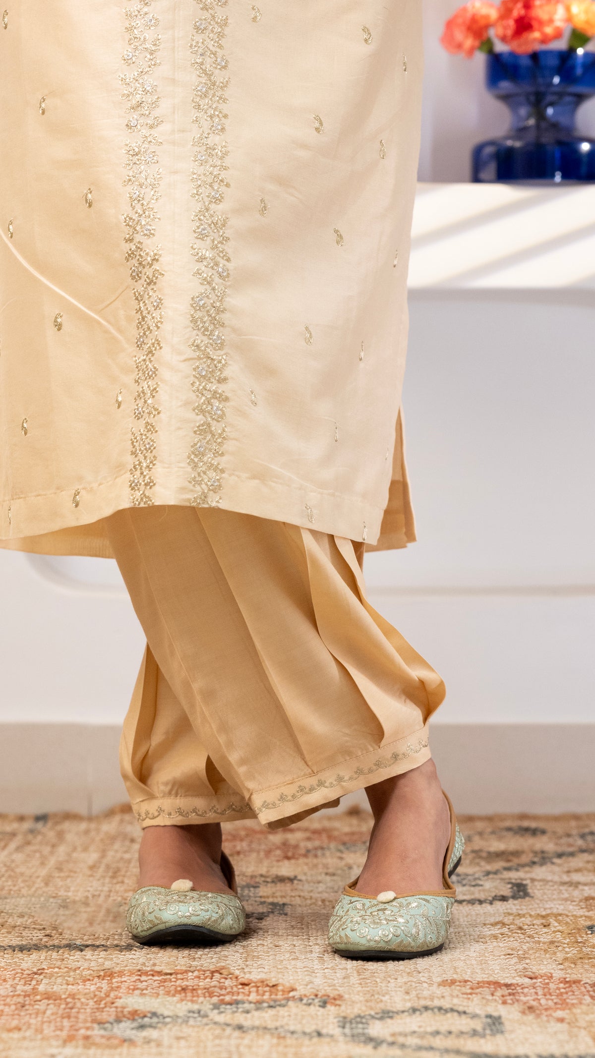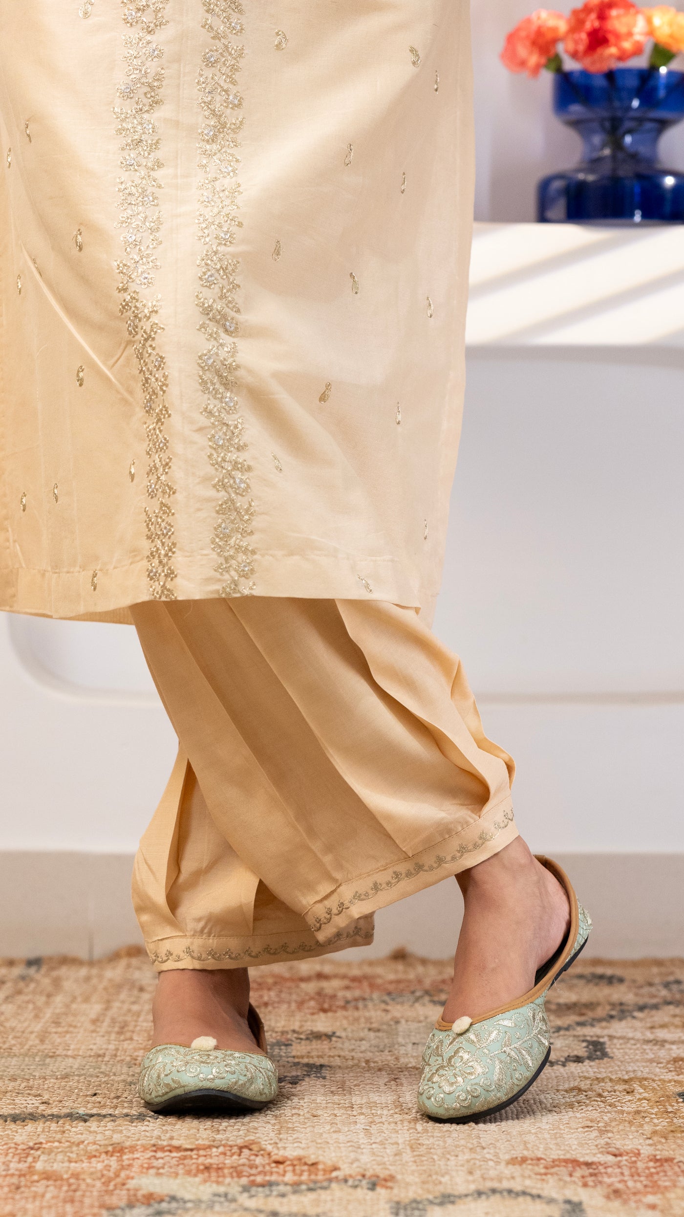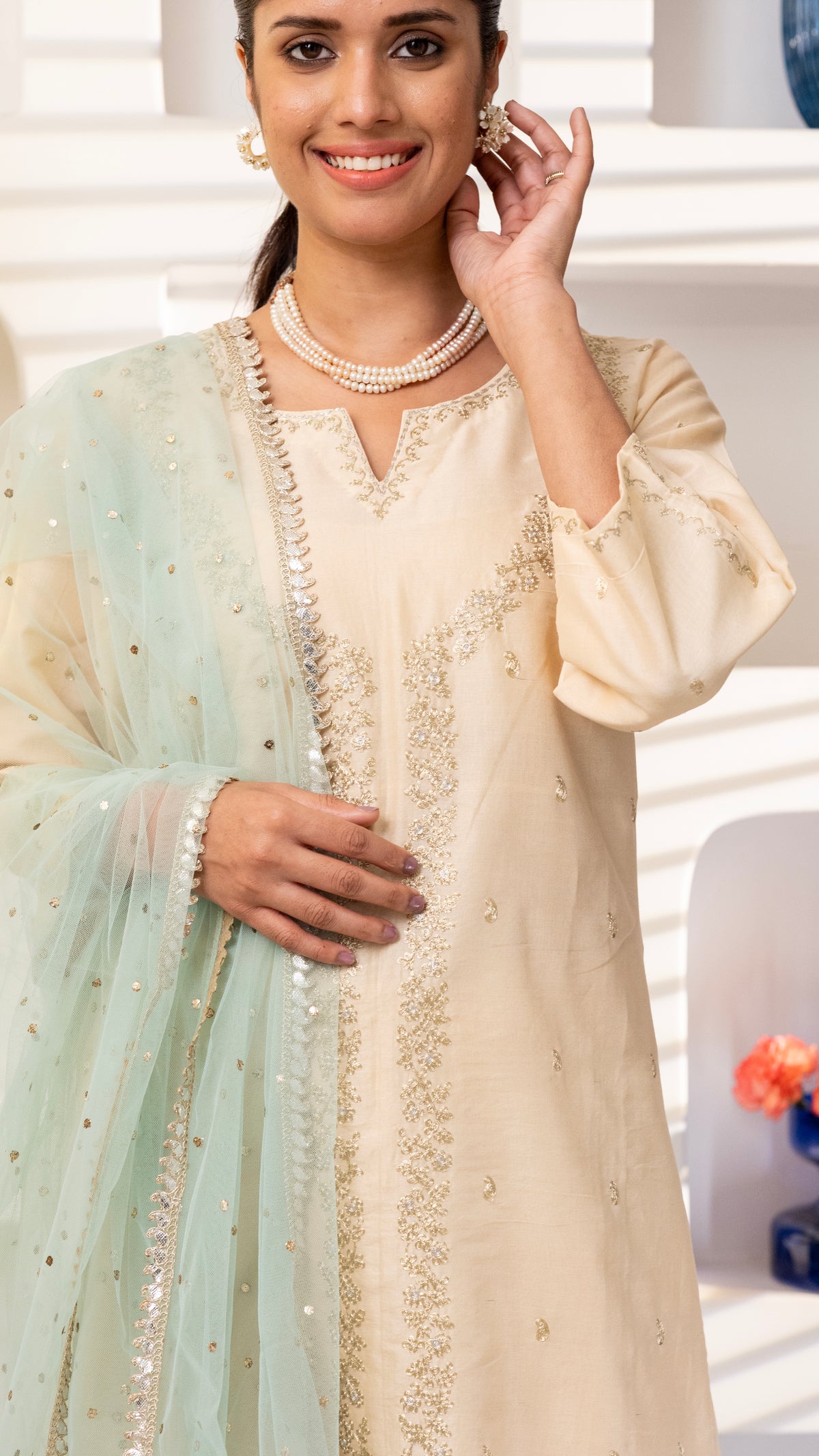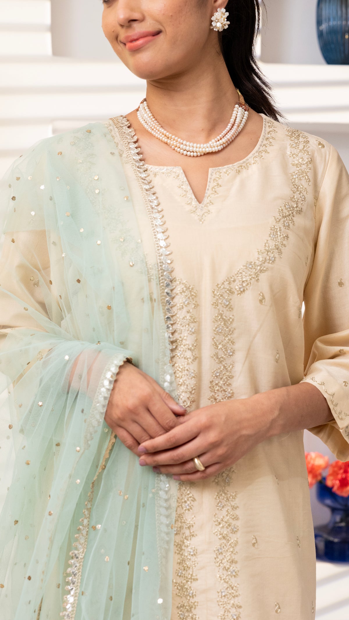 A pure chanderi silk pale peachish kurta with intricate Tilla embroidery is paired with cotton silk pants with embroidery. Dupatta is a contrasting pale green net with Mukesh and lace on 4 sides