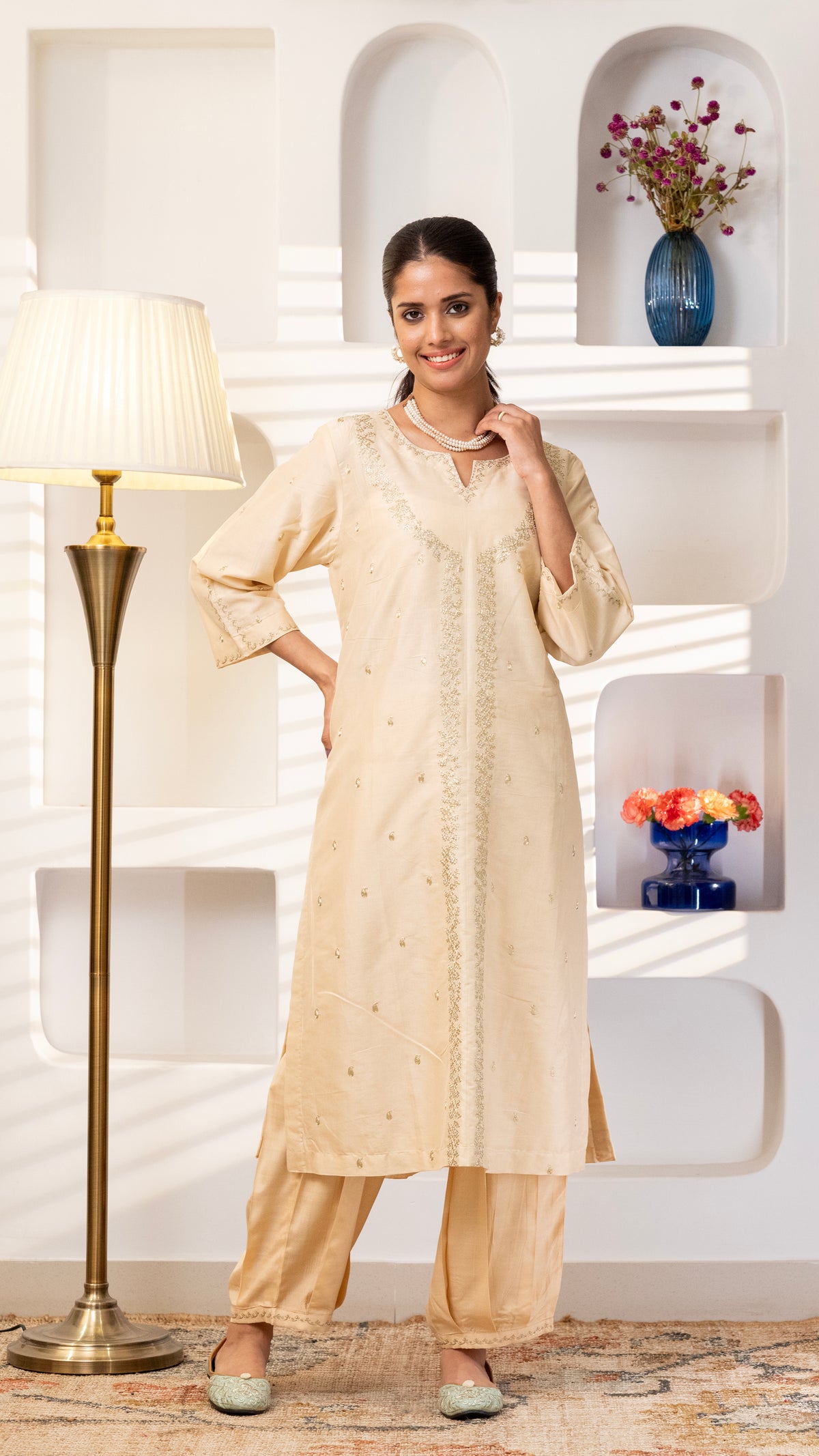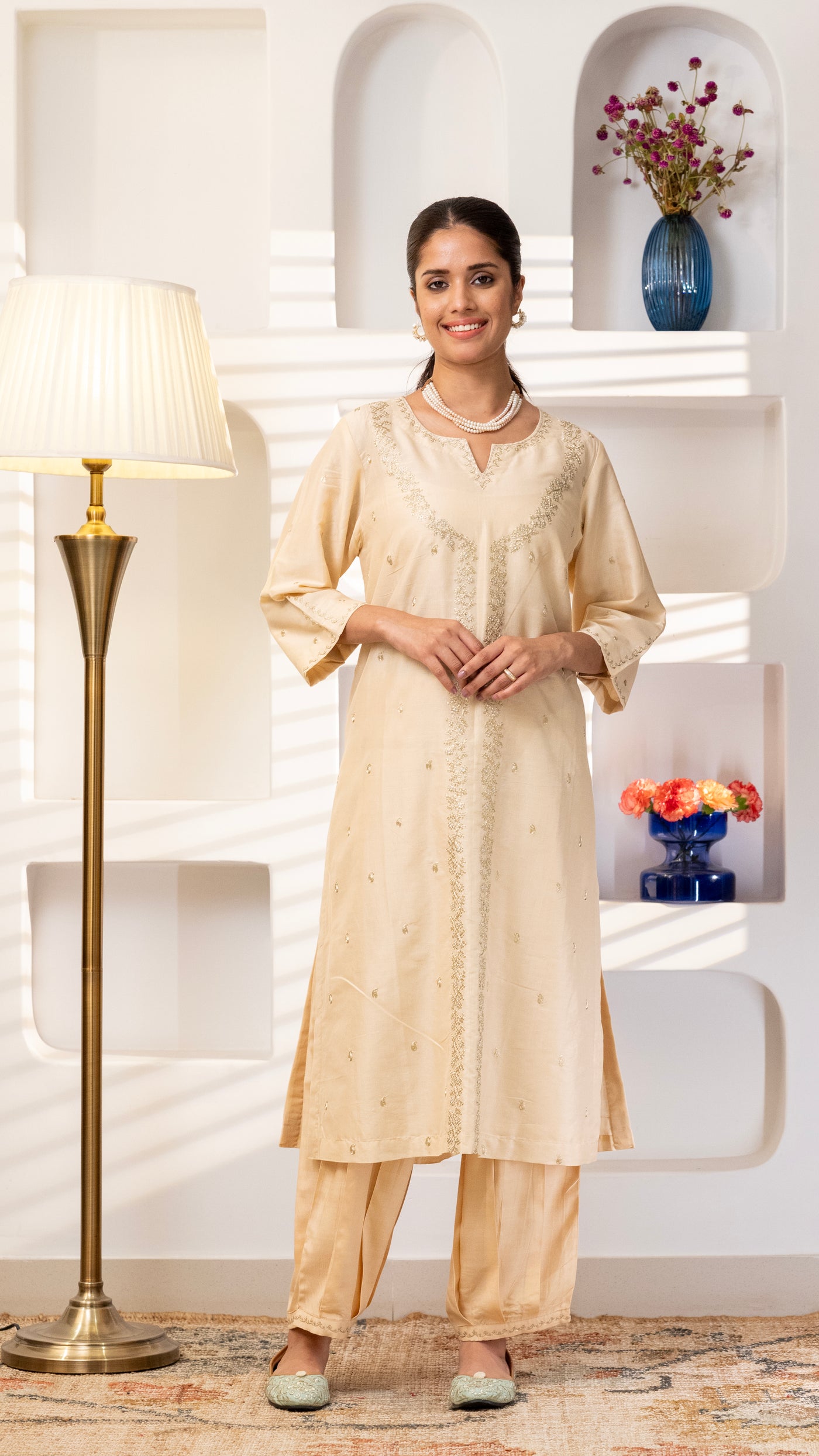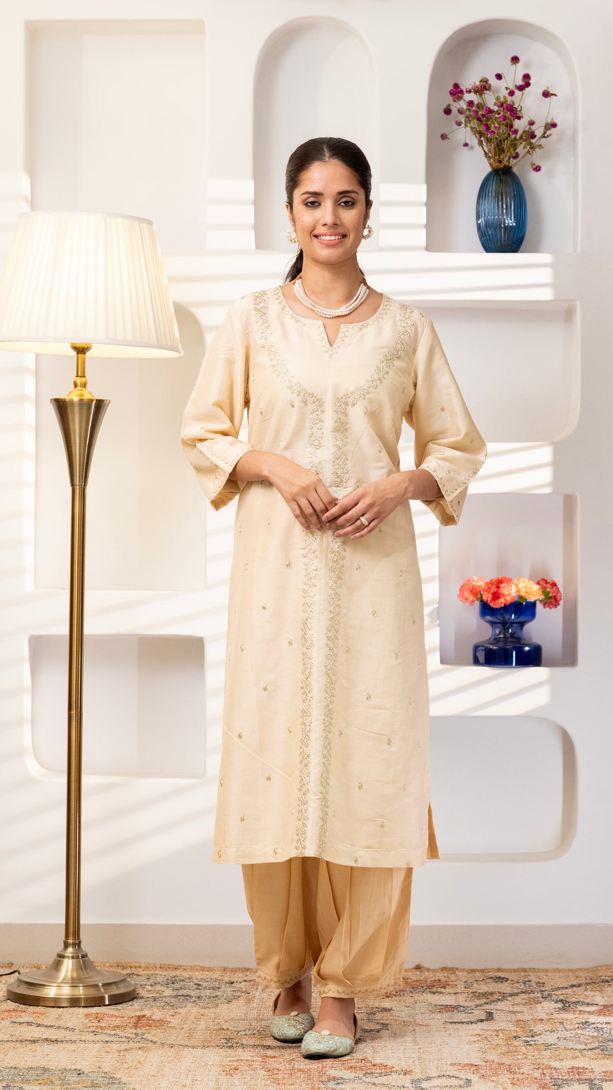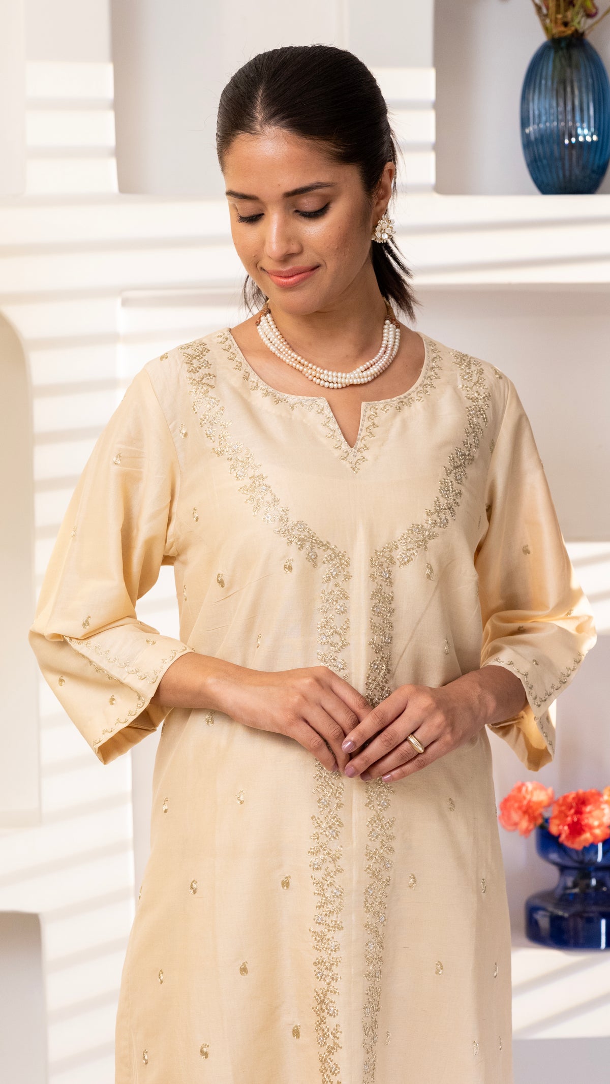A pure chanderi silk pale peachish kurta with intricate Tilla embroidery is paired with cotton silk pants with embroidery. Dupatta is a contrasting pale green net with Mukesh and lace on 4 sides