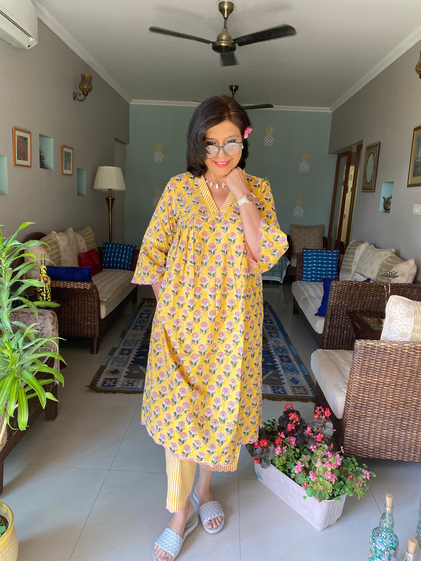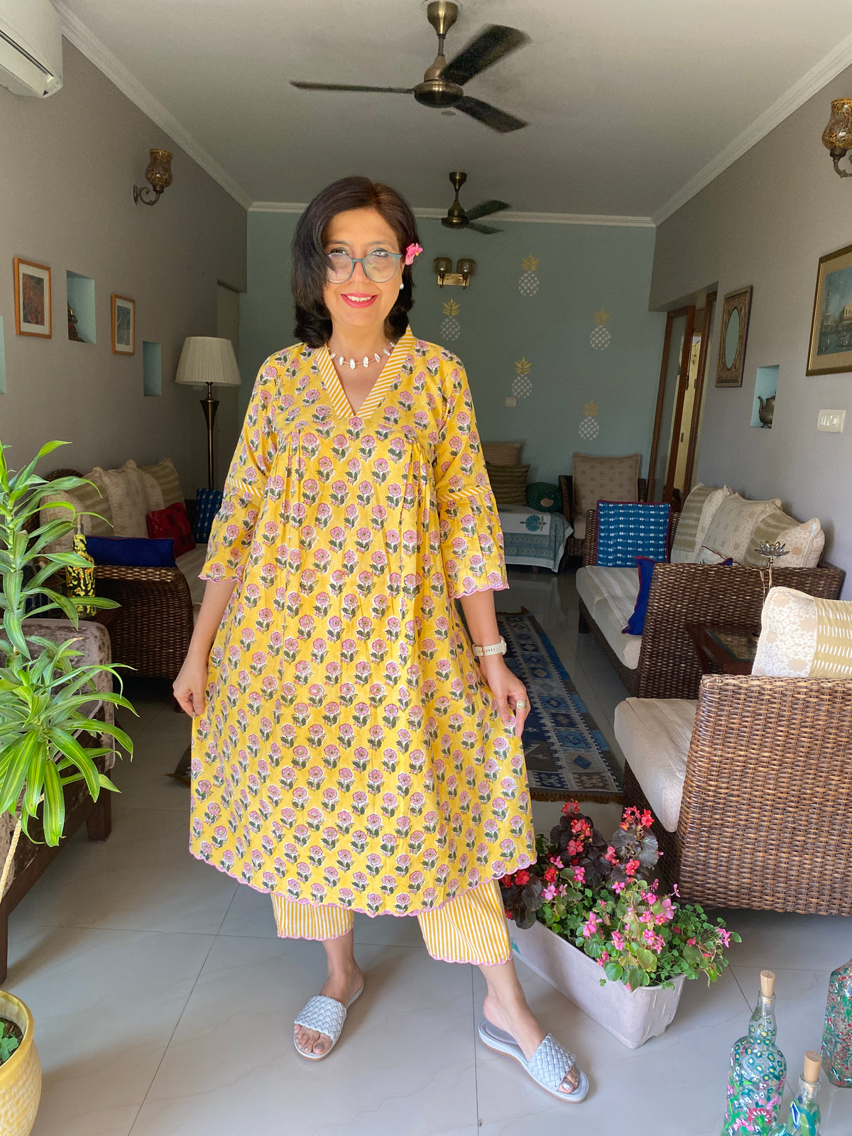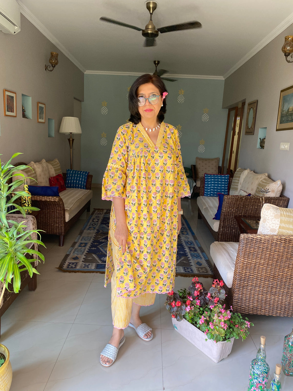 A soft pure cotton Handblockprinted Co ord set with floral print kurta with scallop edgings on the sleeves and ghera and bottom, with pleating detailing.