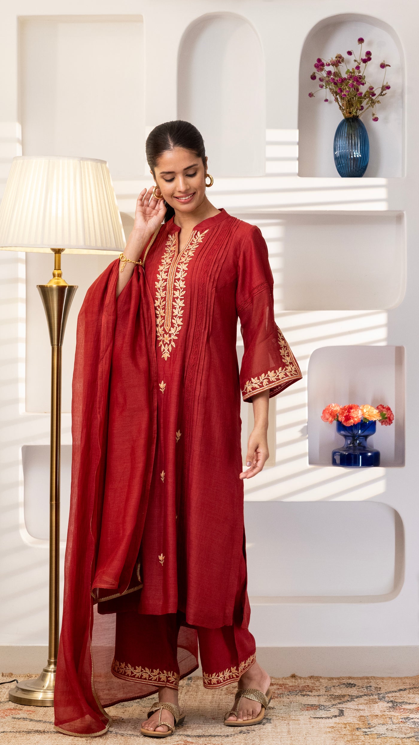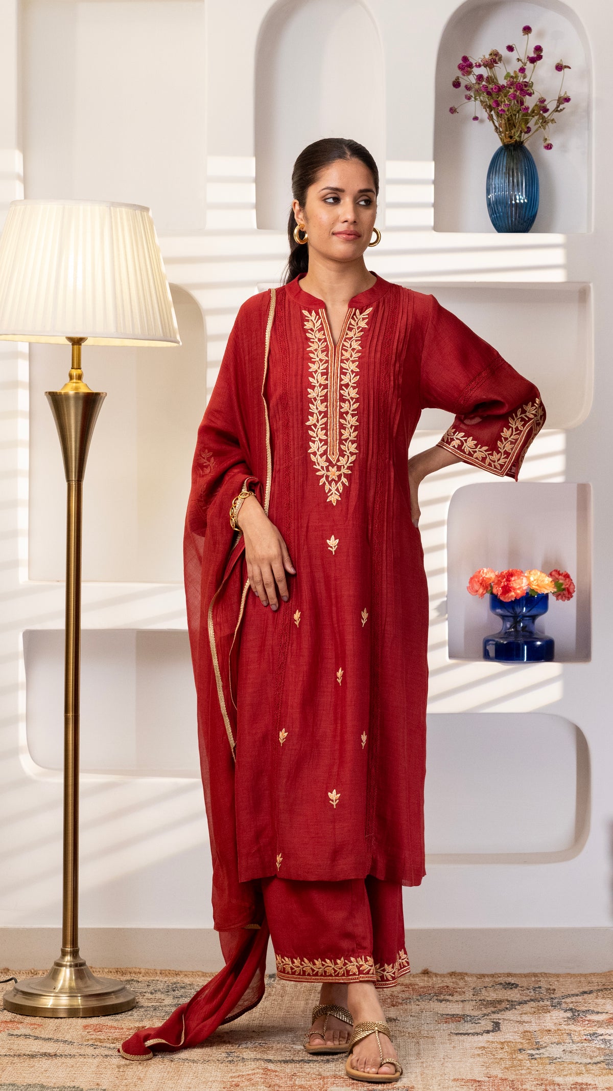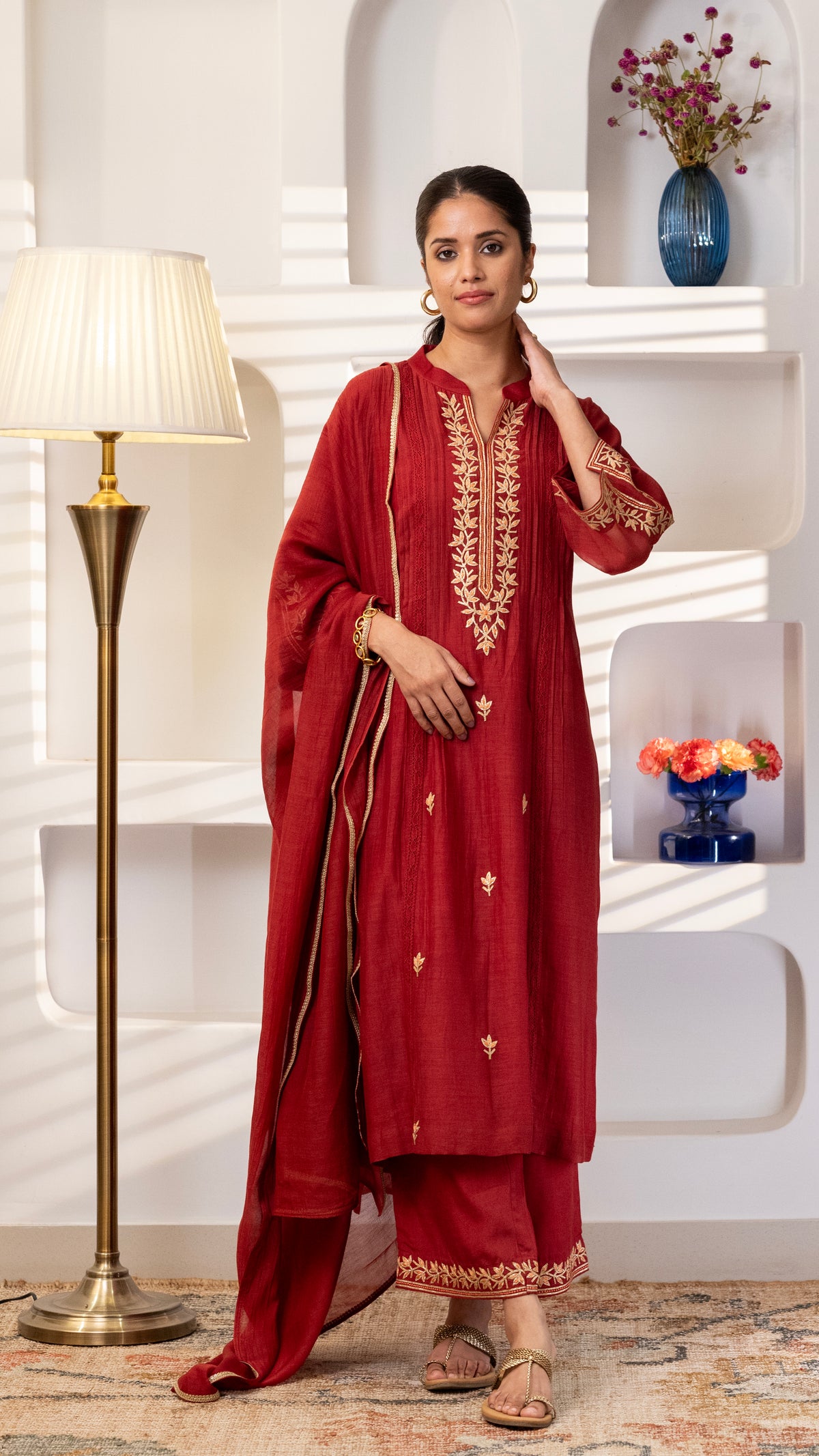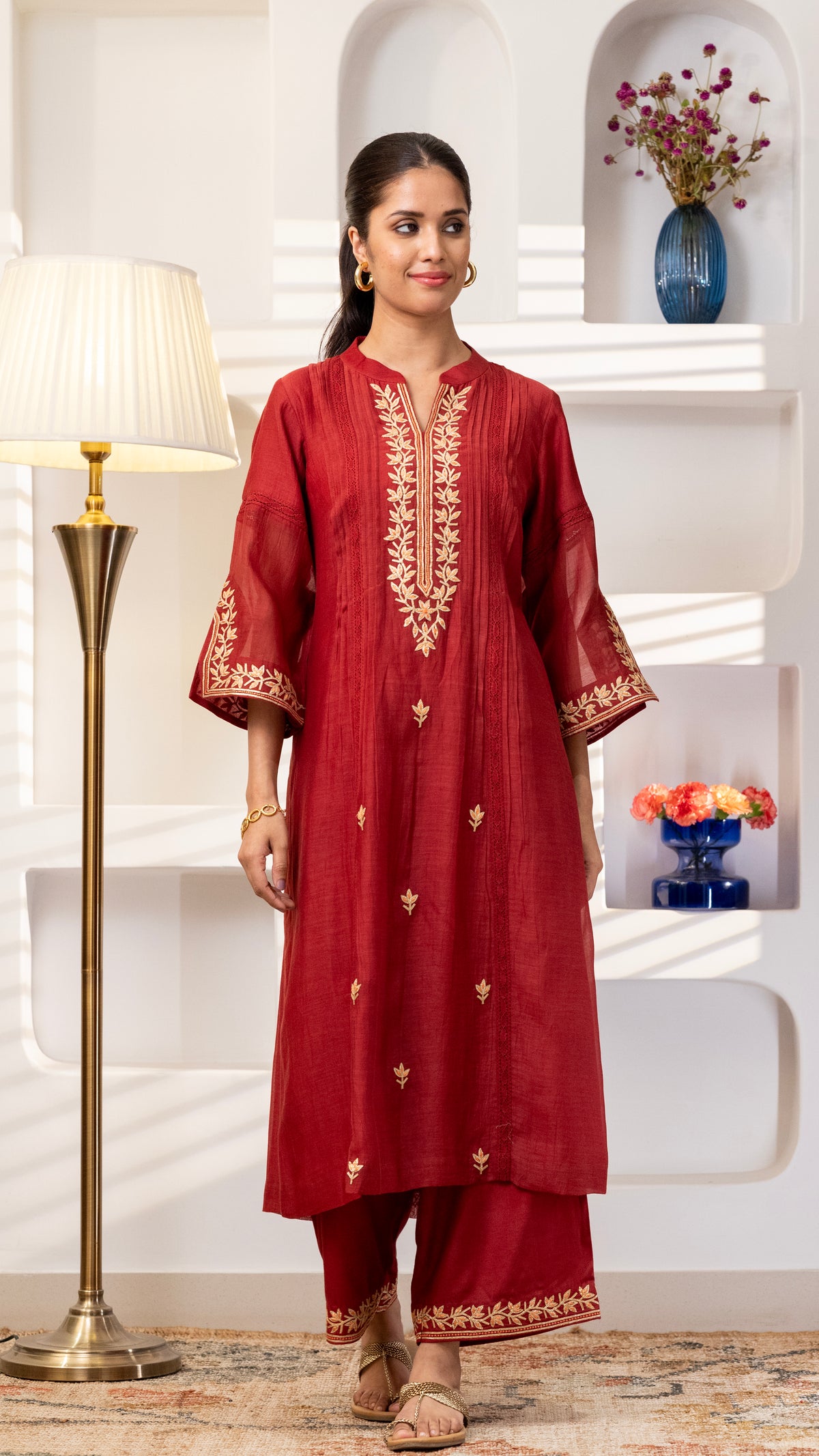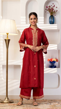 A pure chanderi silk kurta with beautiful jaali lace , floral thread and Gota embroidery bel and bootis is paired with pants with embroidery. The dupatta is in pure chanderi muslin with gold lace all 4 sides .
