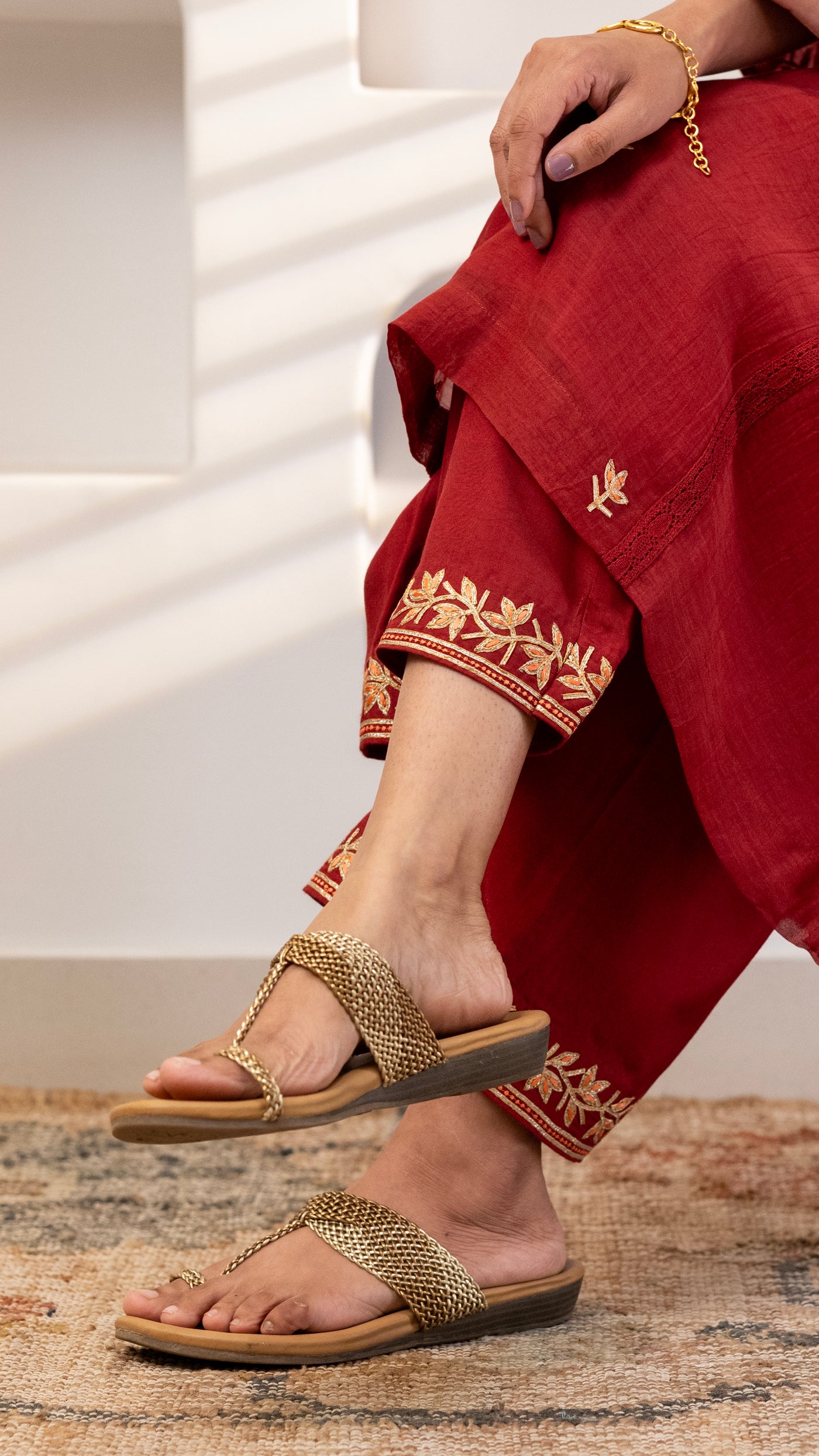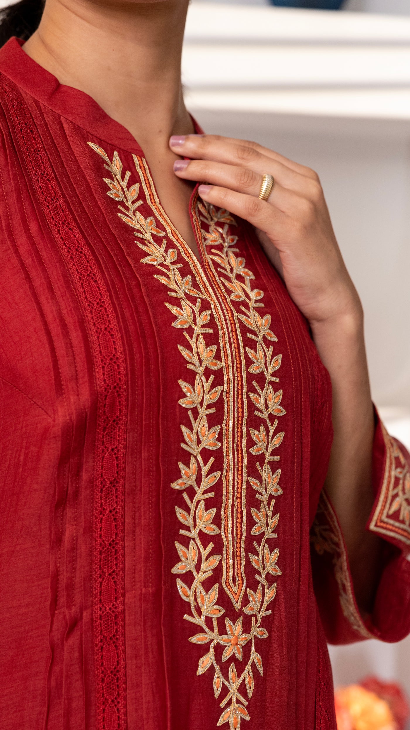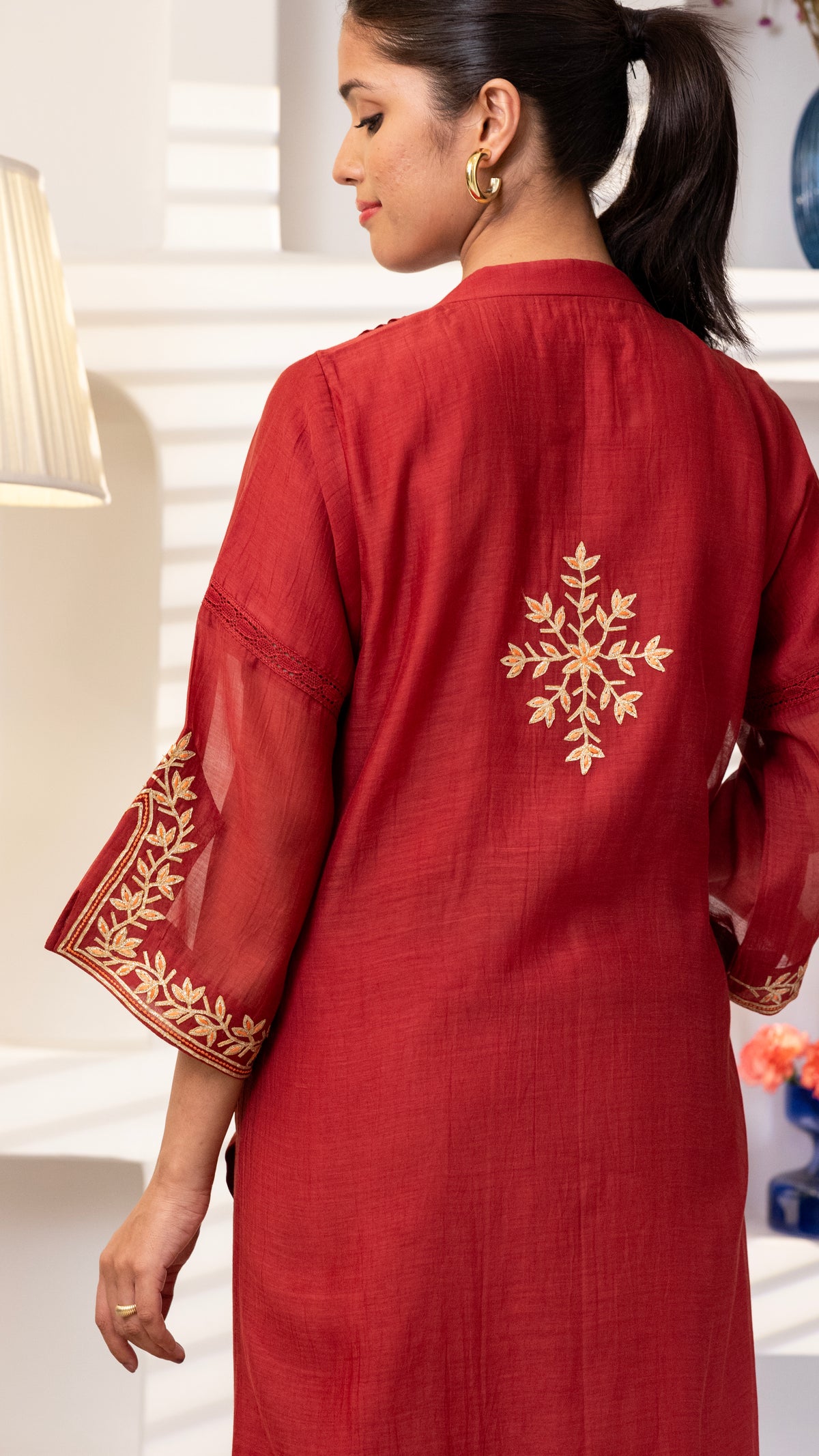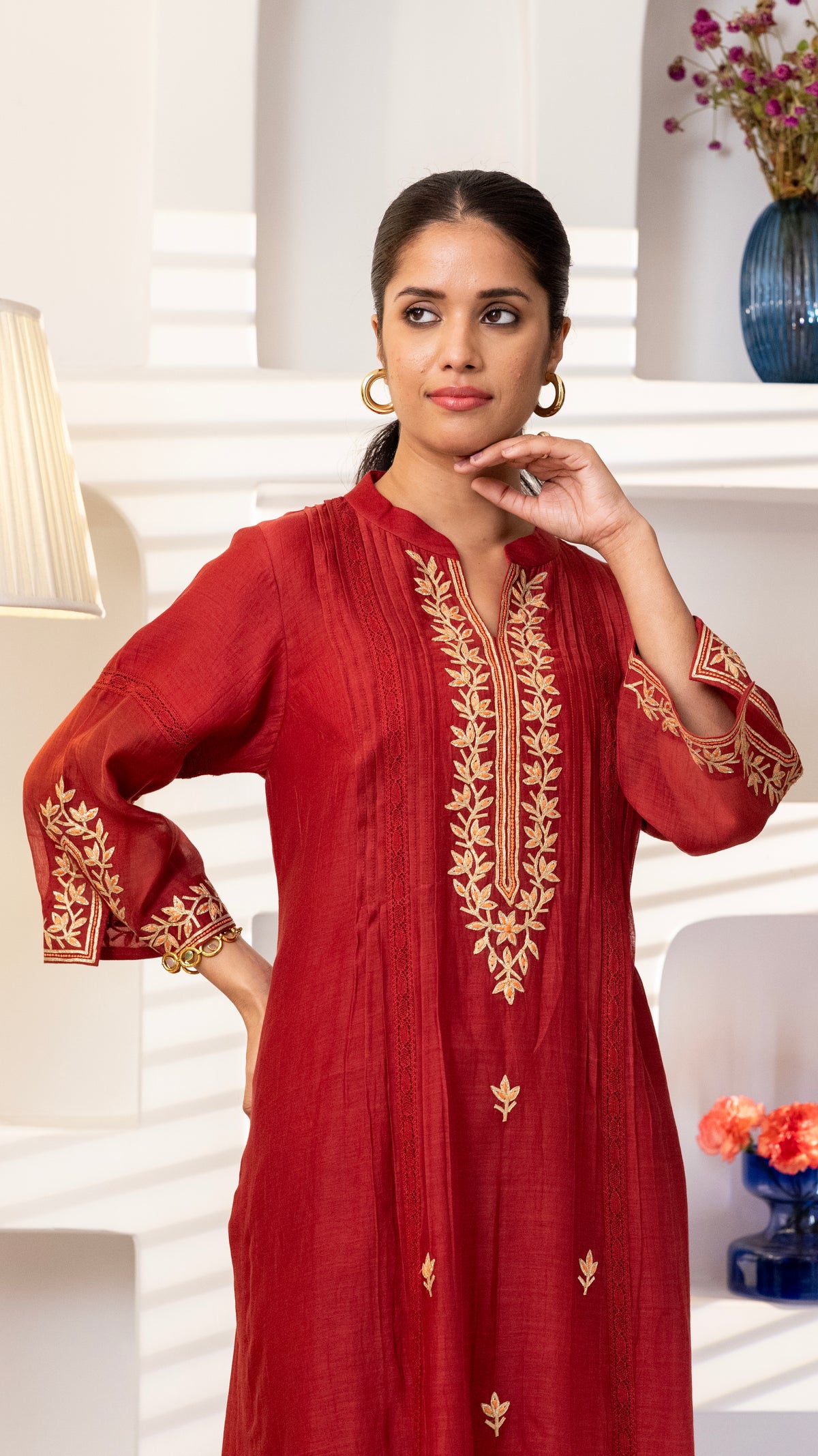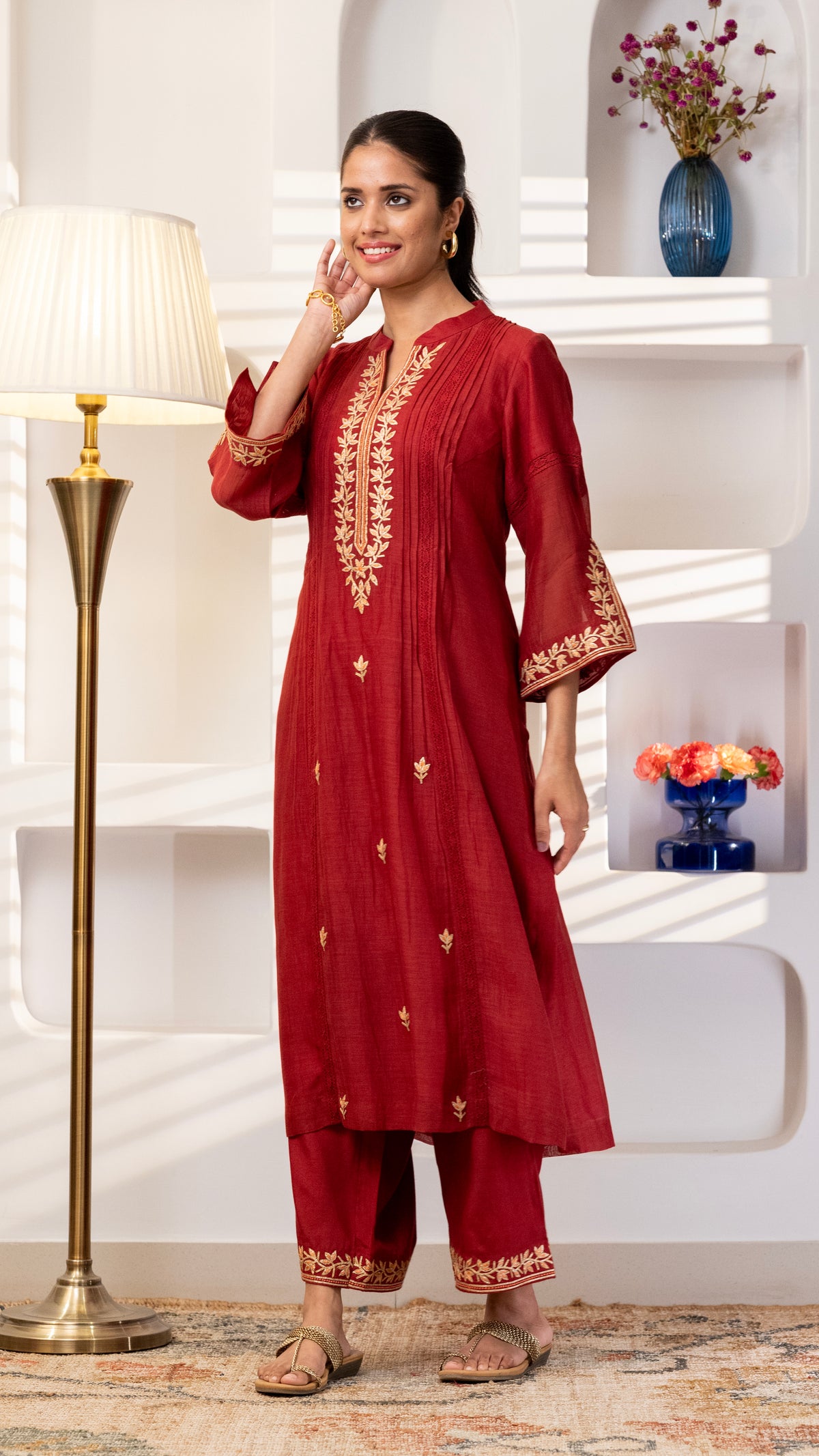 A pure chanderi silk kurta with beautiful jaali lace , floral thread and Gota embroidery bel and bootis is paired with pants with embroidery. The dupatta is in pure chanderi muslin with gold lace all 4 sides .