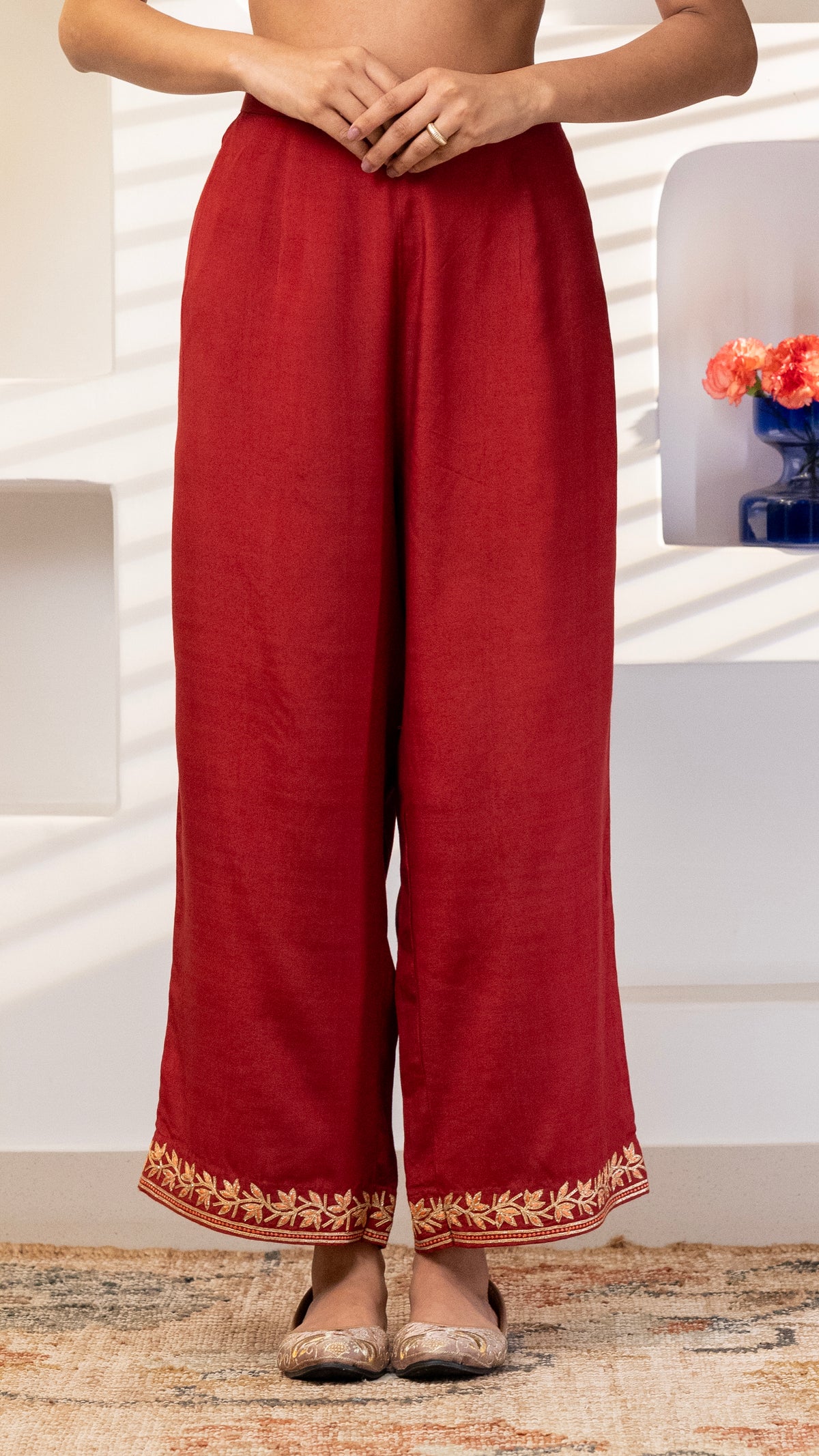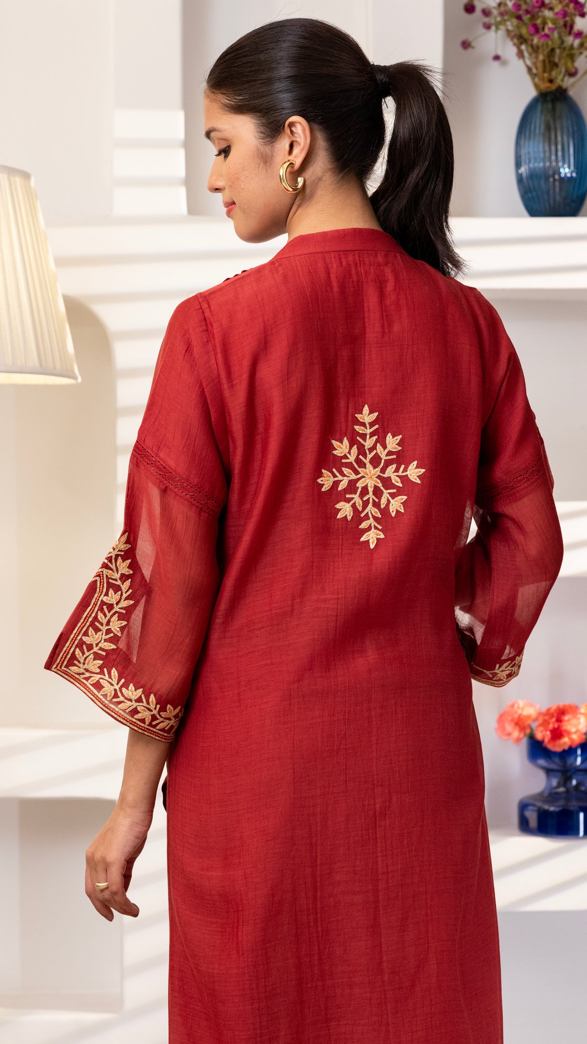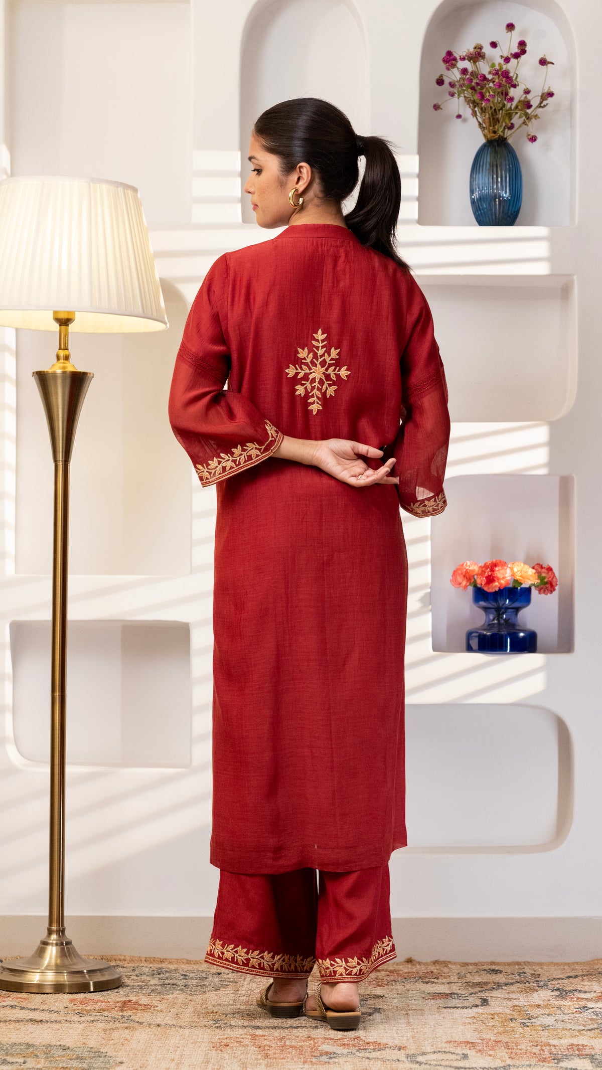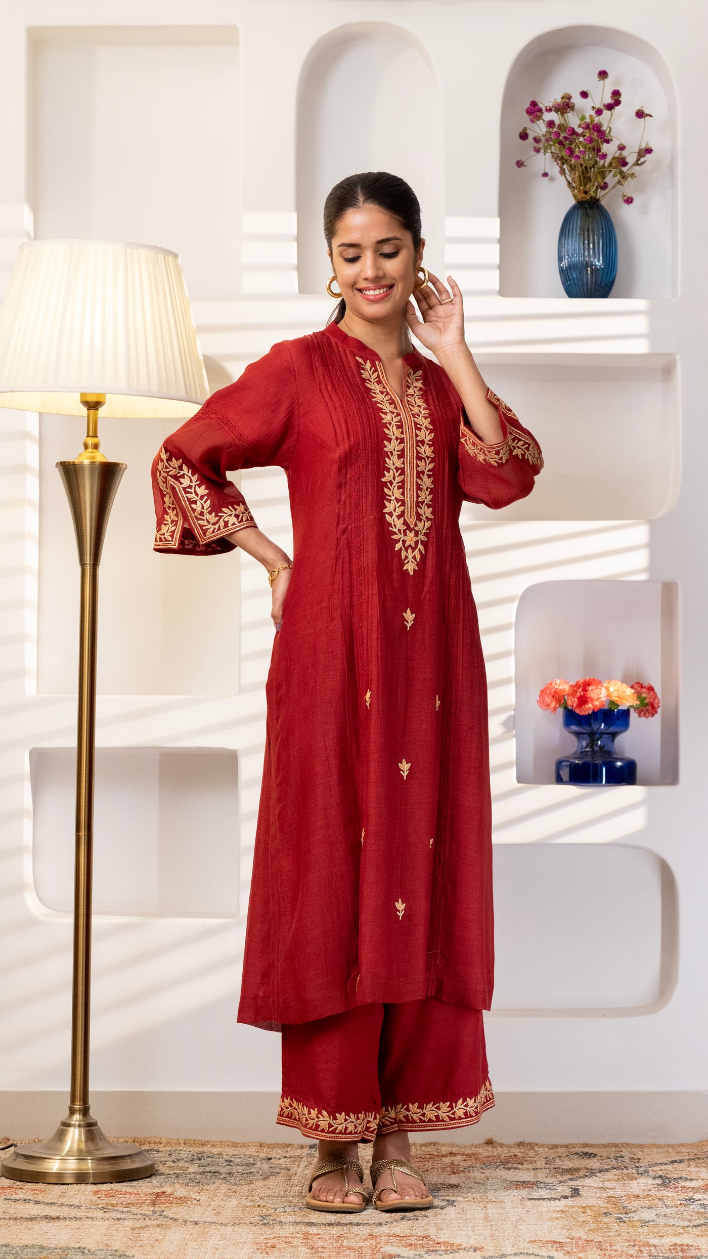 A pure chanderi silk kurta with beautiful jaali lace , floral thread and Gota embroidery bel and bootis is paired with pants with embroidery. The dupatta is in pure chanderi muslin with gold lace all 4 sides .