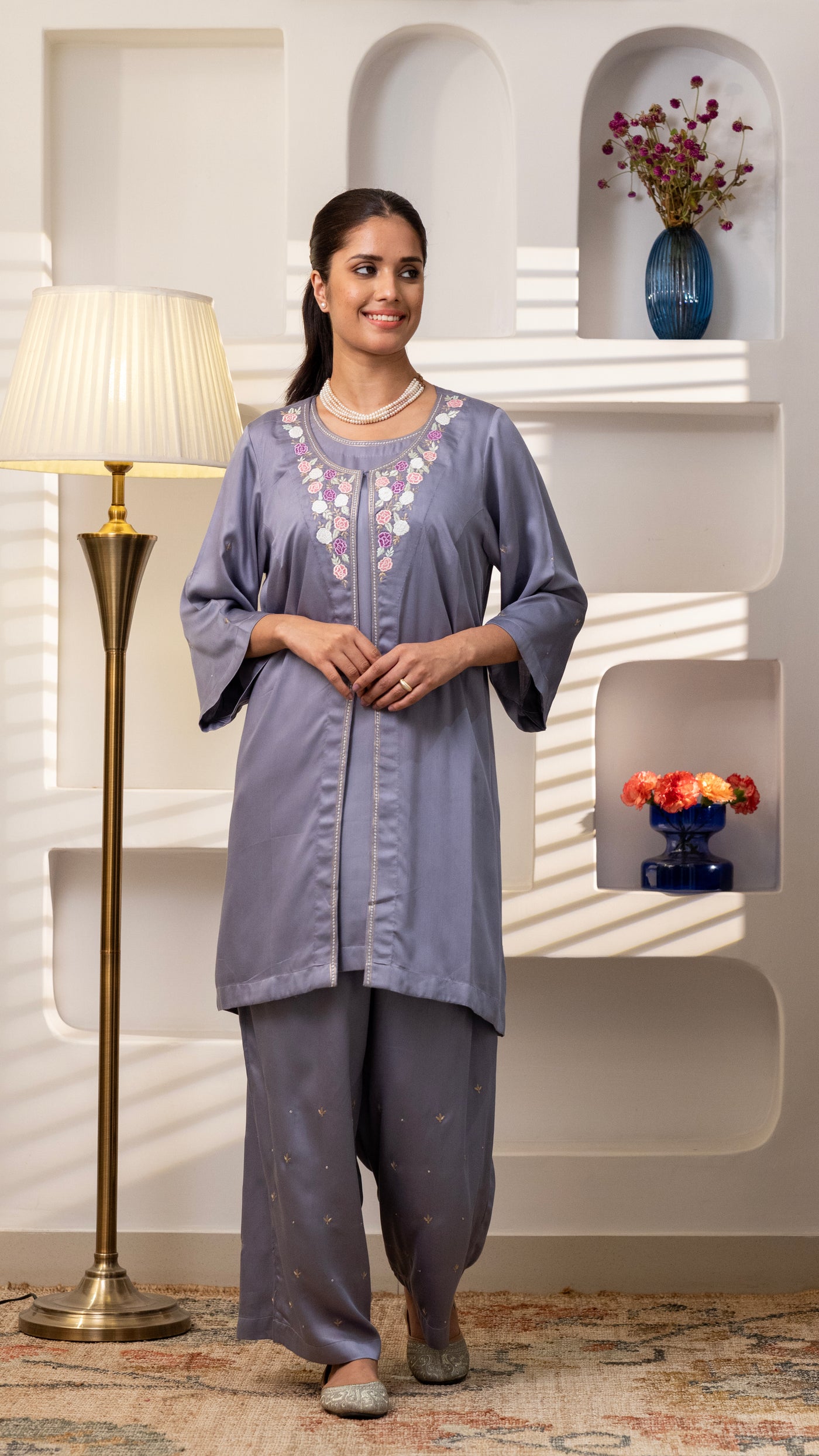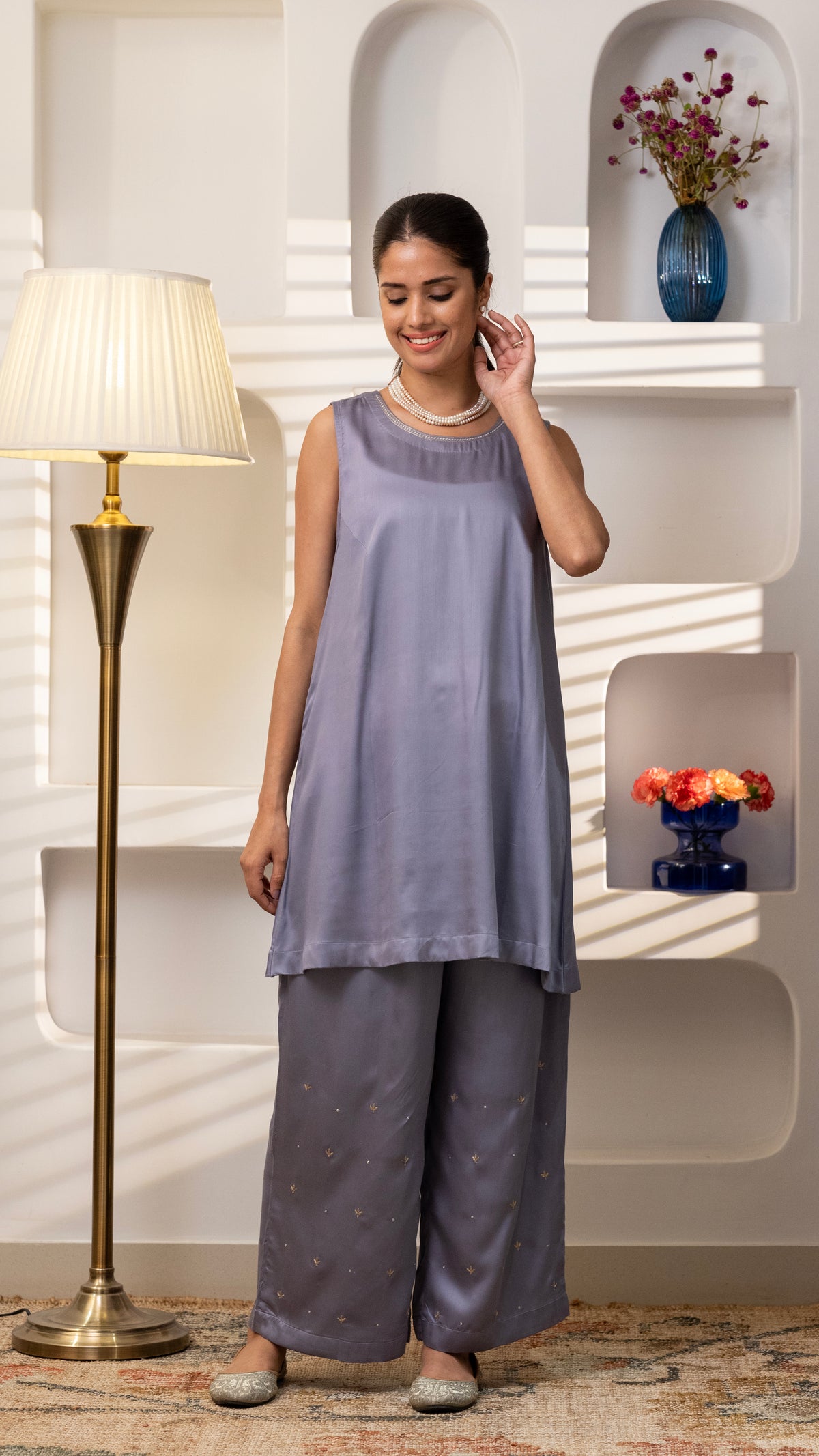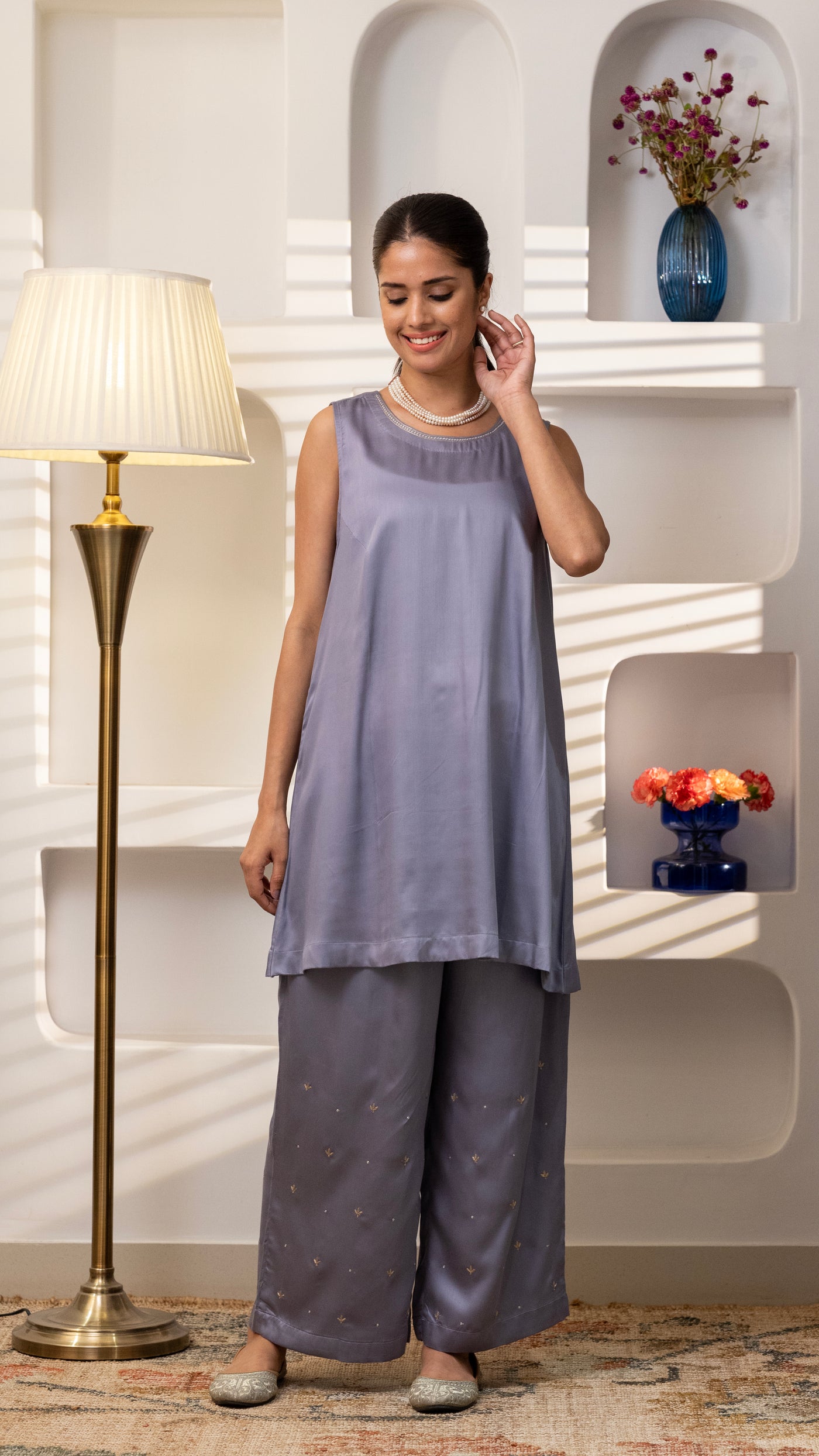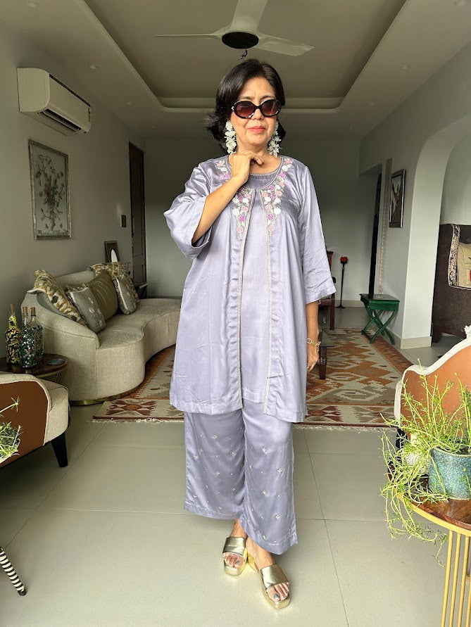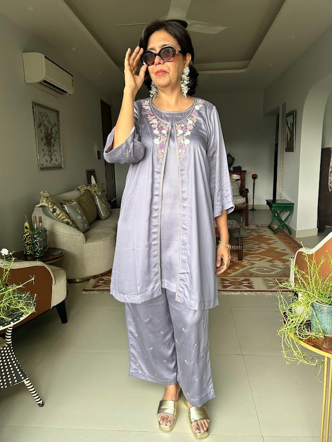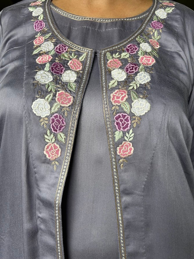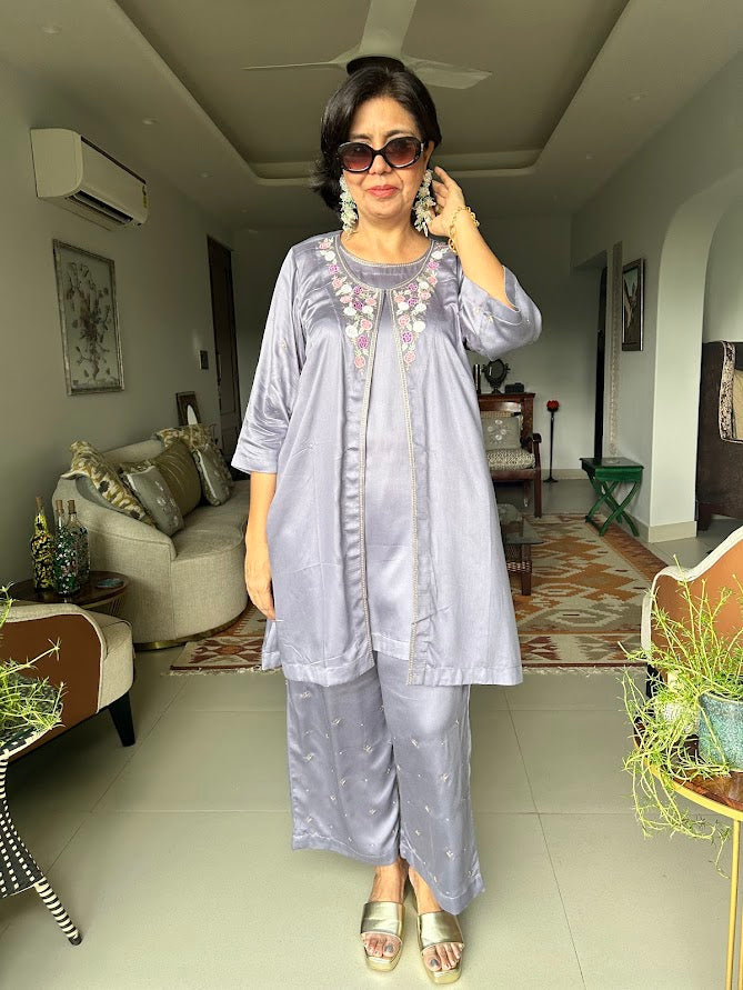A pure modal satin sleeveless kurta with tilla embroidery is paired with an overlay with tilla and appliqué floral embroidery with pants with tilla bootis with pocket.