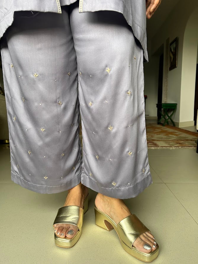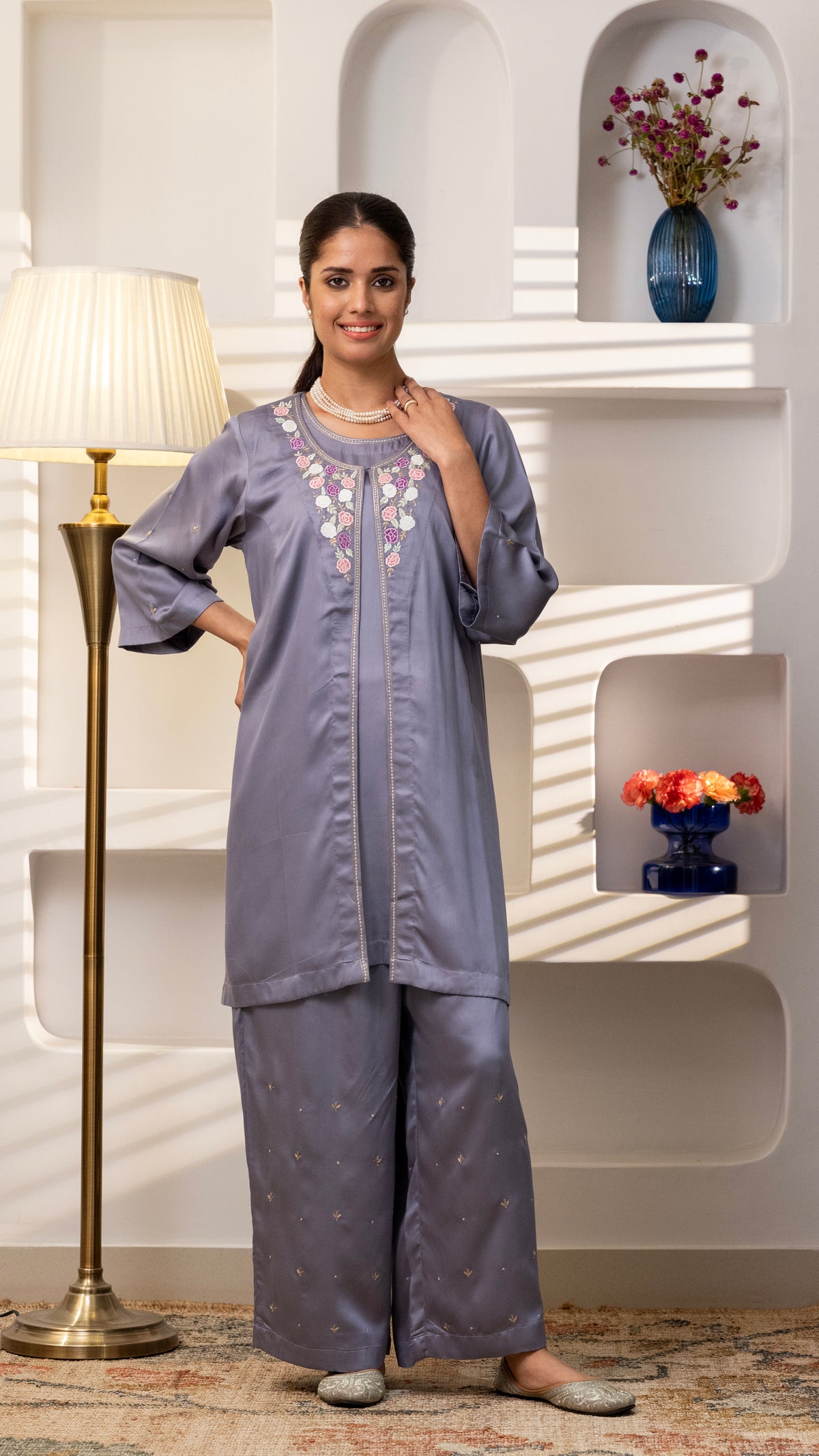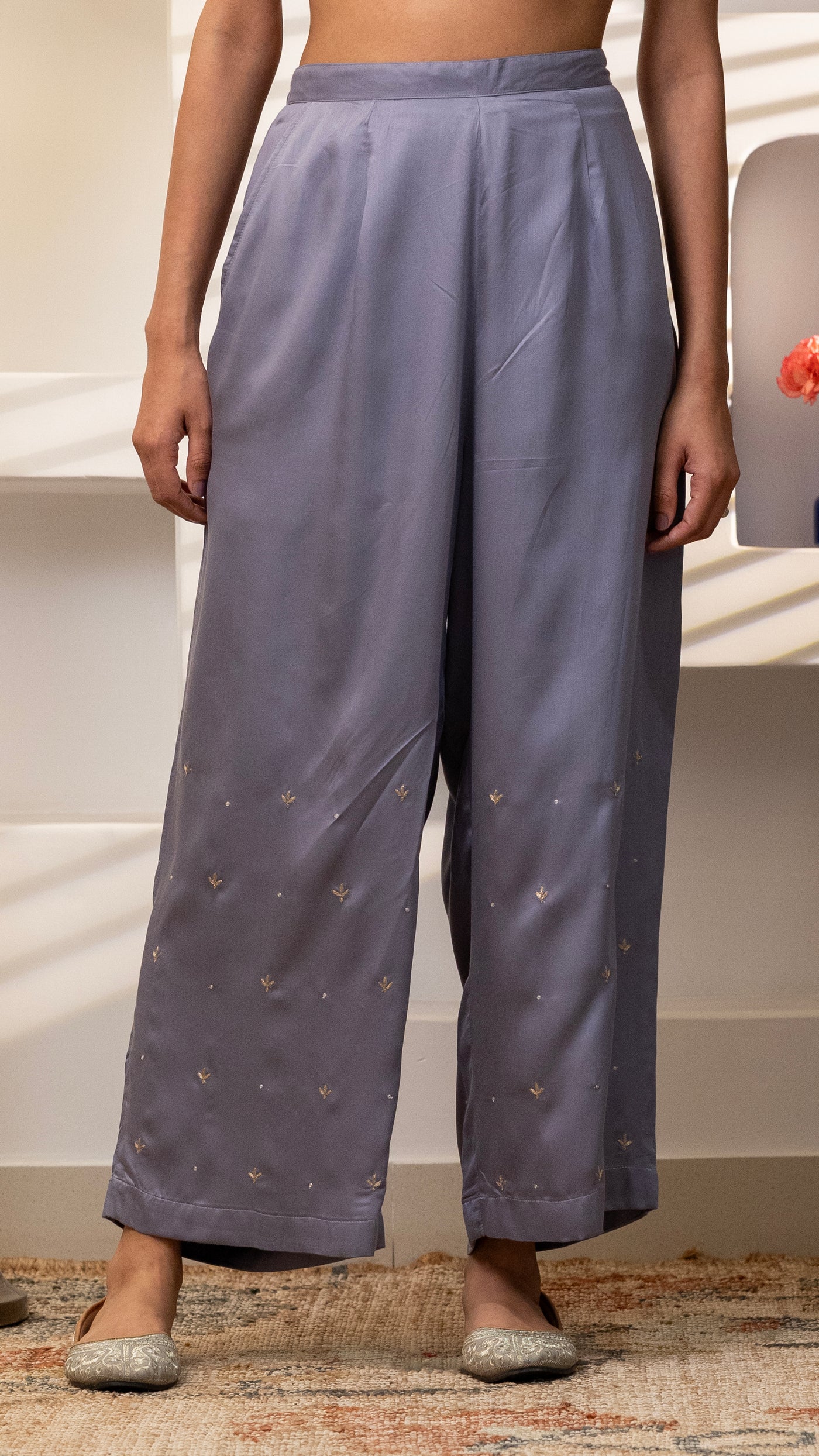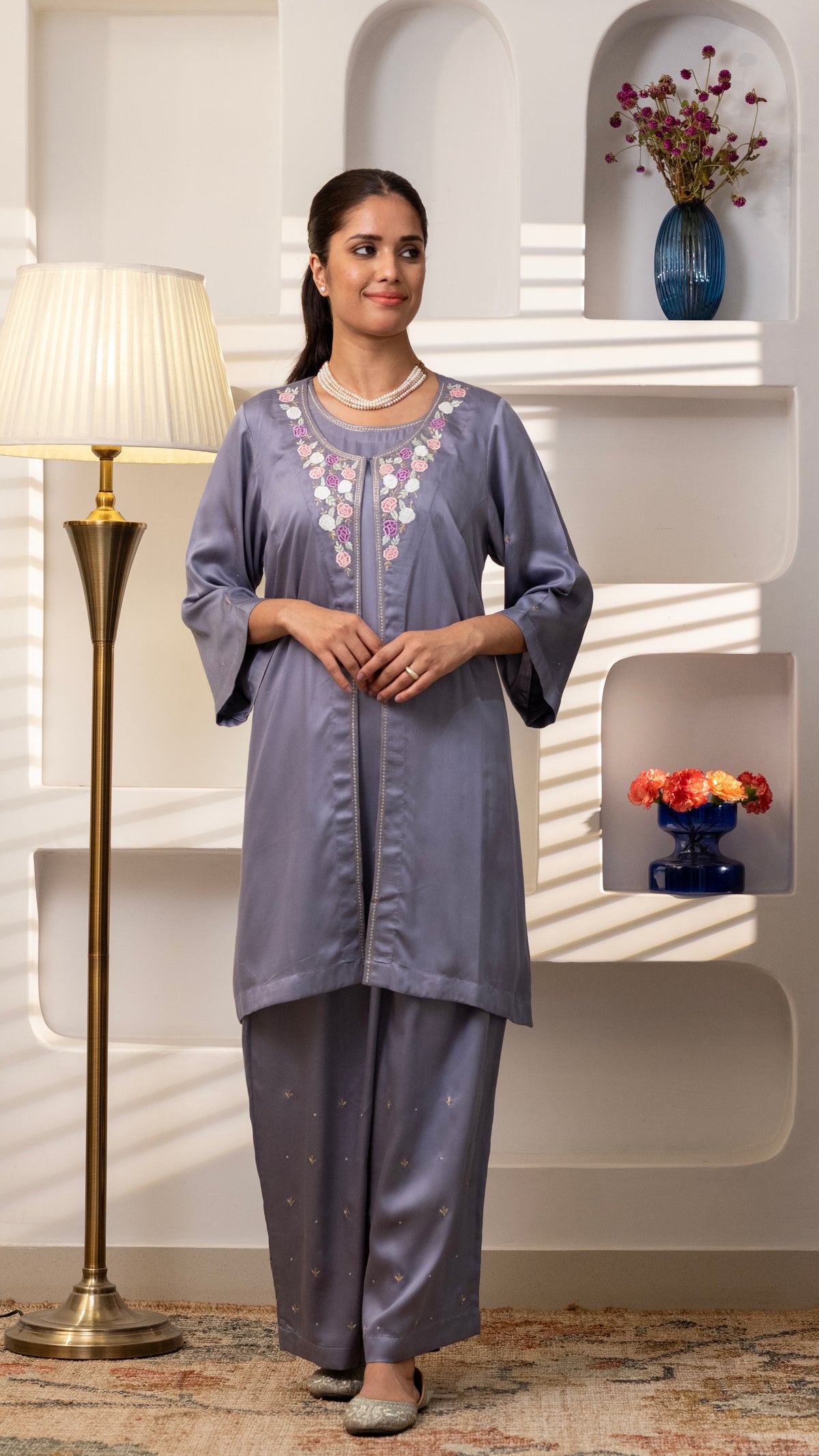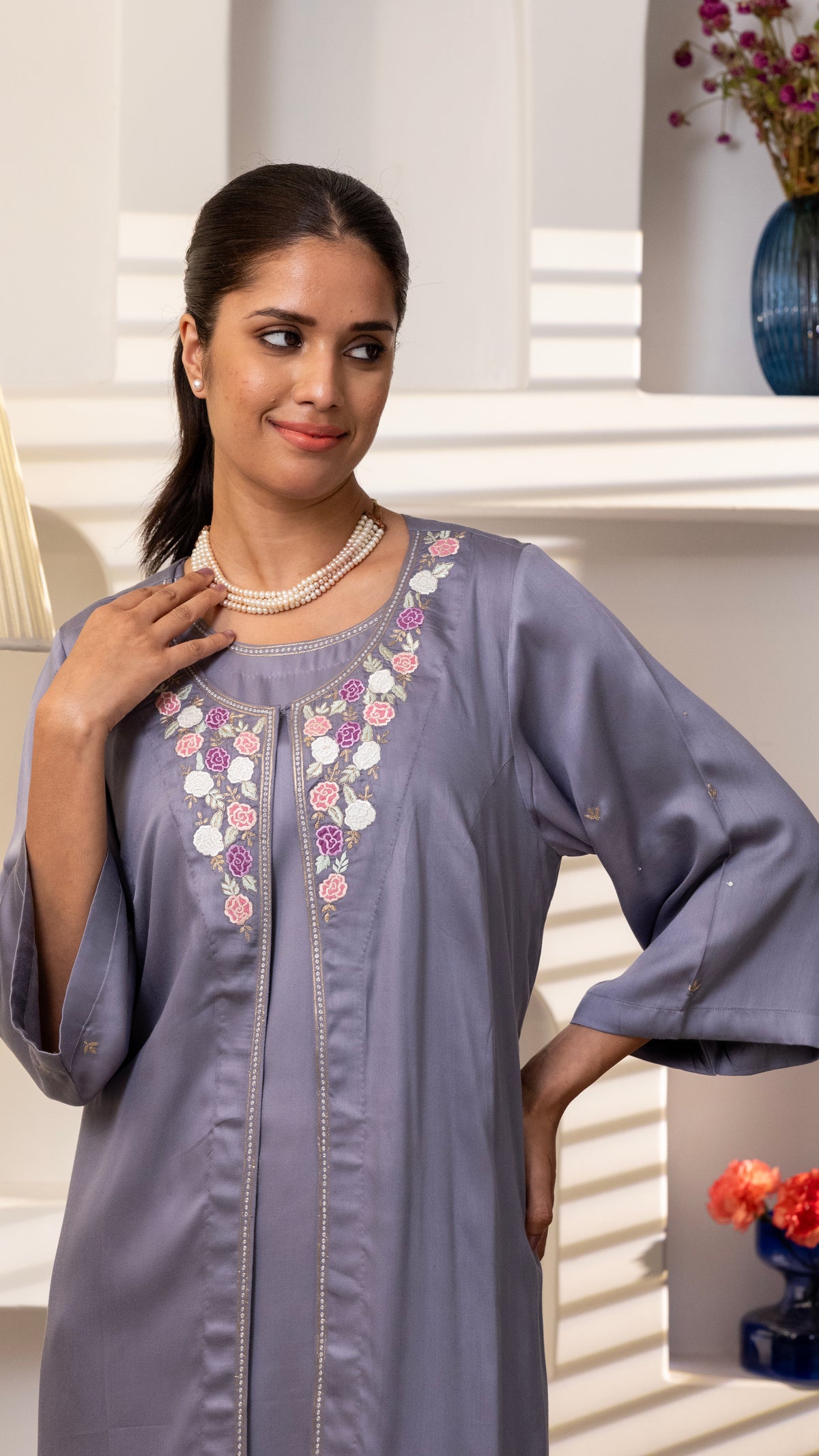 A pure modal satin sleeveless kurta with tilla embroidery is paired with an overlay with tilla and appliqué floral embroidery with pants with tilla bootis with pocket.