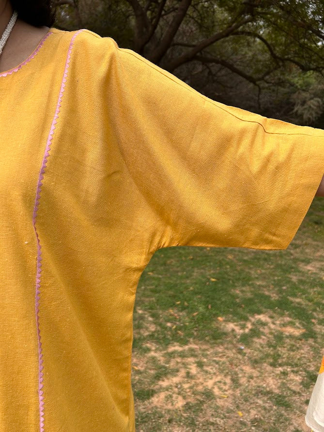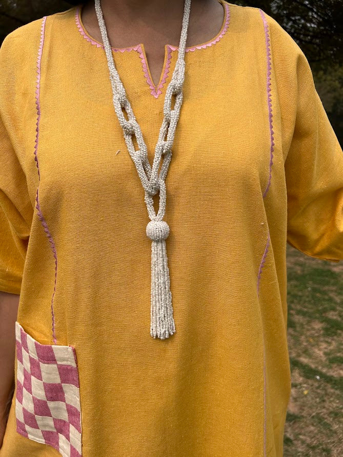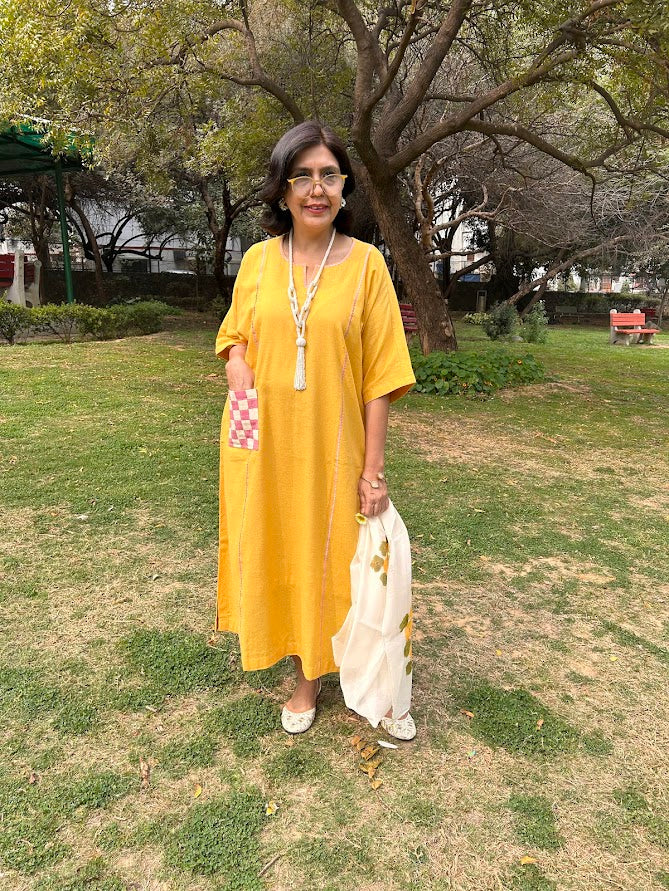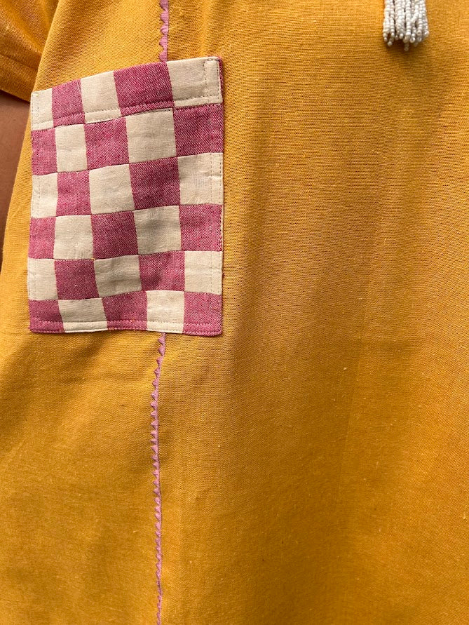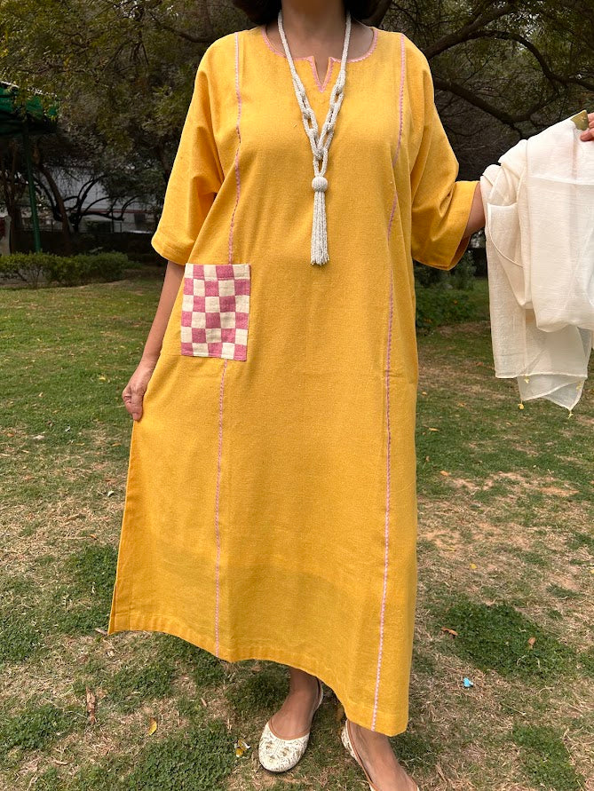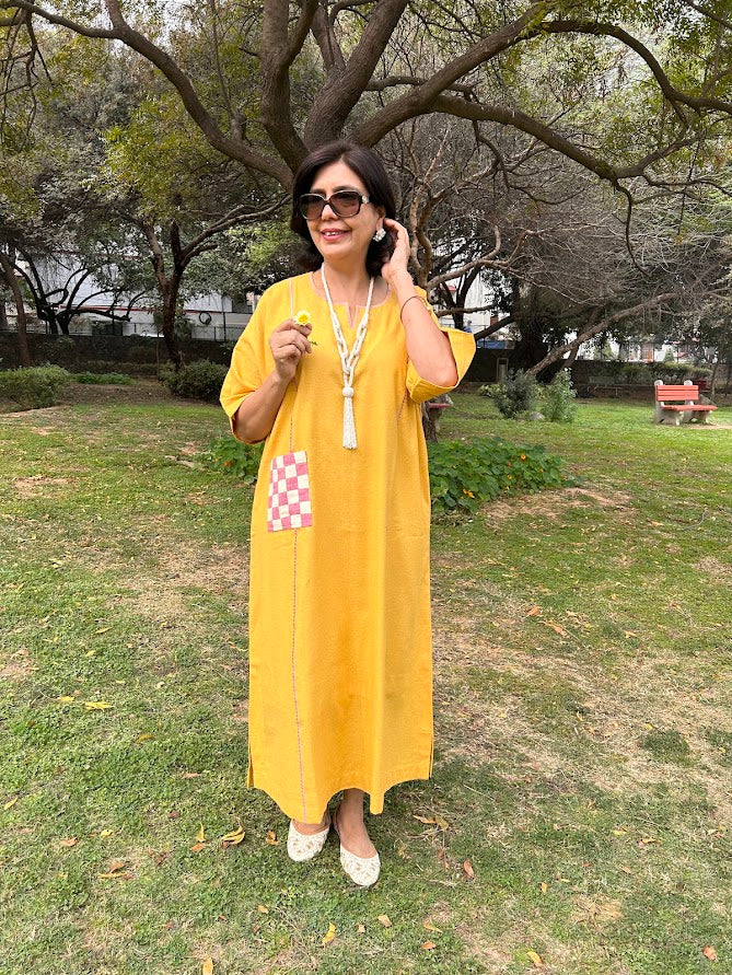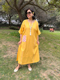 A kaftan dress in cotton with checked patchwork pocket and thread embroidery. The dress can be paired with palazzos to wear it like a kurta too .