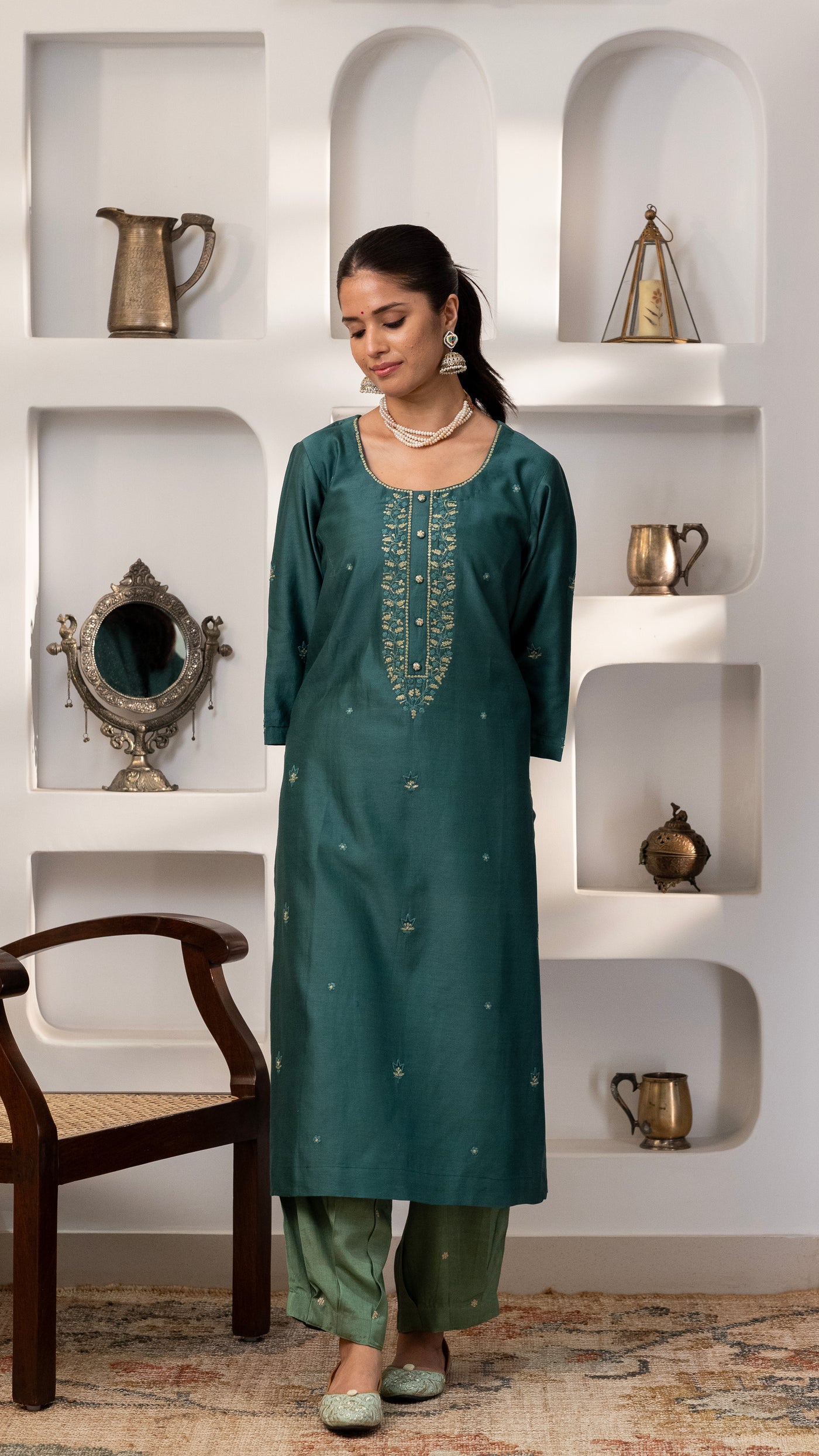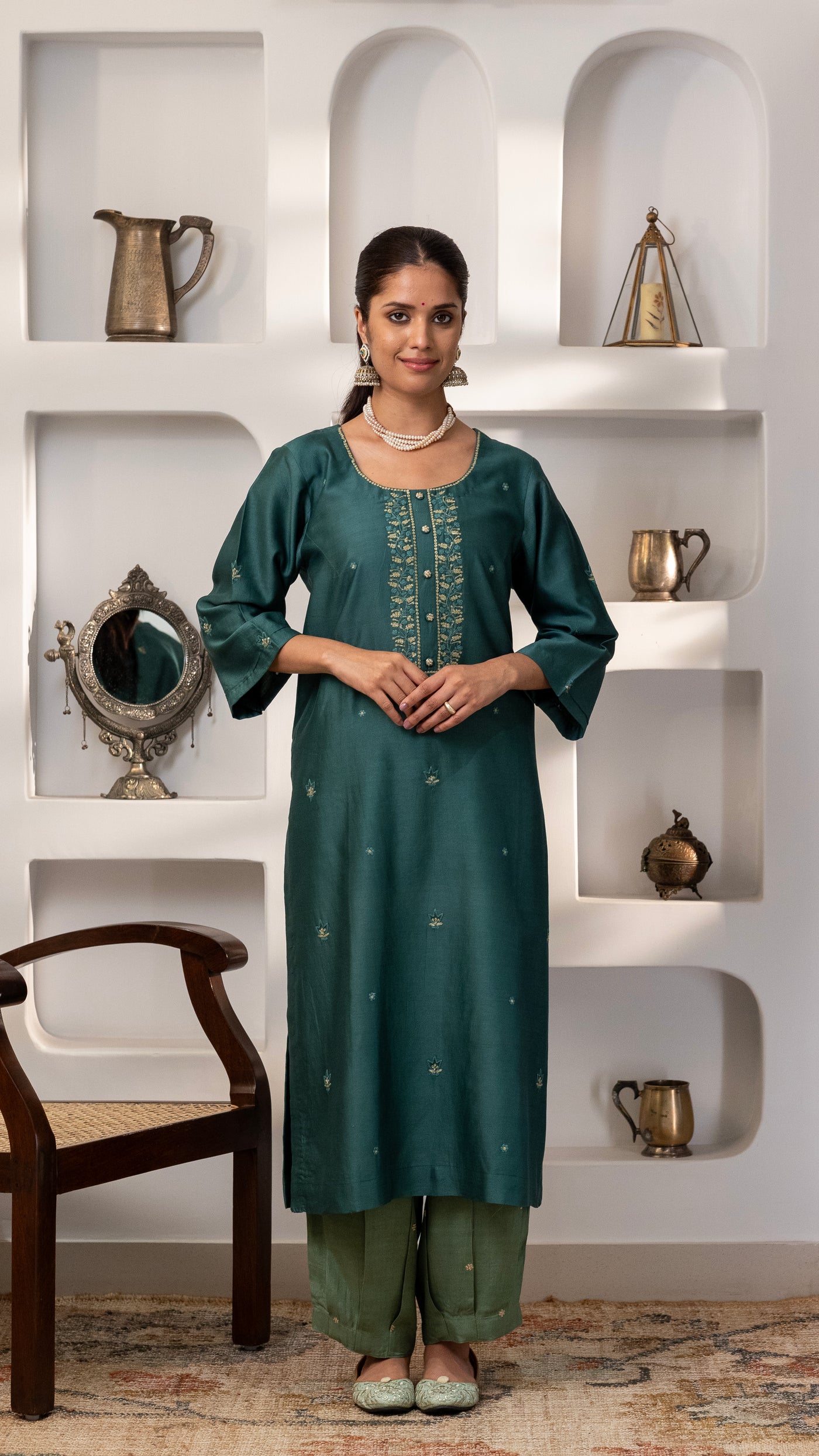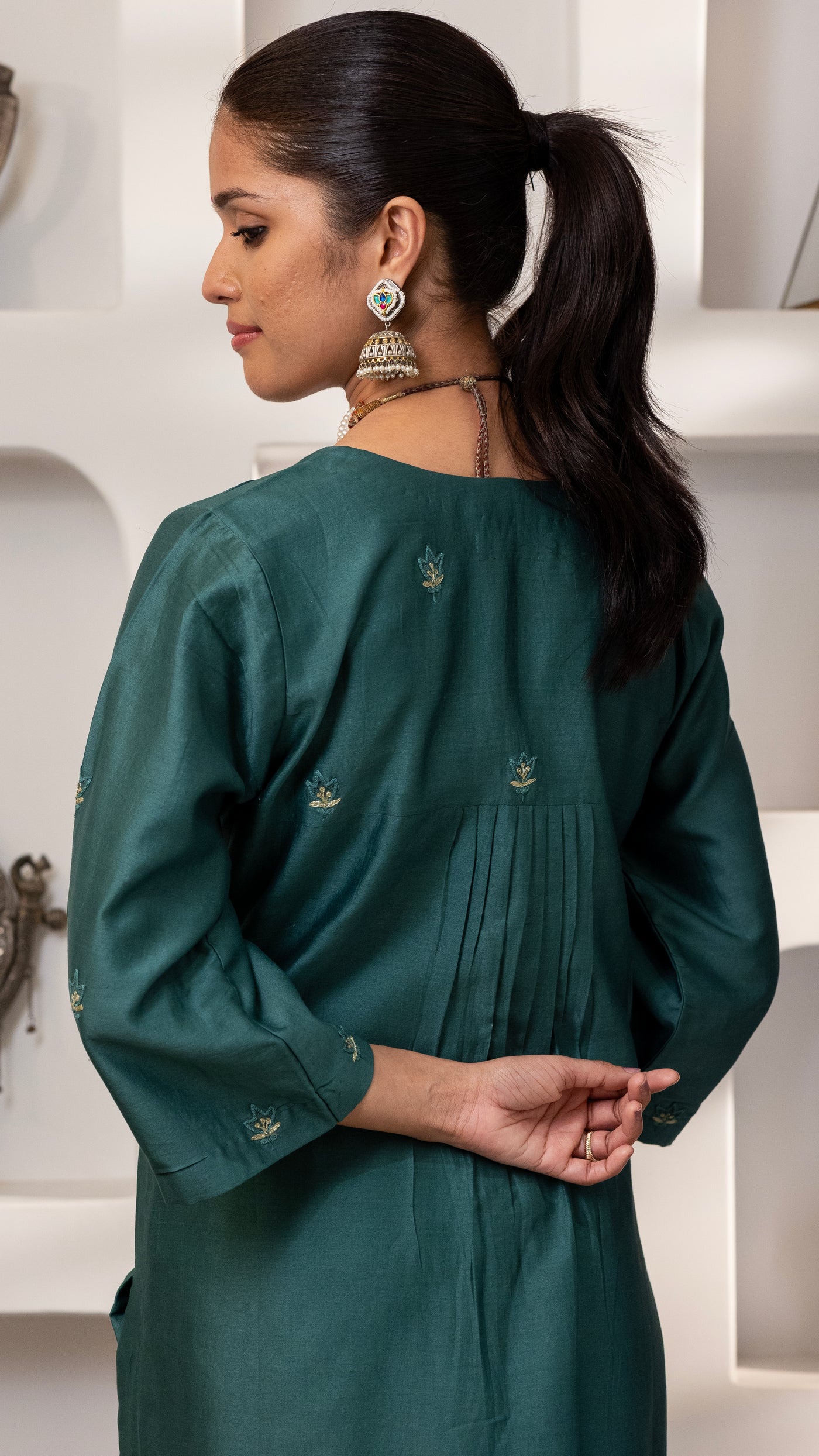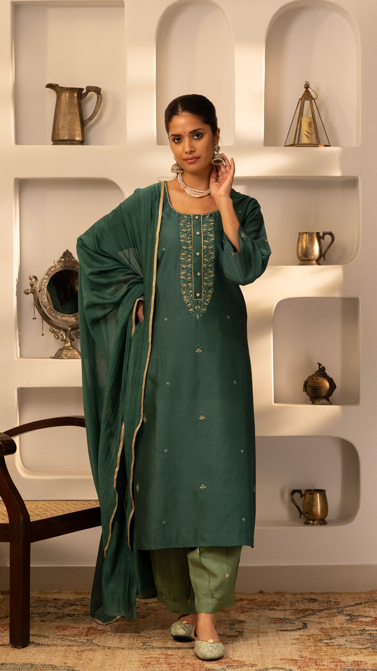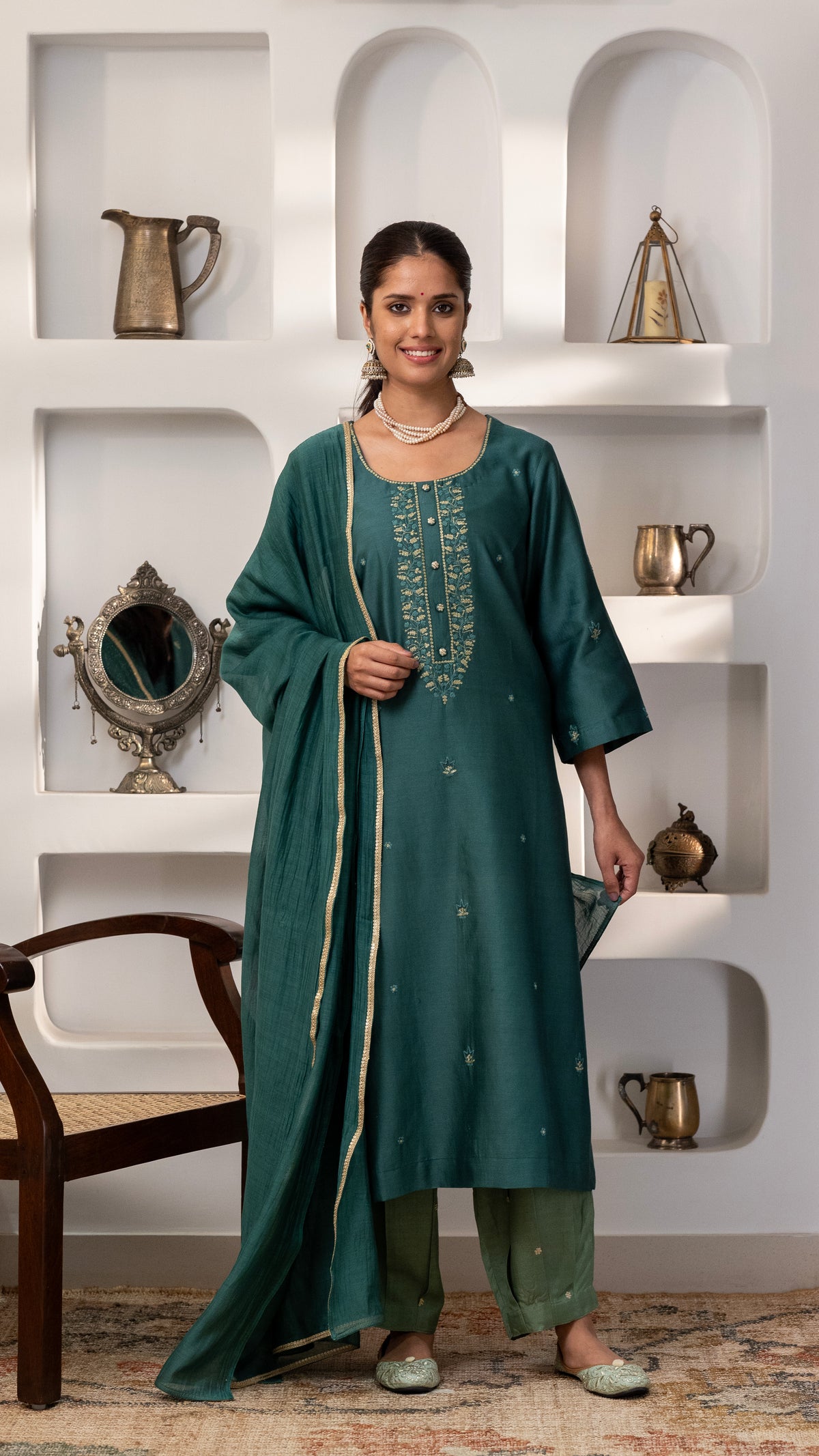A pure chanderi silk kurta with intricate Tilla and dori embroidery is paired with cotton silk pleated salwar with embroidery. The set is paired with a pure muslin chanderi dupatta with gold lace on all 4 sides.