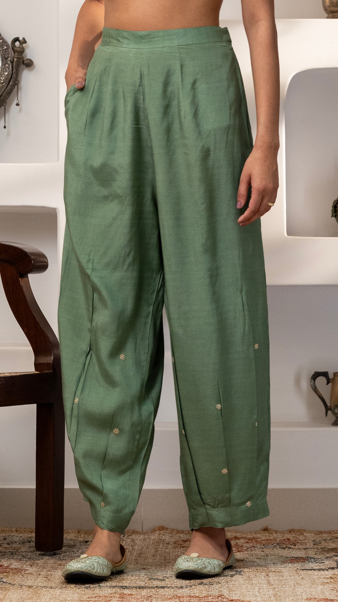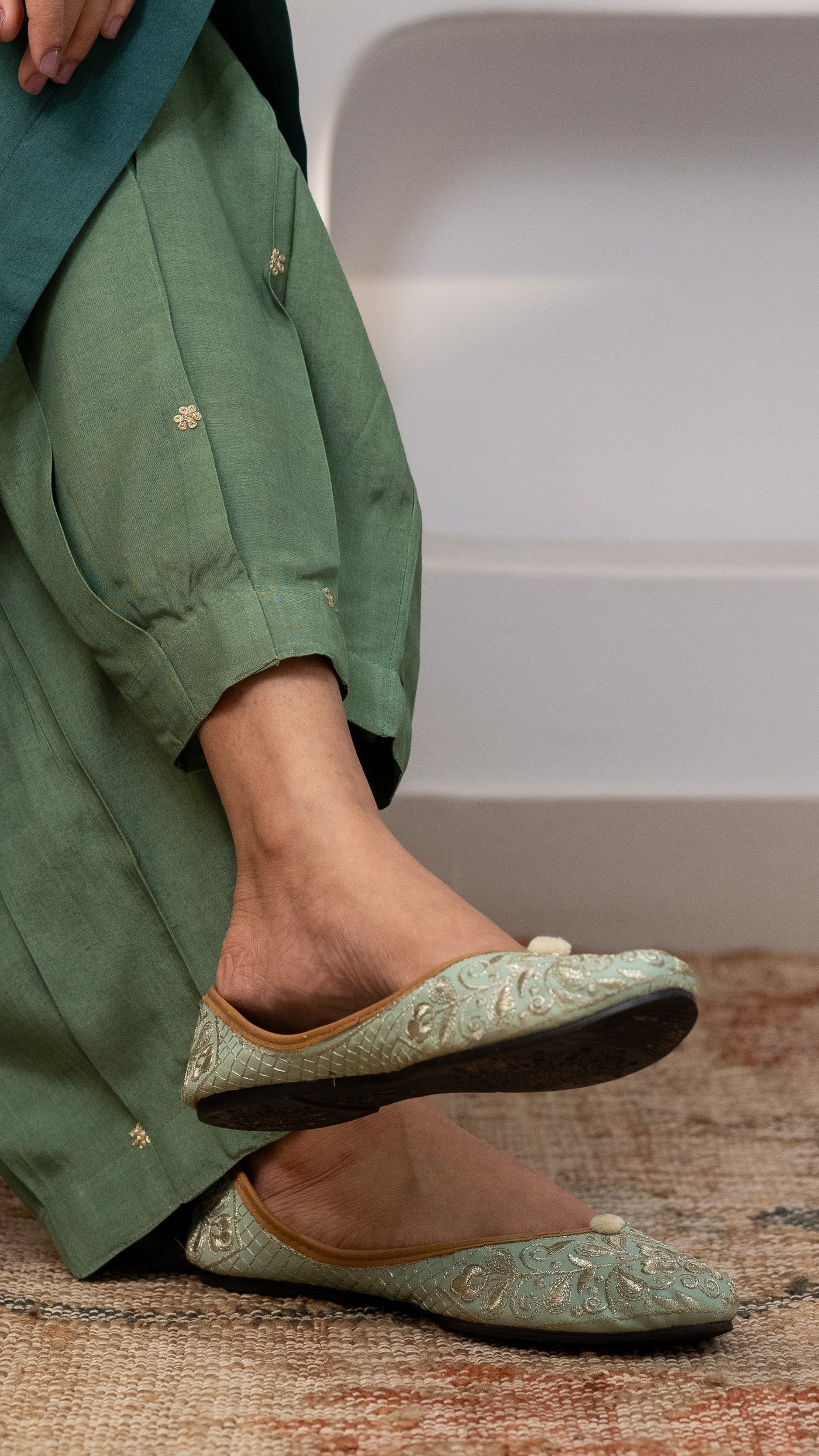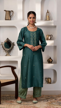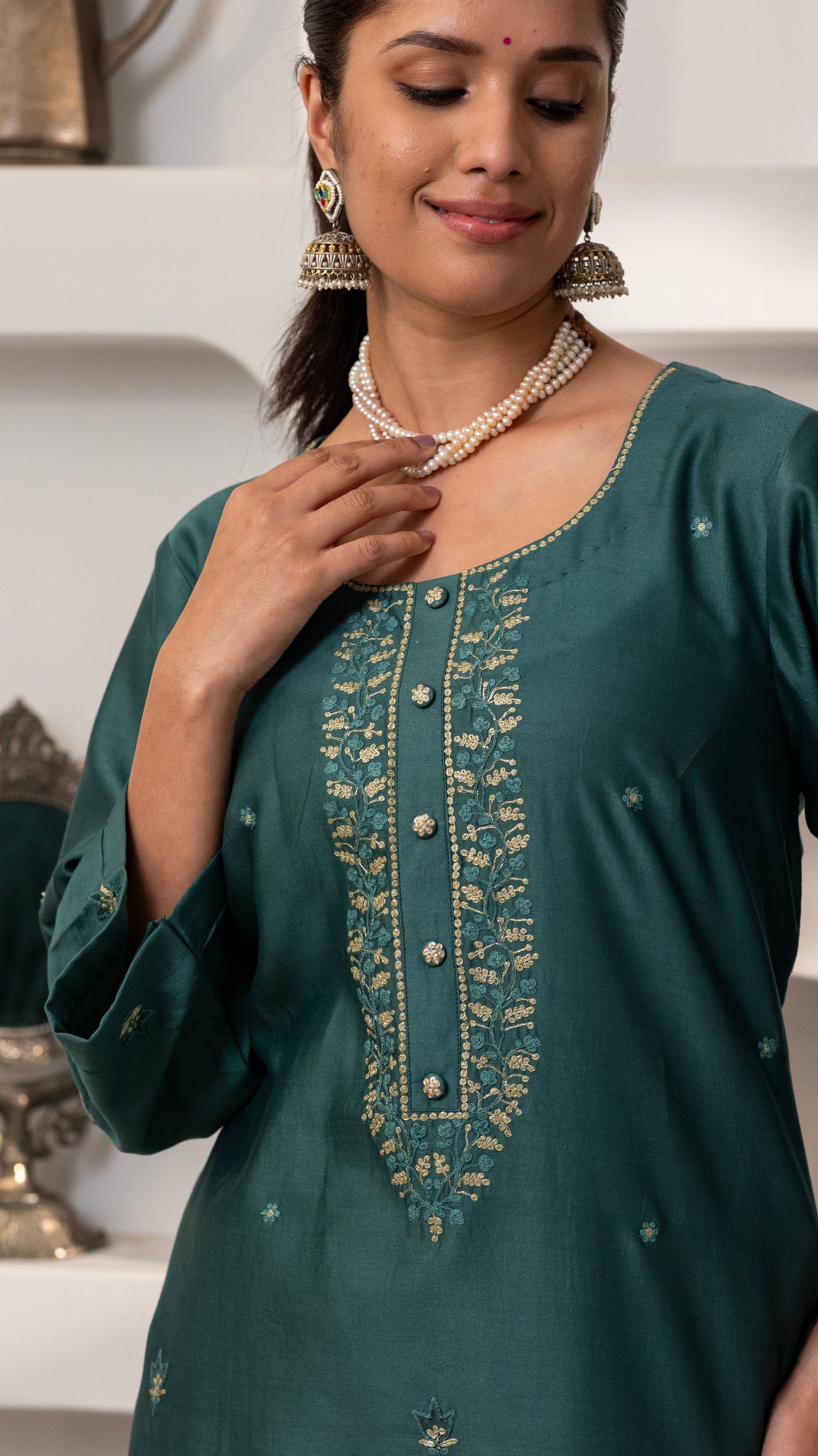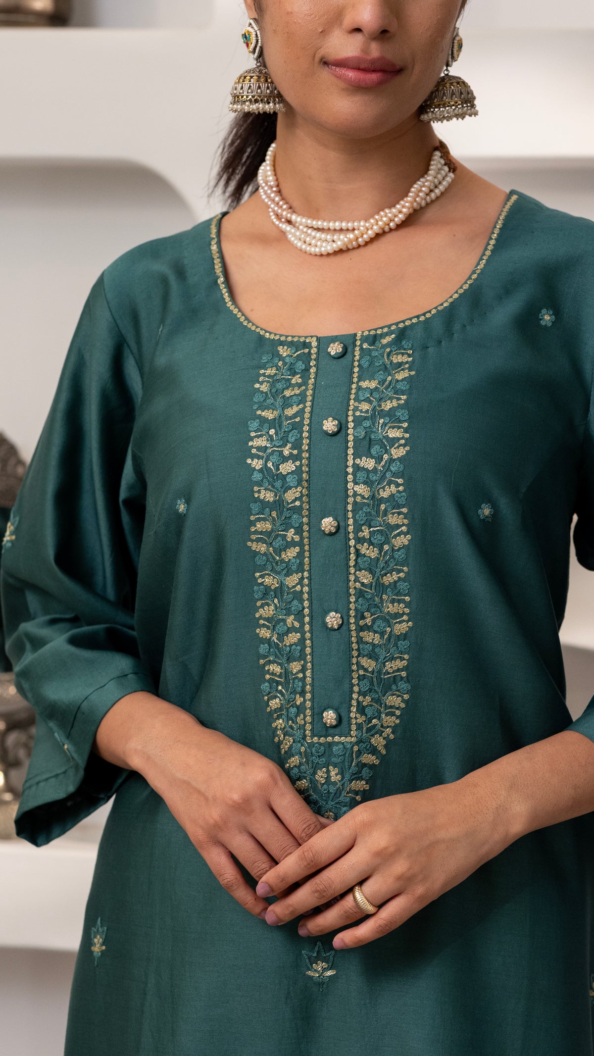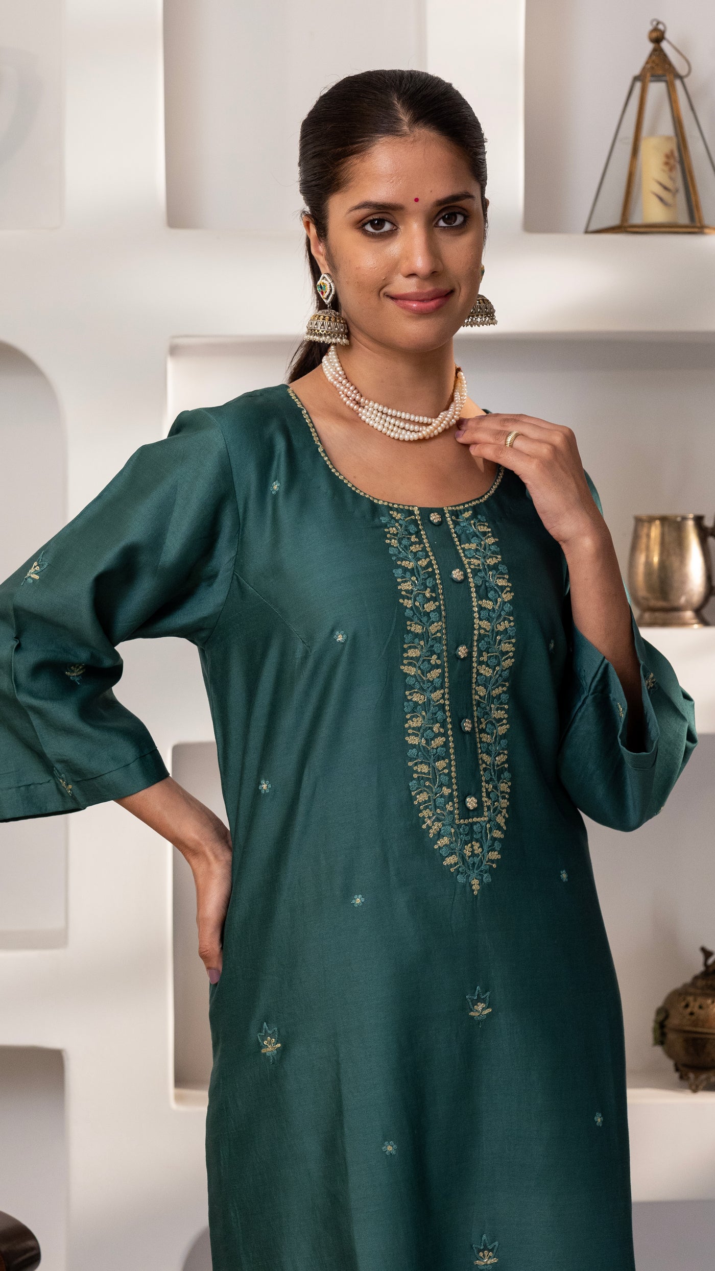 A pure chanderi silk kurta with intricate Tilla and dori embroidery is paired with cotton silk pleated salwar with embroidery. The set is paired with a pure muslin chanderi dupatta with gold lace on all 4 sides.