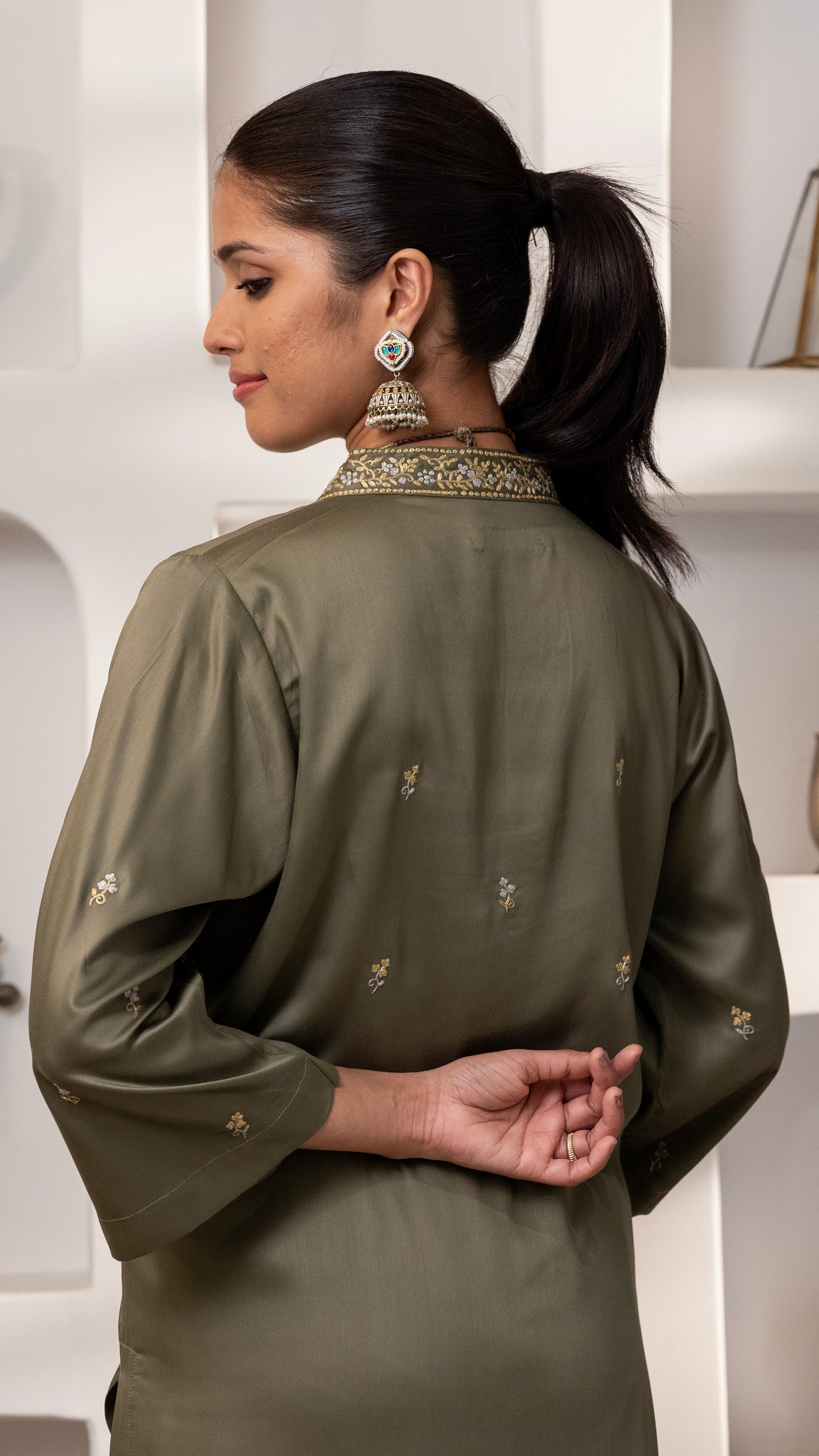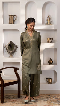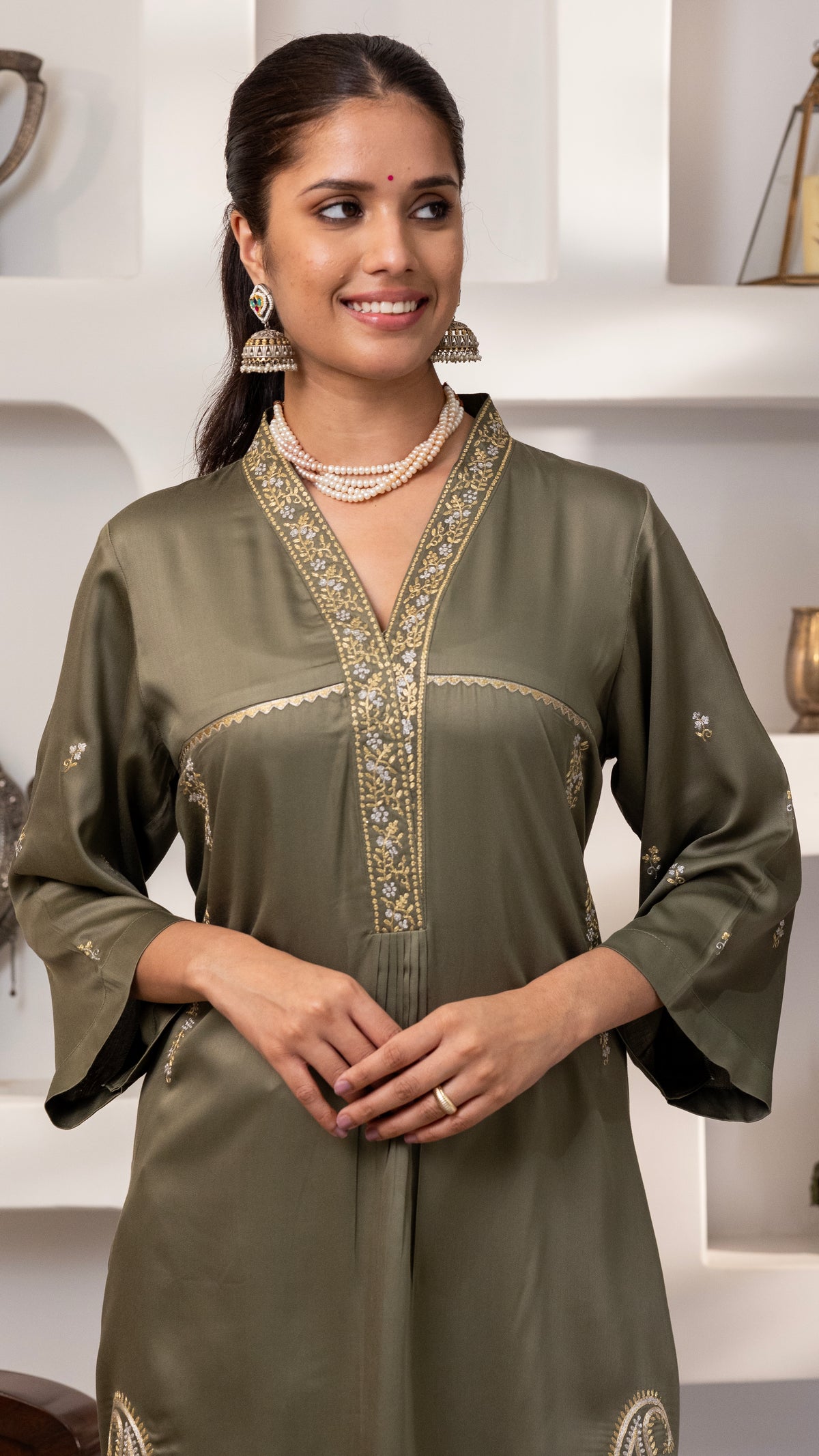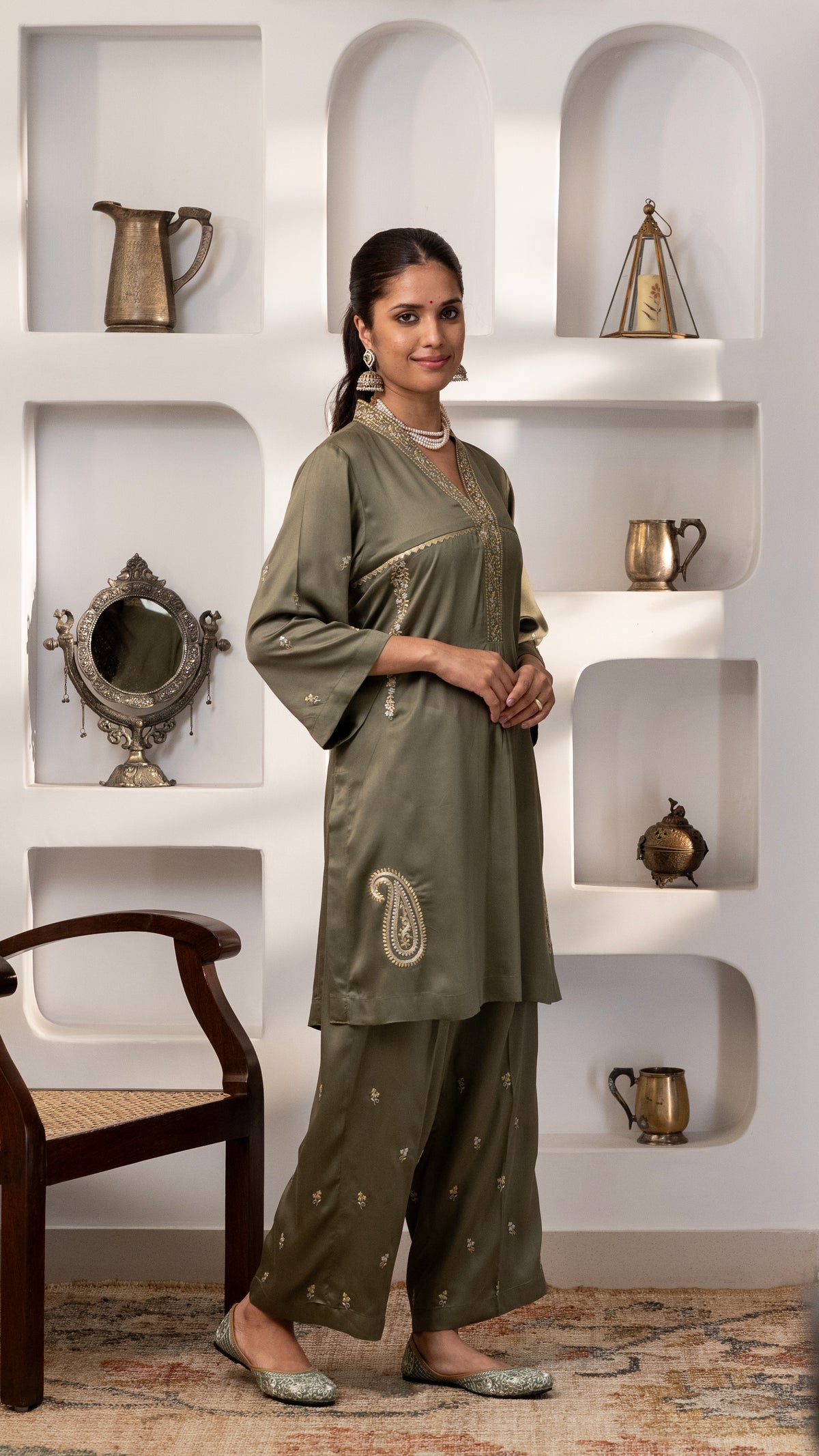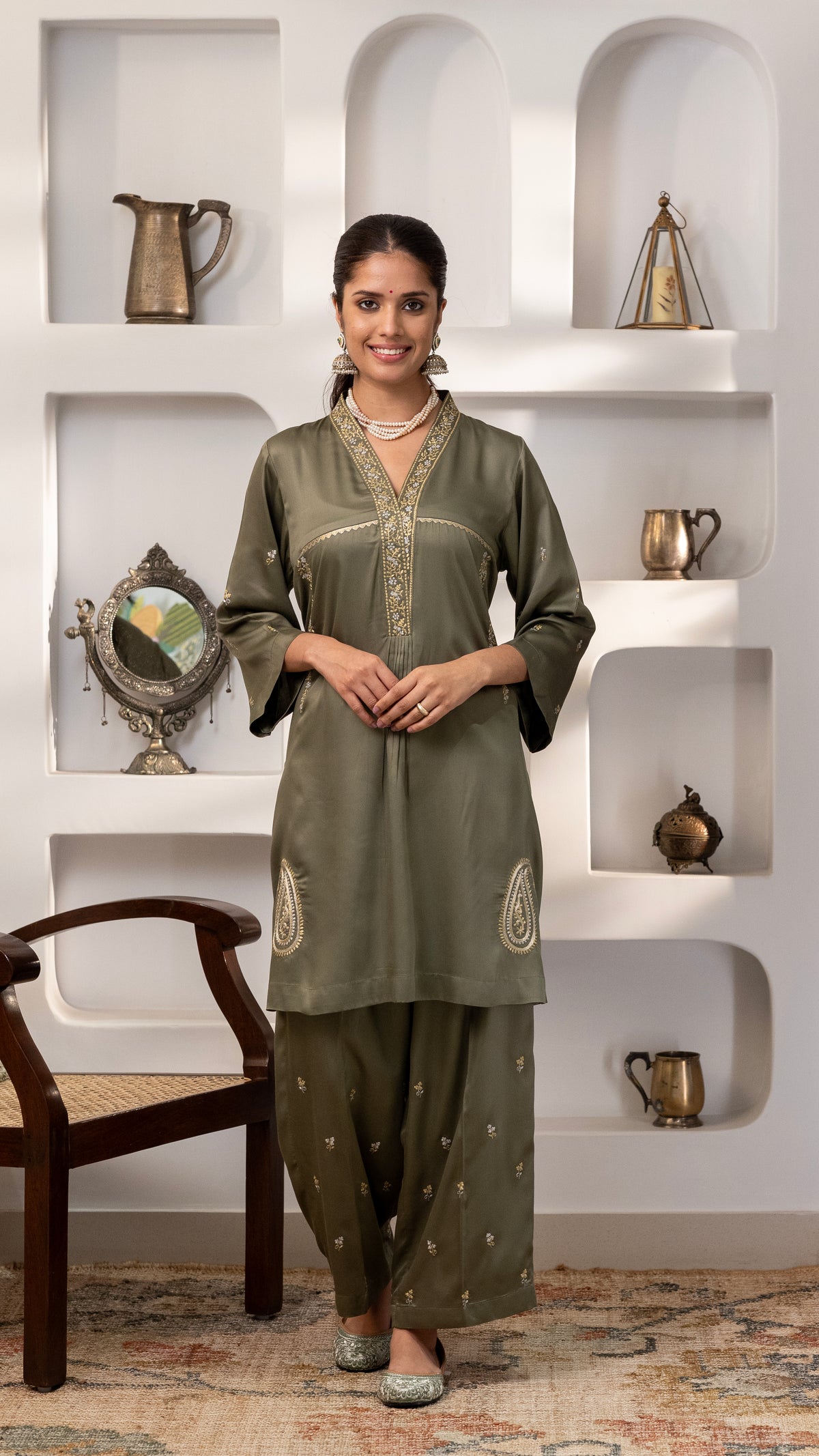 A pure modal silk kurta with intricate tilla embroidery in gold and silver is paired with pants with embroidery and pocket. This indowestern outfit is great for a festive wear.