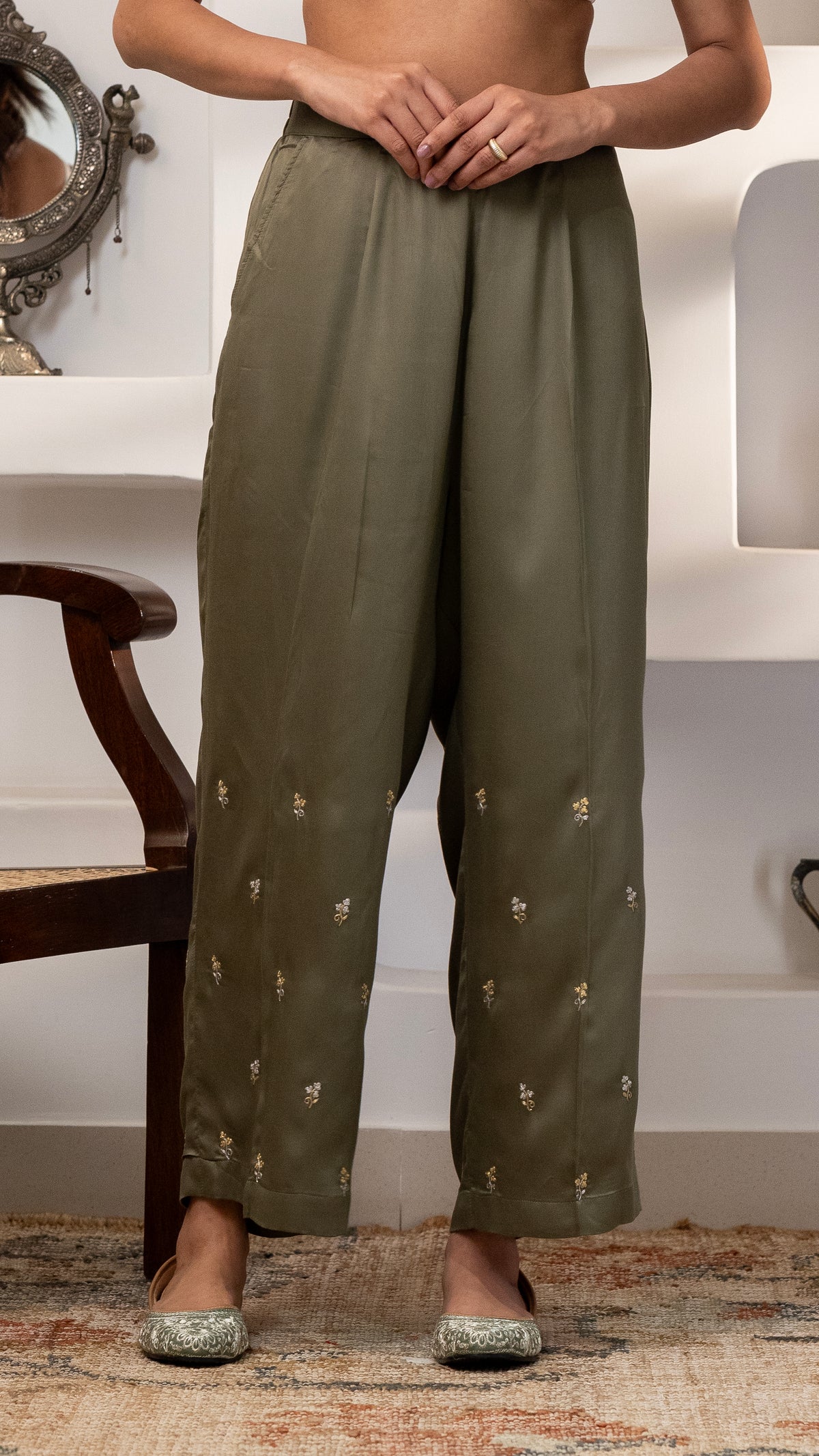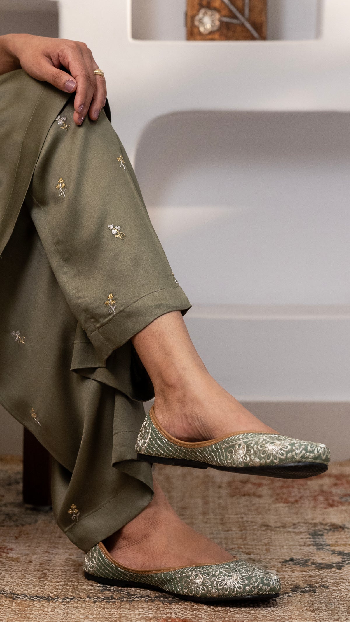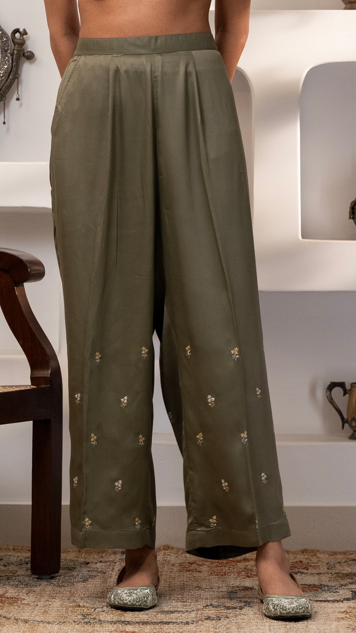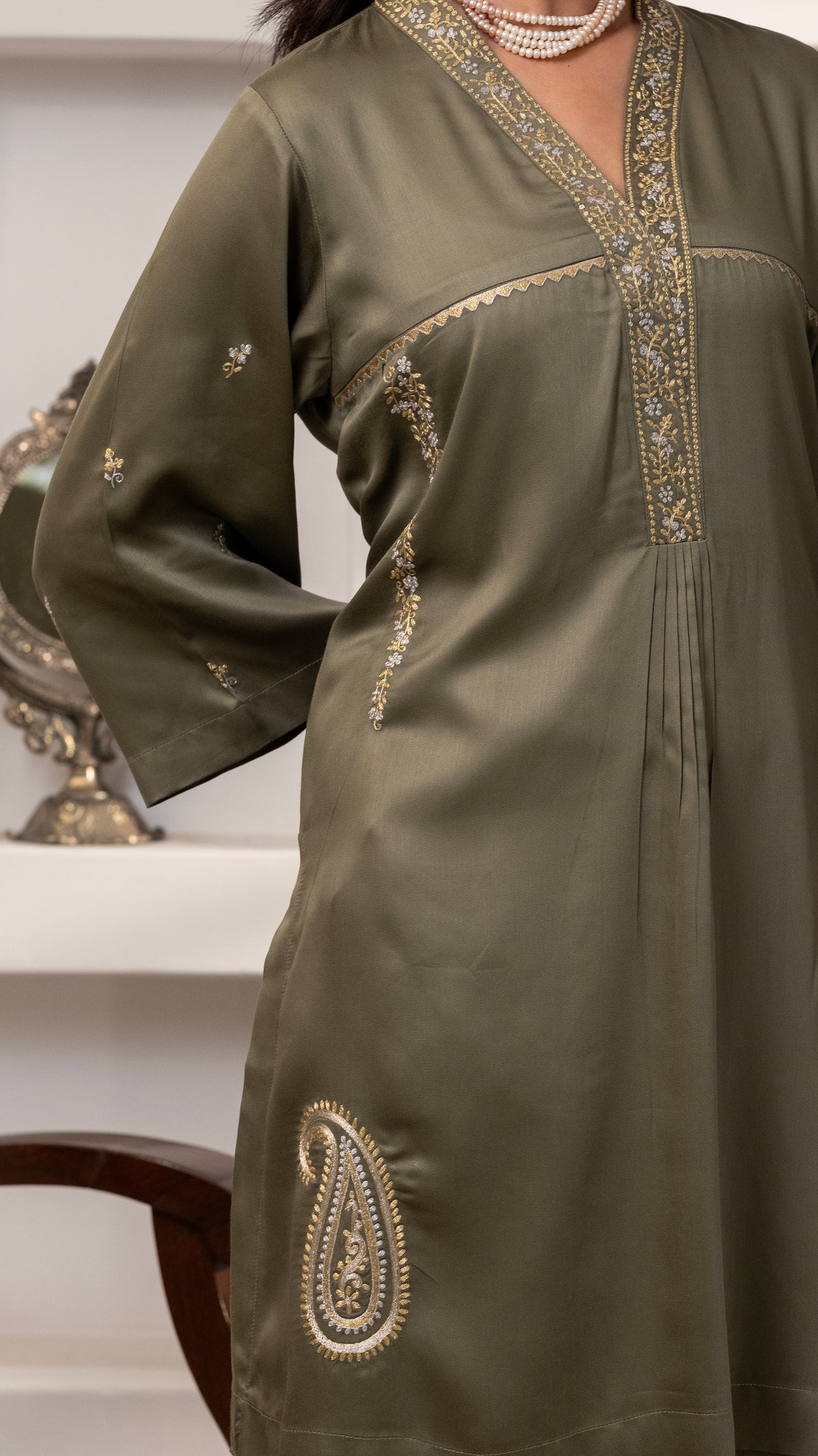 A pure modal silk kurta with intricate tilla embroidery in gold and silver is paired with pants with embroidery and pocket. This indowestern outfit is great for a festive wear.