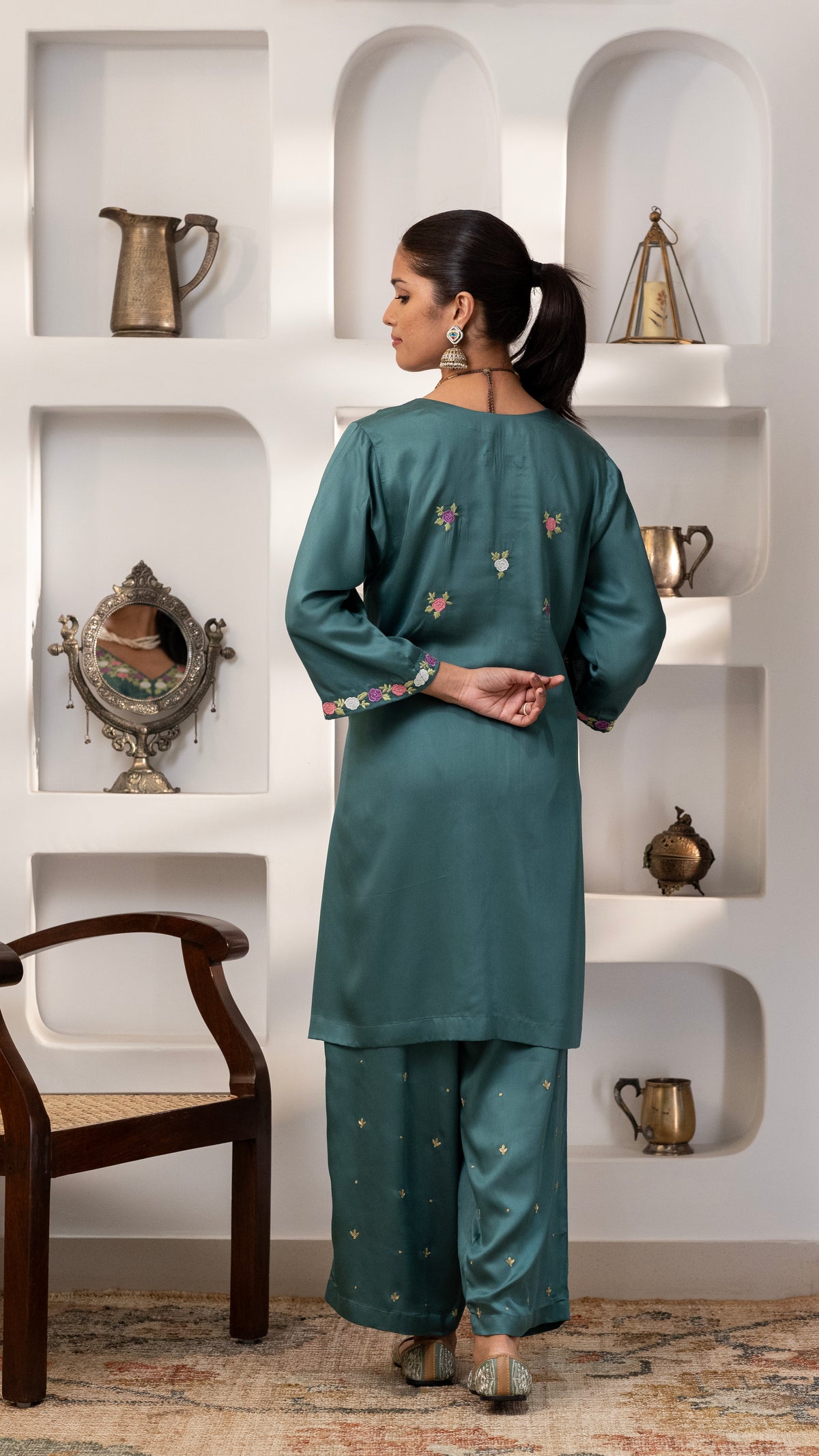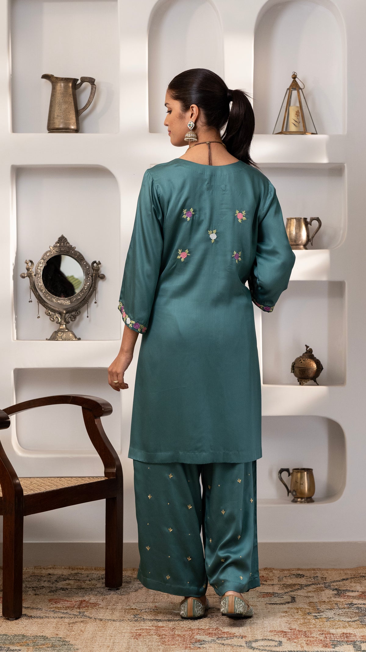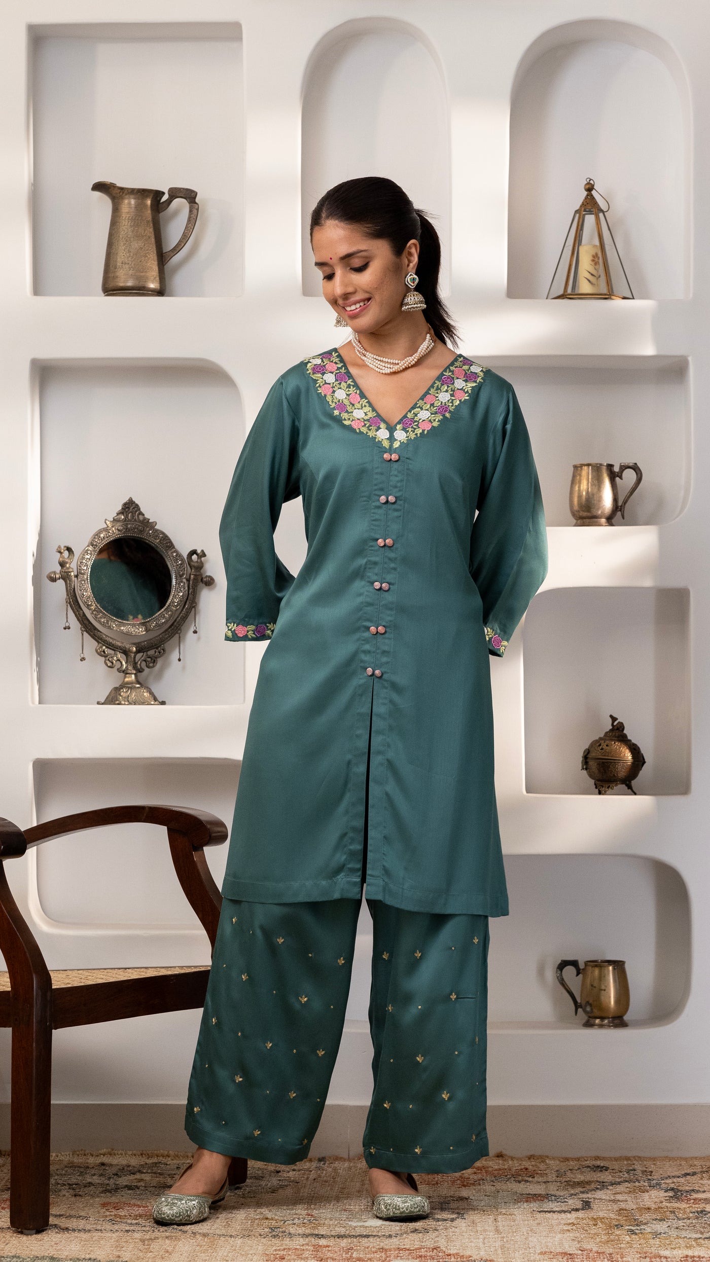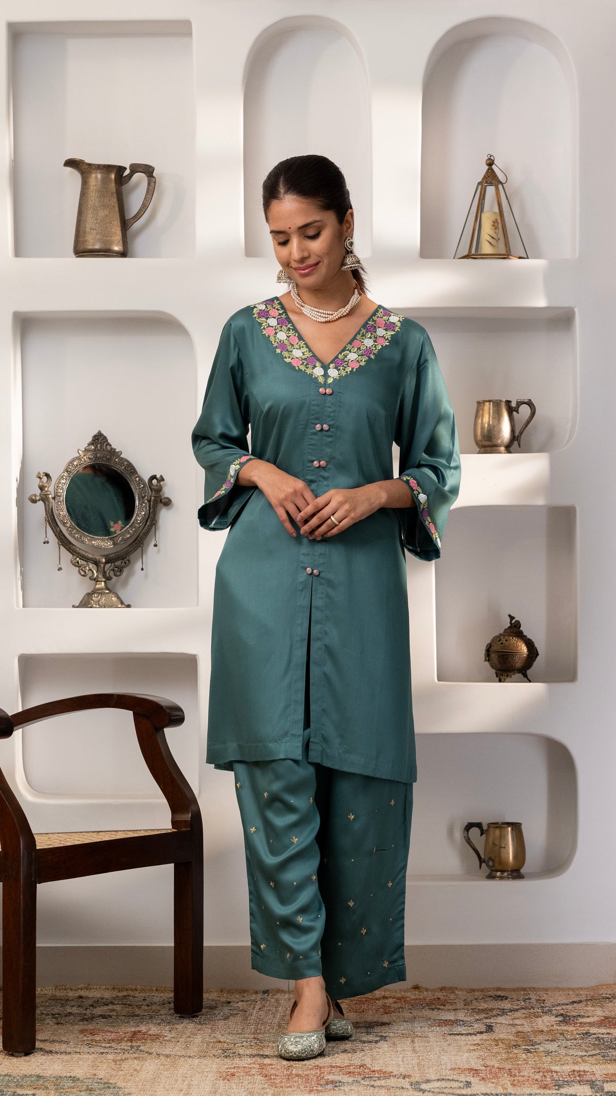 A pure modal silk kurta with appliqué embroidery on the yoke and tilla embroidery detailing is paired with pants with tilla embroidery and pocket.