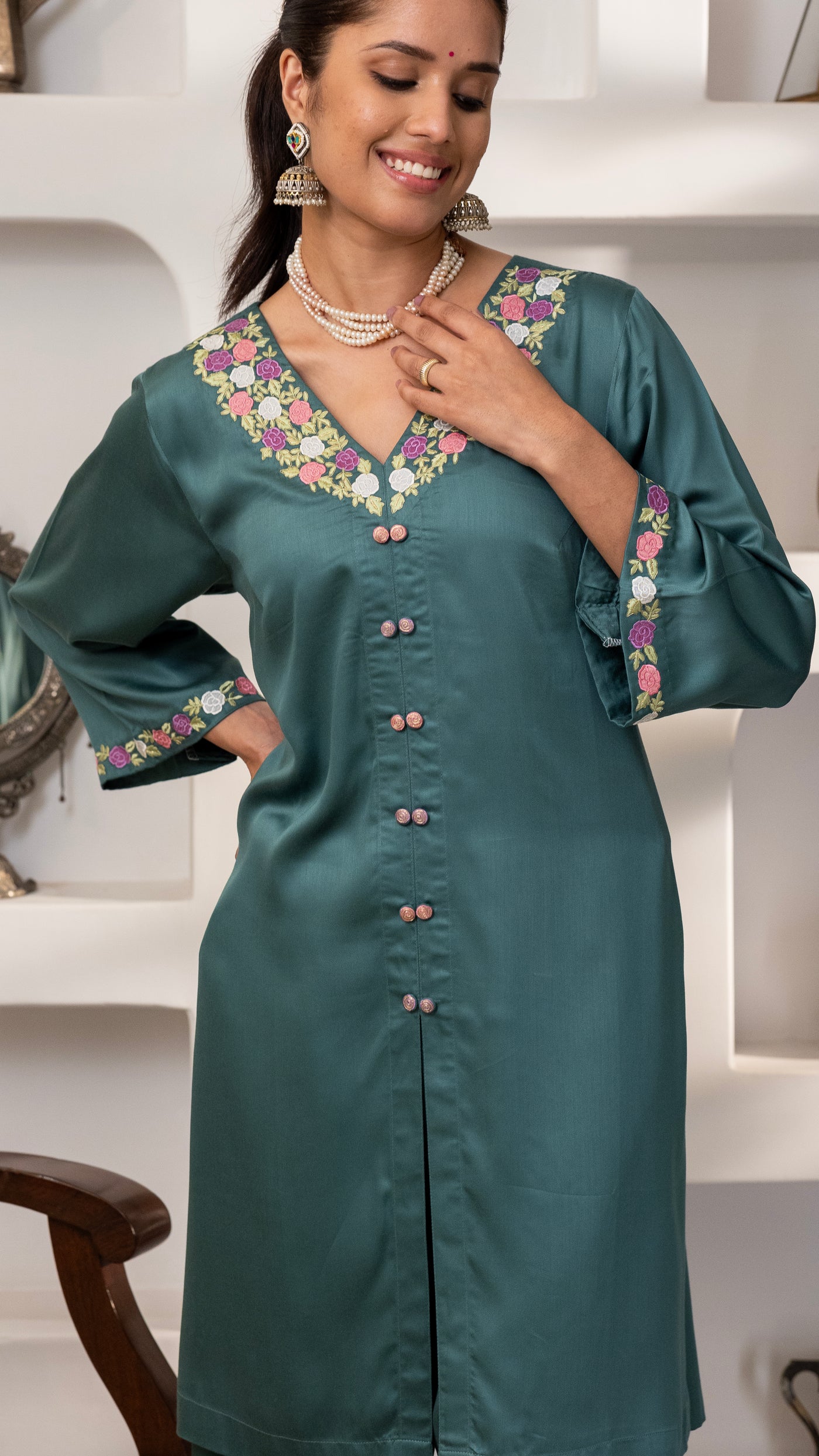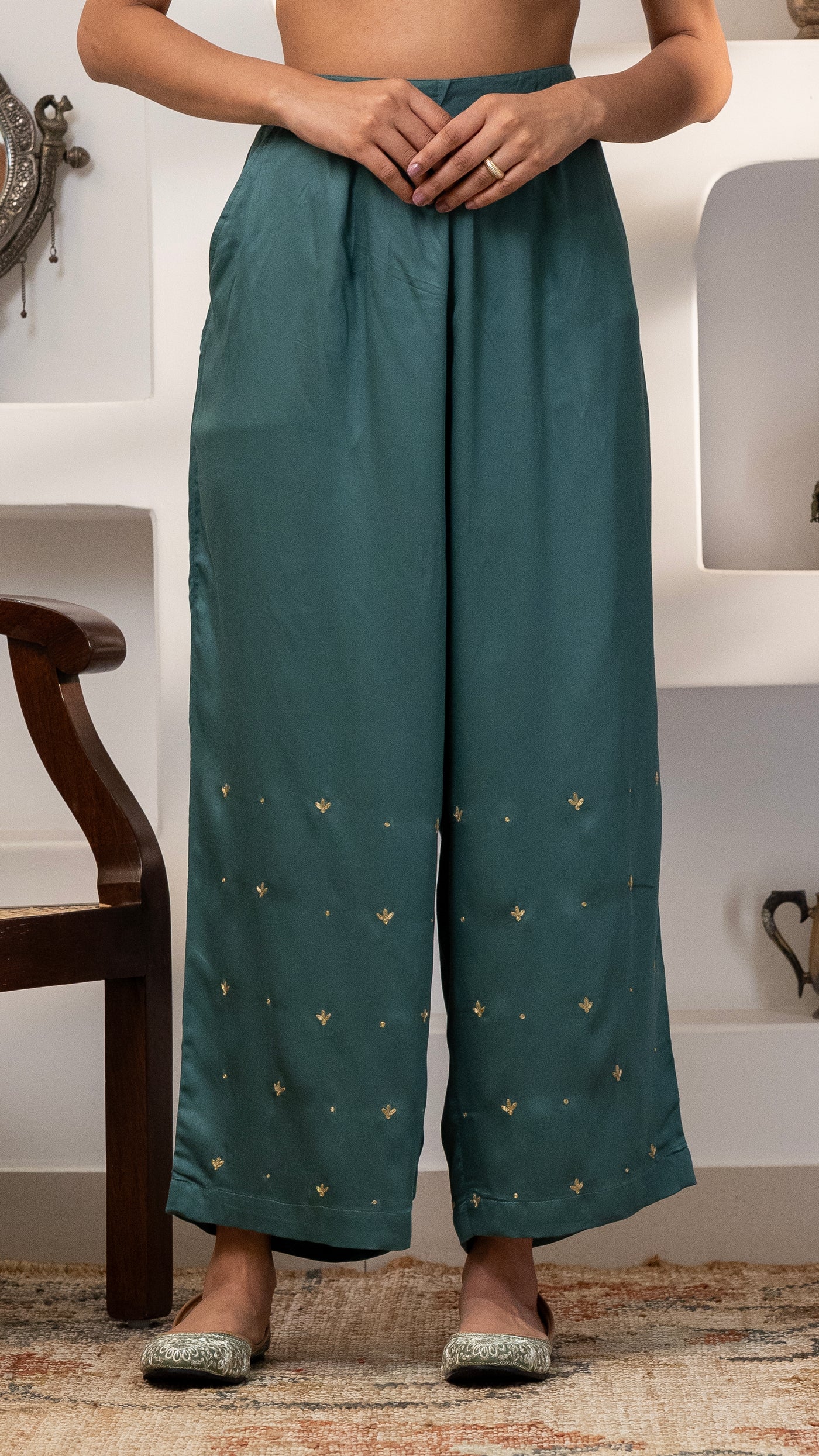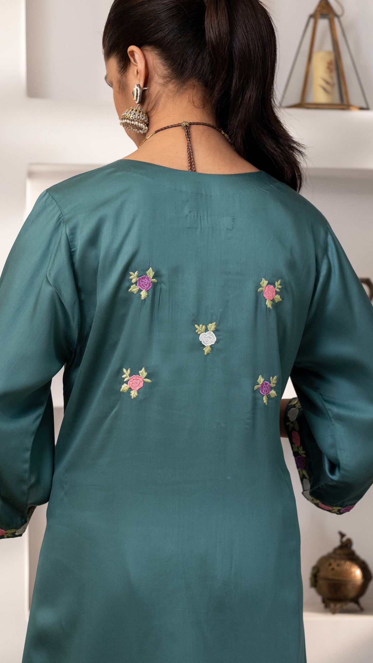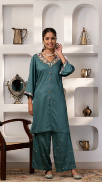 A pure modal silk kurta with appliqué embroidery on the yoke and tilla embroidery detailing is paired with pants with tilla embroidery and pocket.