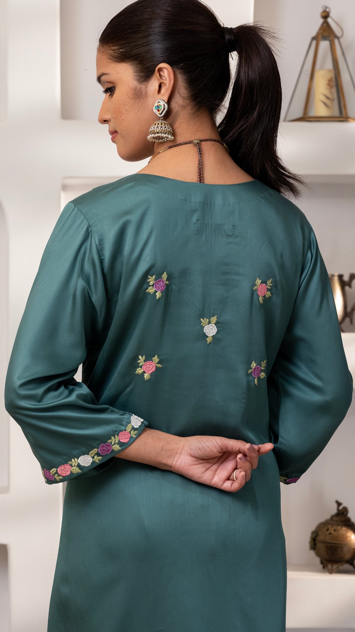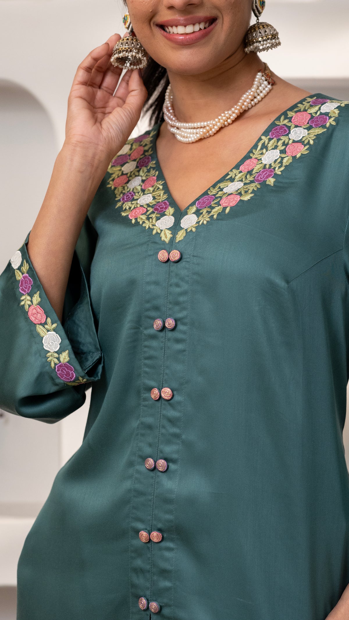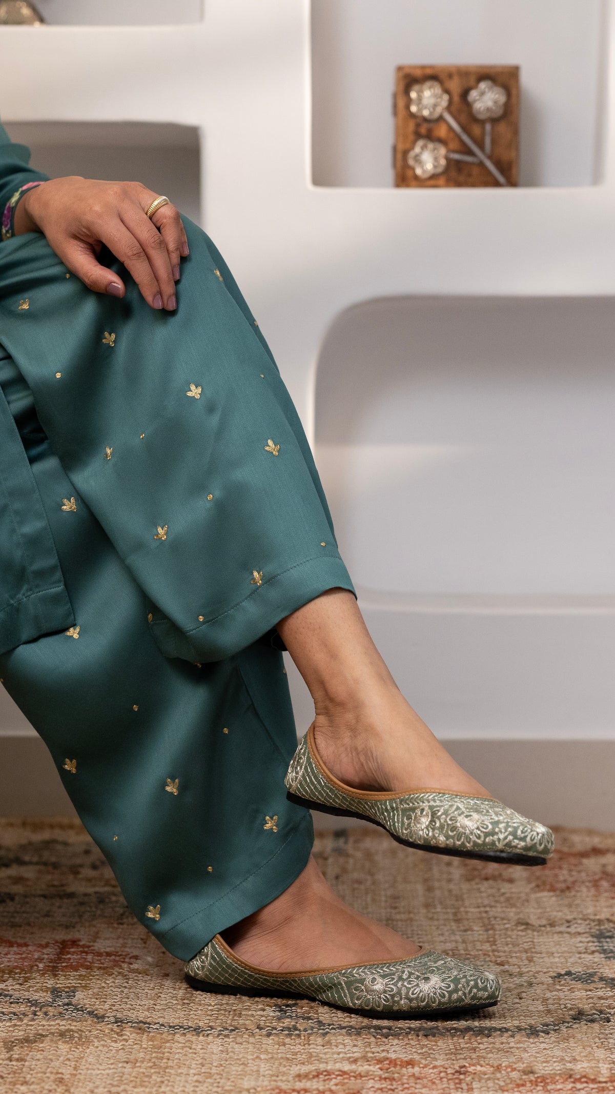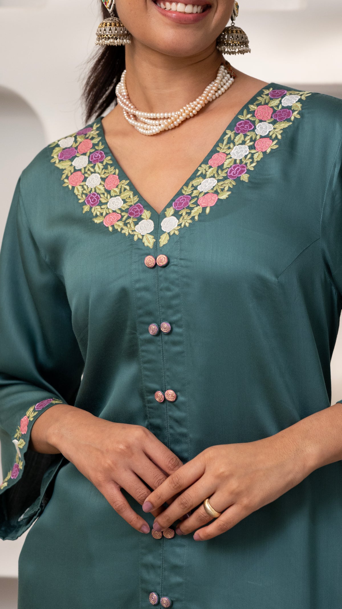 A pure modal silk kurta with appliqué embroidery on the yoke and tilla embroidery detailing is paired with pants with tilla embroidery and pocket.