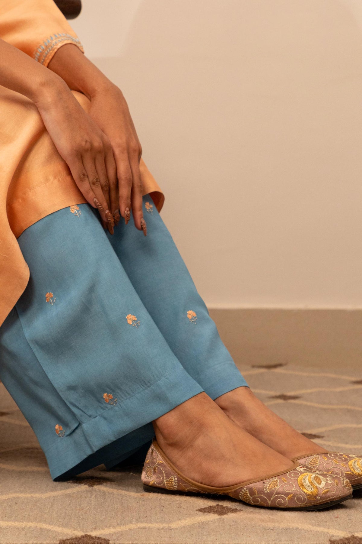 - Step into effortless elegance with these blue Chand Chanderi pants featuring intricate metallic tilla embroidery. Designed for a comfortable loose fit, perfect for festive and special occasions.