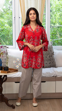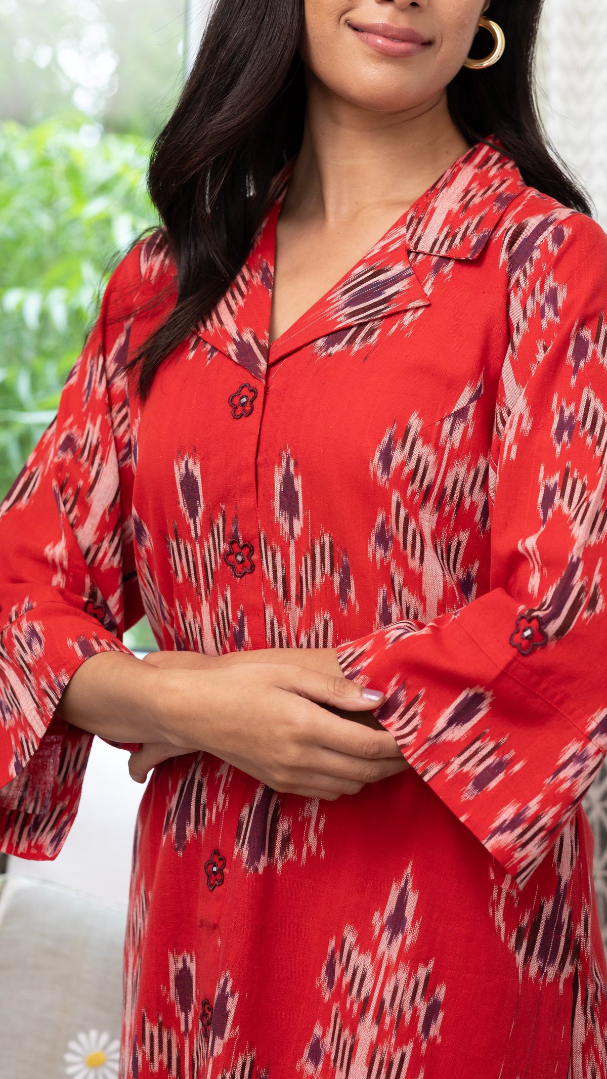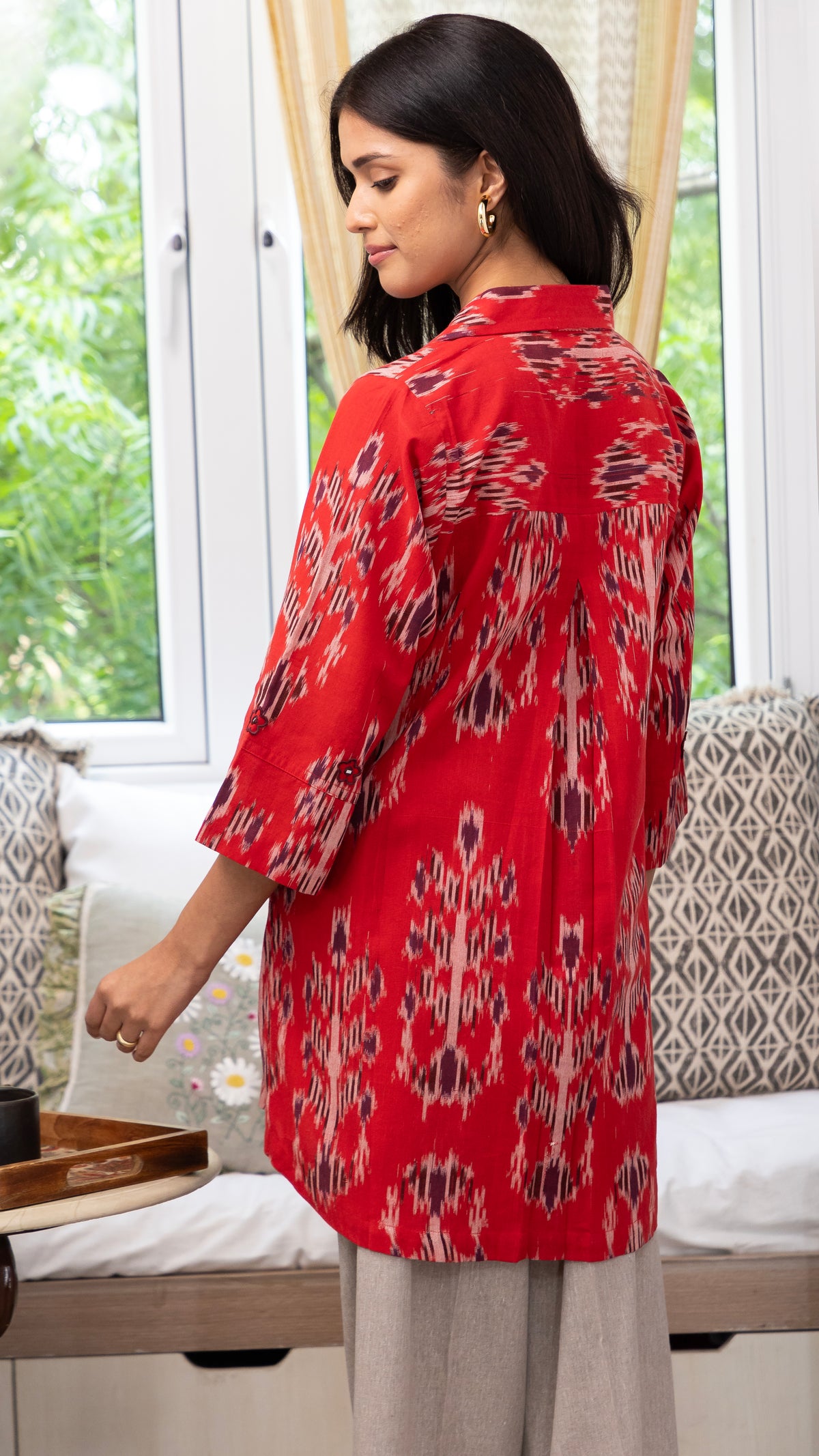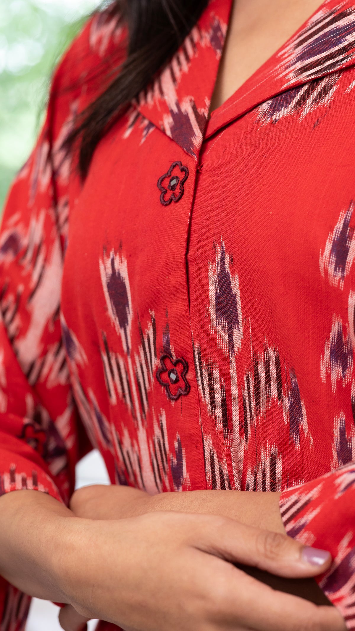 A pure handwoven cotton Ikkat top woven in Indonesian pattern with collar and applique embroidered flowers detailing. Length of the top is 32in .