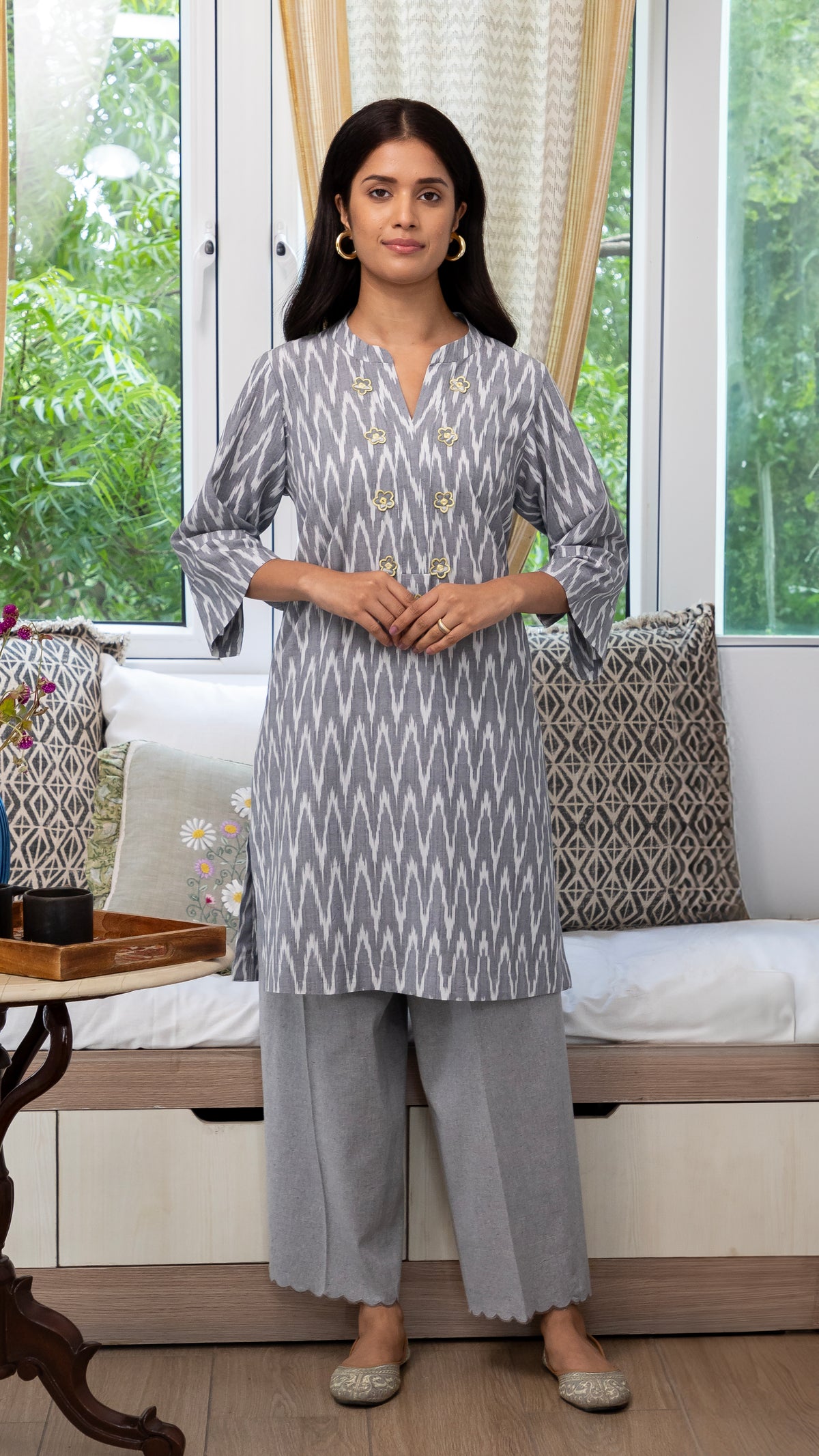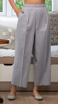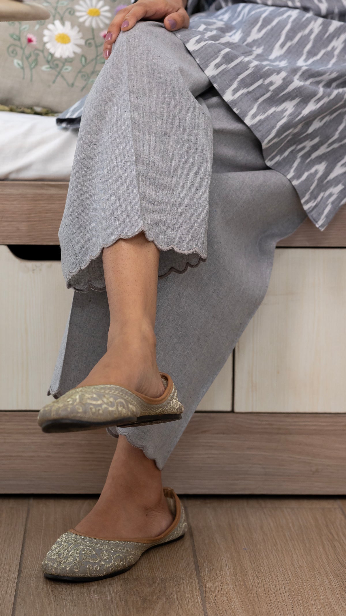 A pure cotton pant with pocket and scallop detailing. The length is customisable.
