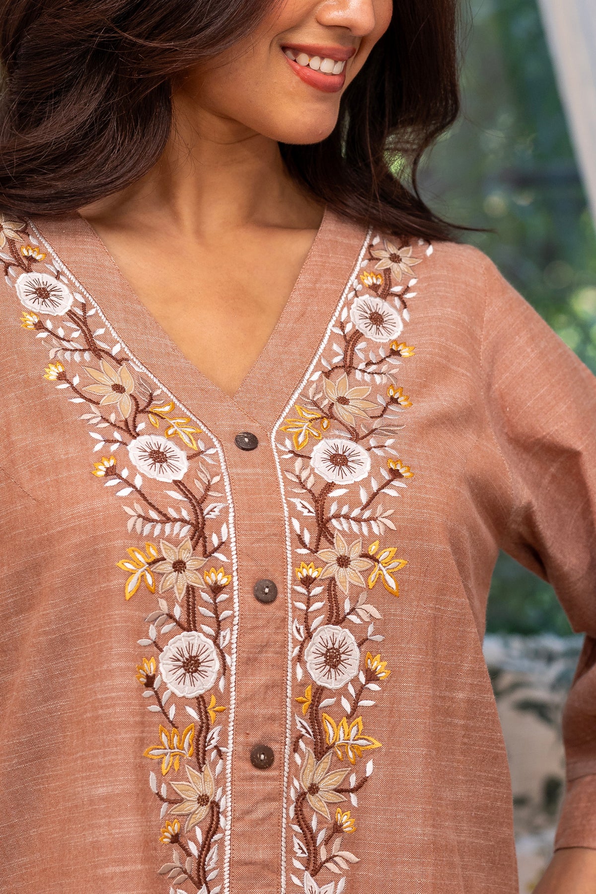 Warm, graceful, and effortlessly refined, the Autumn Bloom Co-ord Set reflects the beauty of delicate florals blossoming in earthy autumn tones. Crafted in handwoven khadi and adorned with intricate embroidery around the neckline, this ensemble blends heritage craftsmanship with timeless elegance.