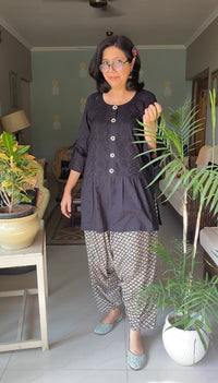 A black self chikan embroidered top with pleating, tie ups and appliqué flower buttons detailing. Length of the top is 32in .