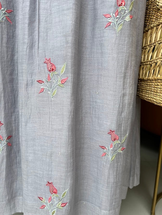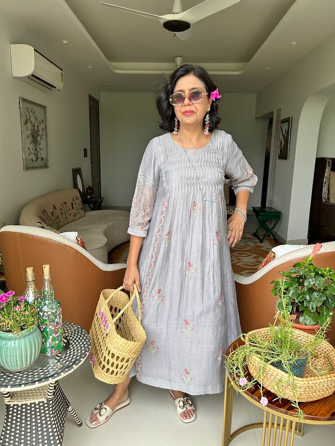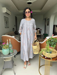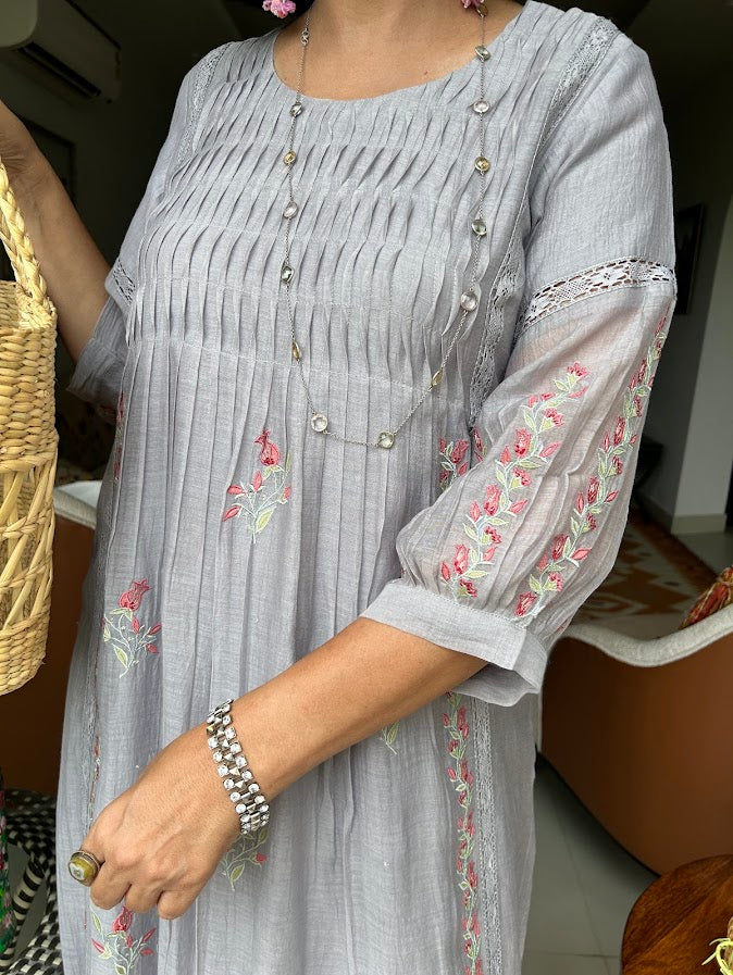 A pure soft muslin dress with floral thread embroidery with pleating detailing and pocket with lace