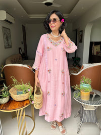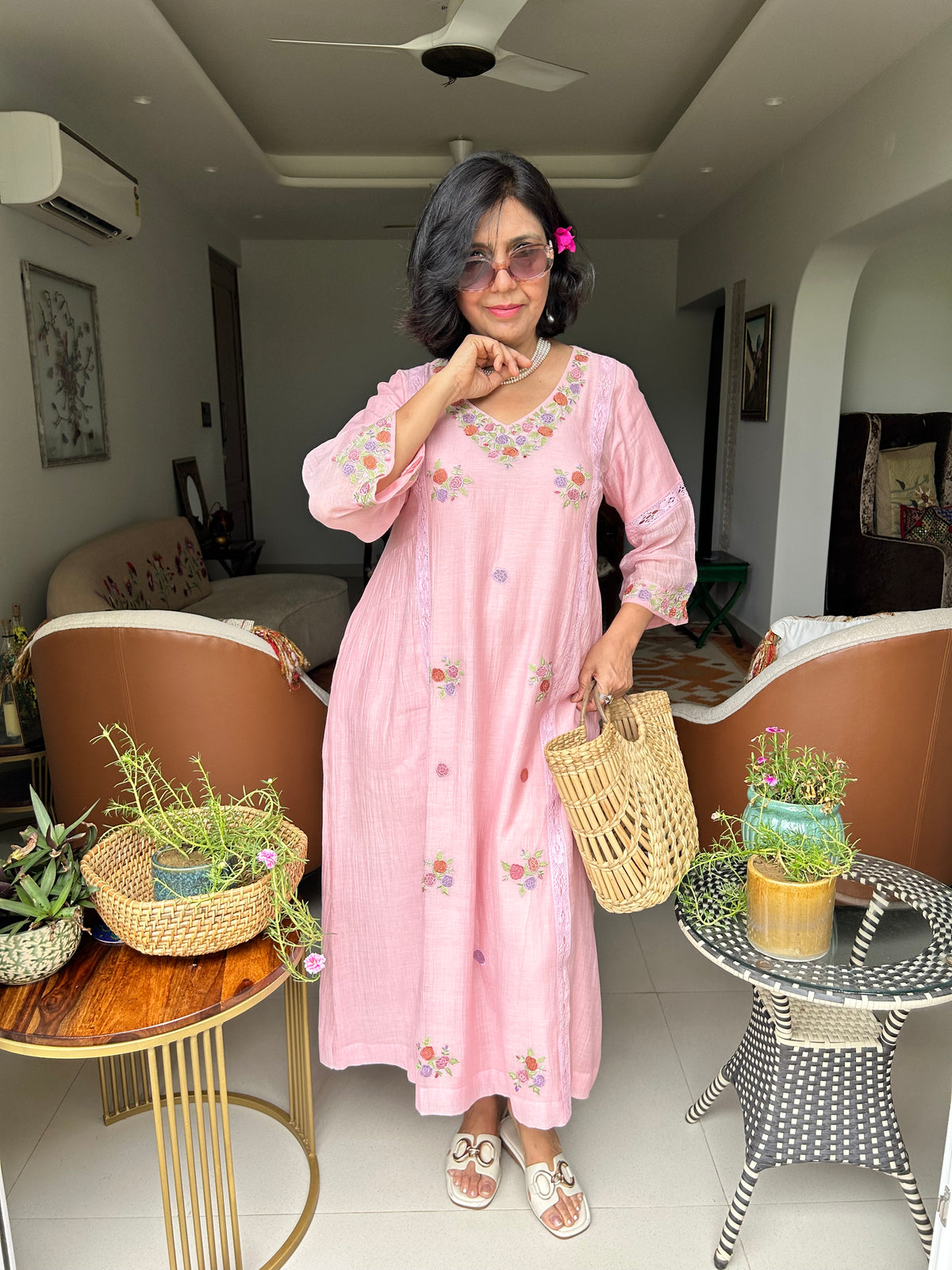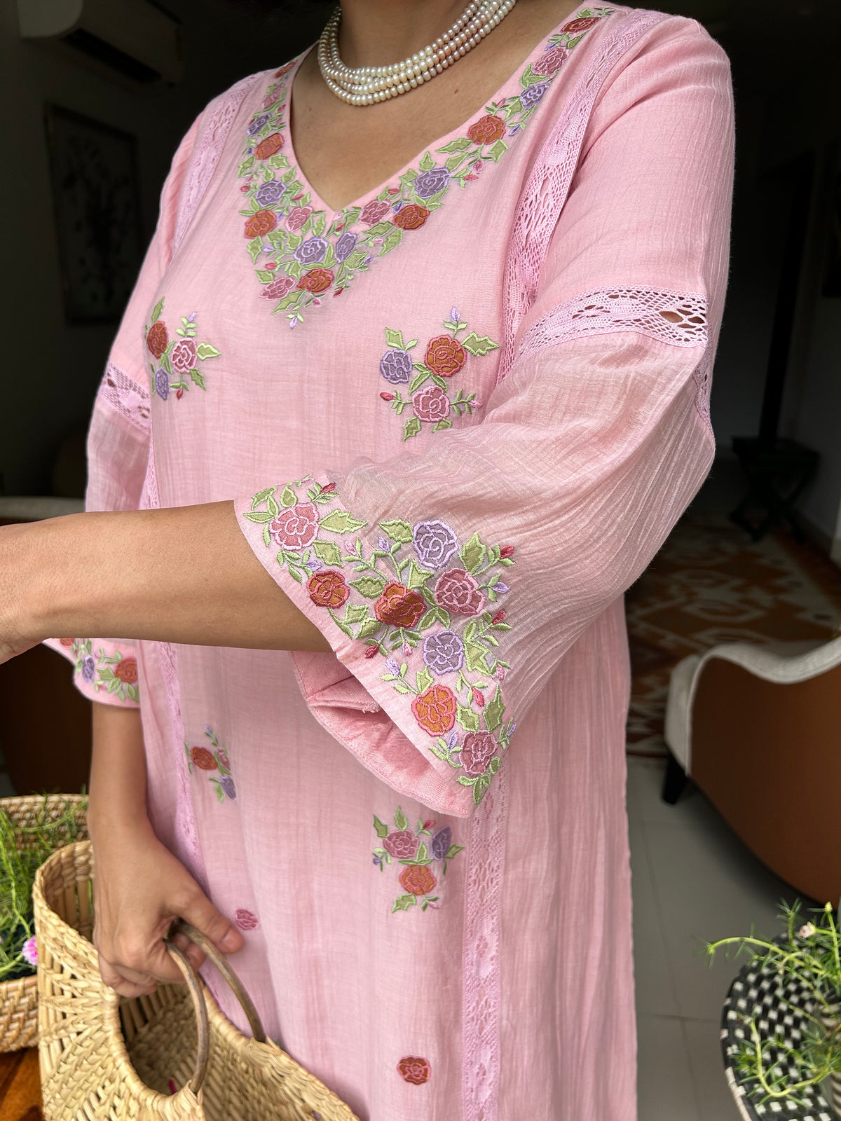 A pure muslin (cotton chanderi) dress/kurta with floralmulticoloured roses appliqué embroidery with lace detailing and pleated sleeves.
