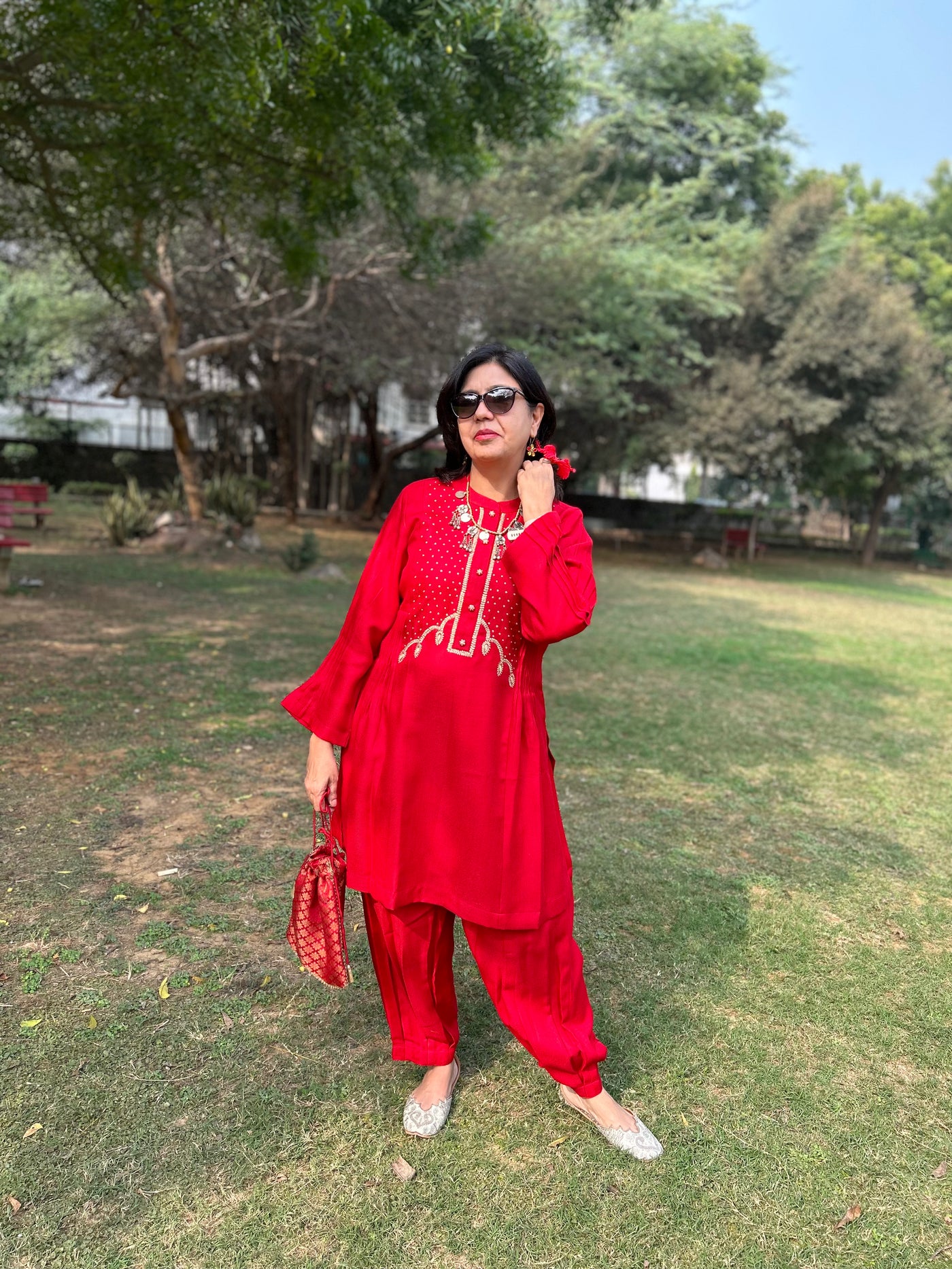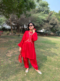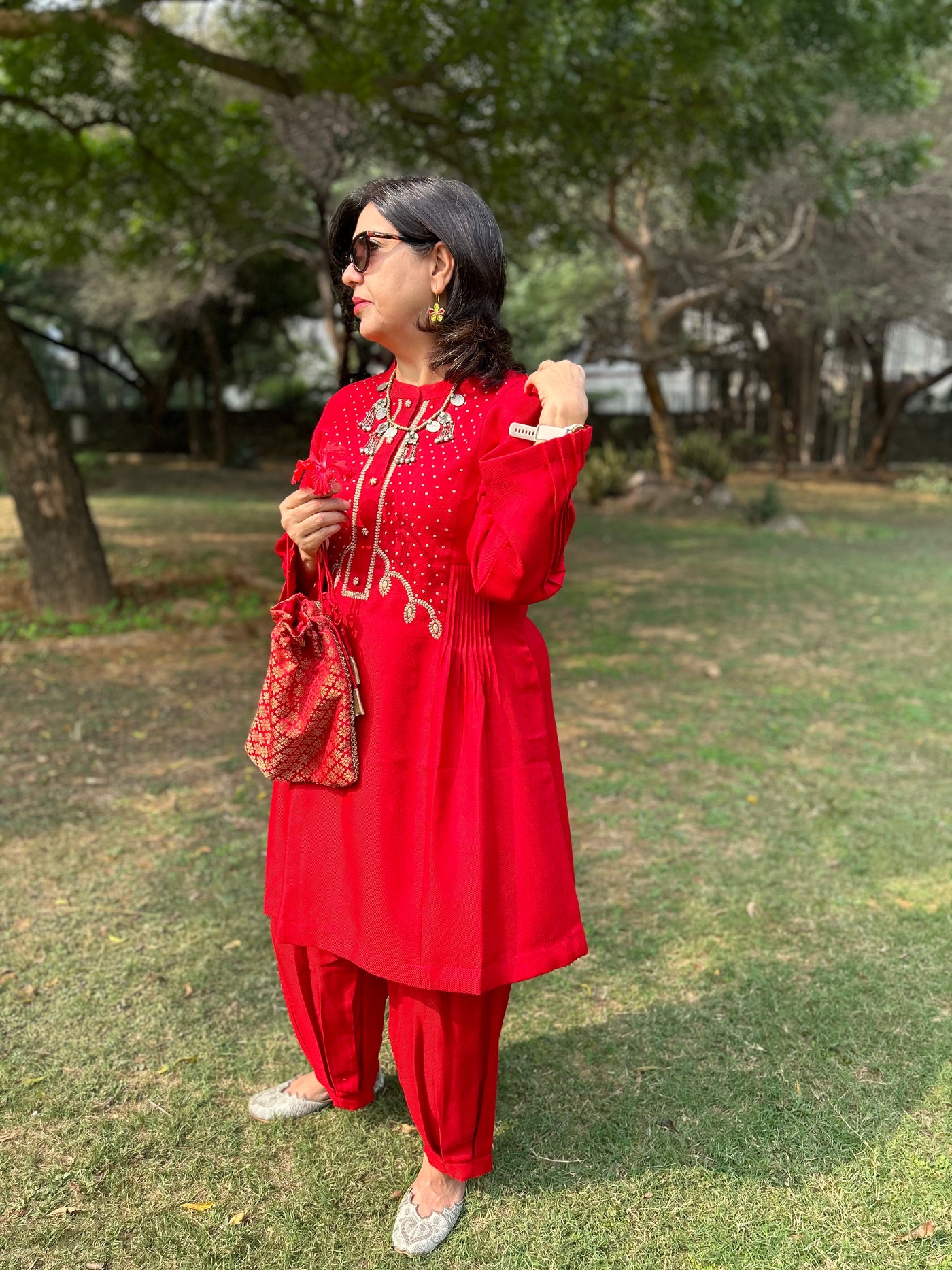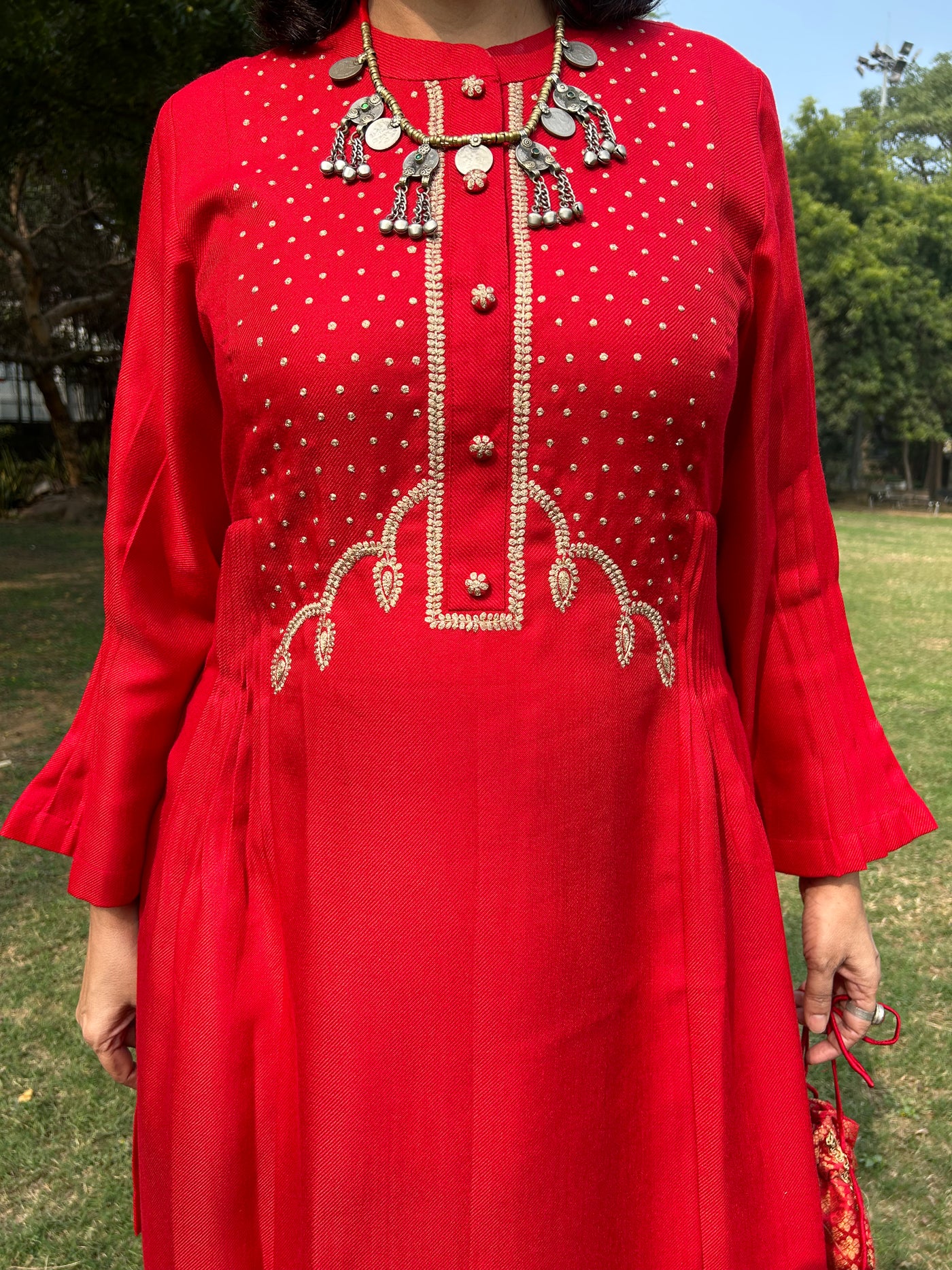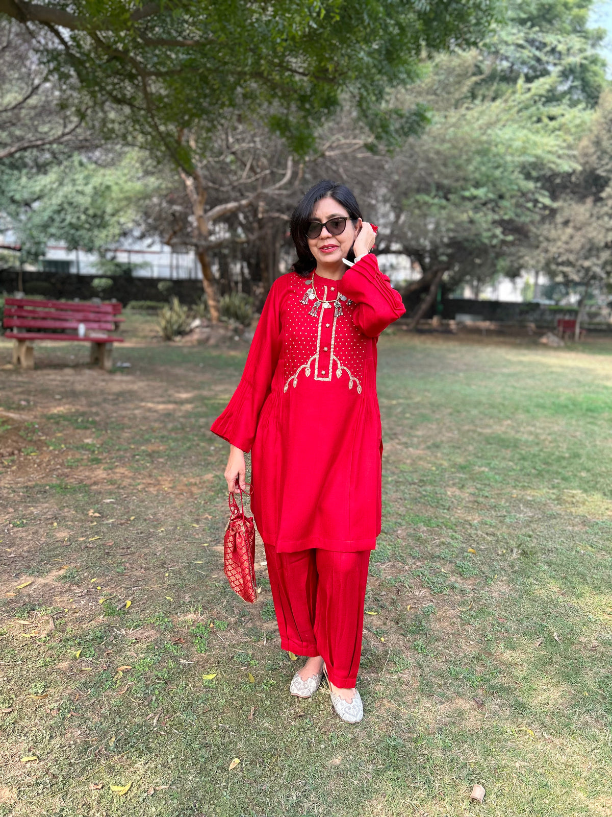 A spun wool blend co ord set with intricate Tilla embroidery, pleating detailing is paired with a pant salwar with pocket.