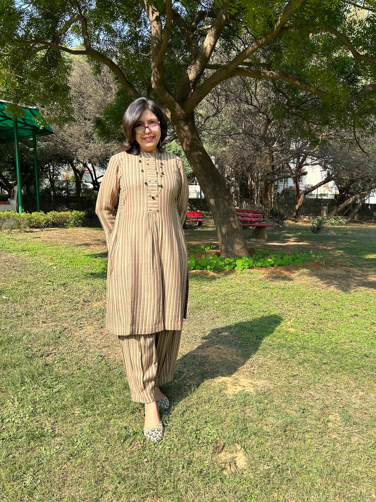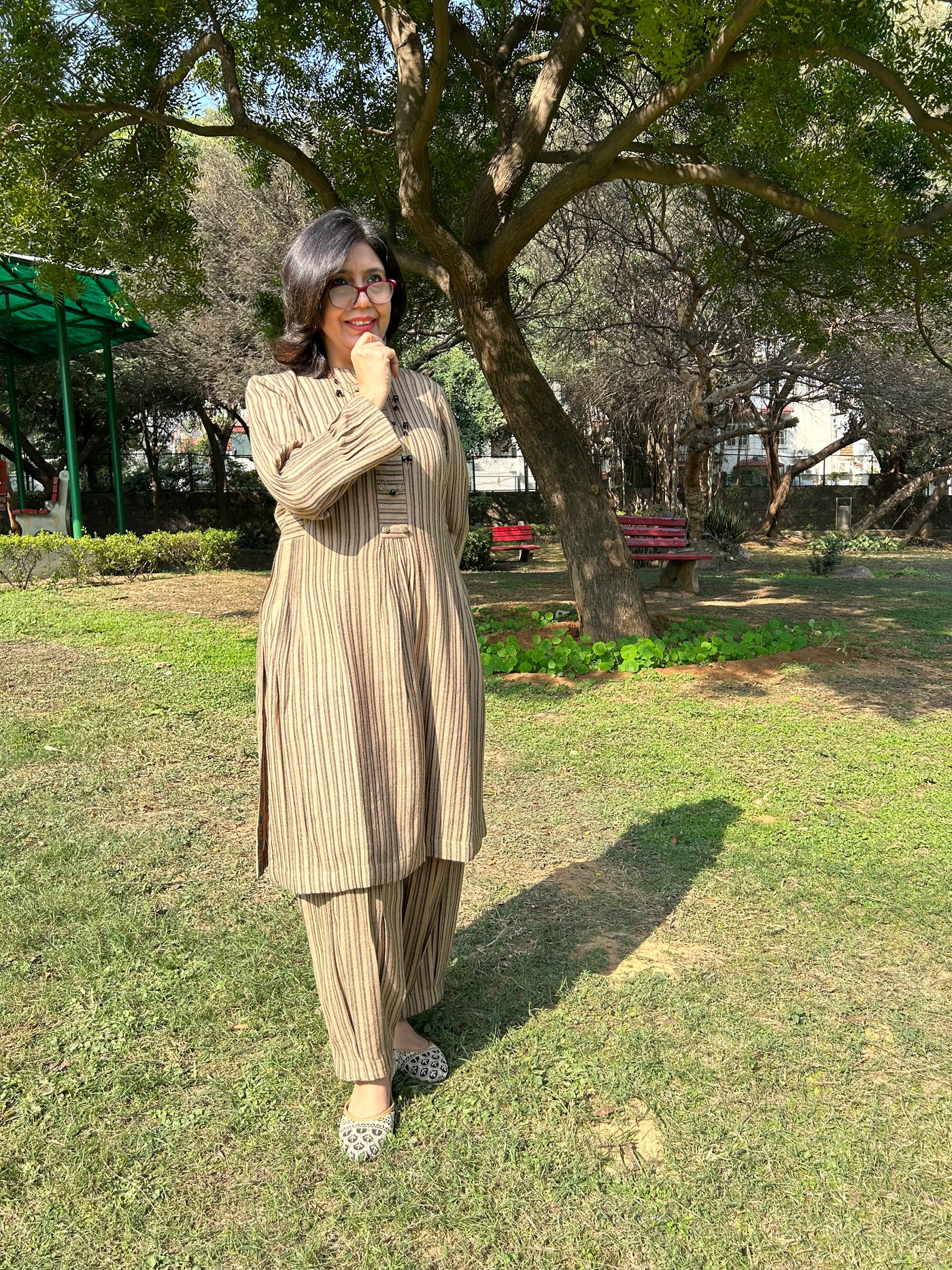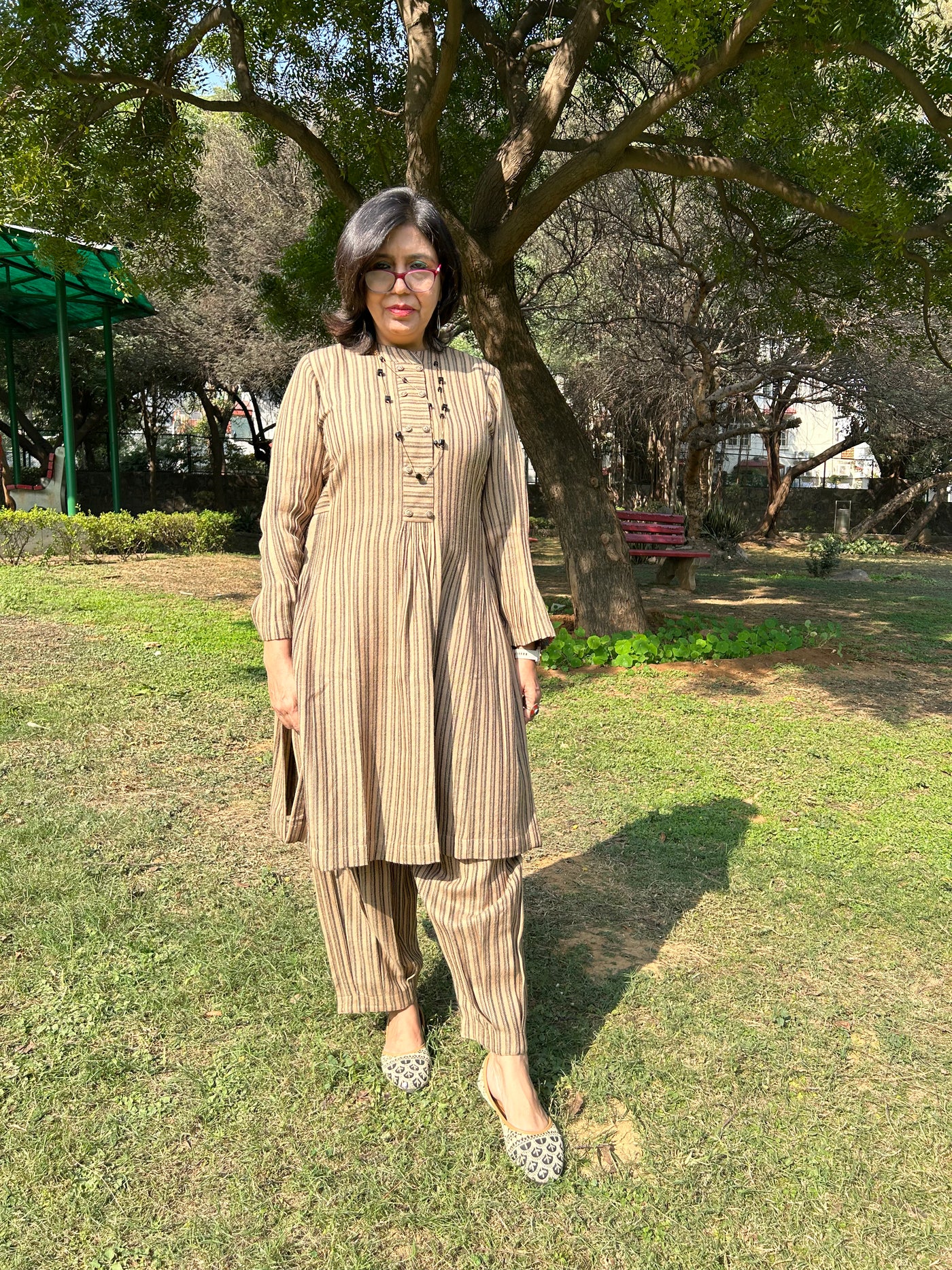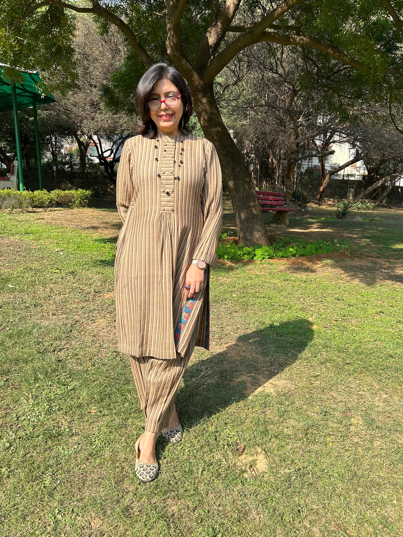 A pure merino wool Co ord set especially woven for indie cotton route by the skilled women weavers from the beautiful Kullu valley has a beautiful texture and fall. The Co ord set is striped with pleating detailing, contrasting soft Handblockprinted cotton facing and is paired with a pleated pant salwar.