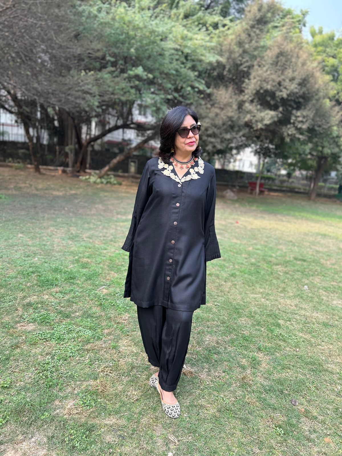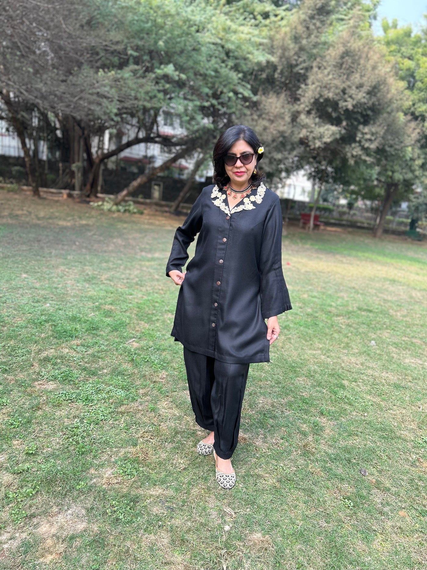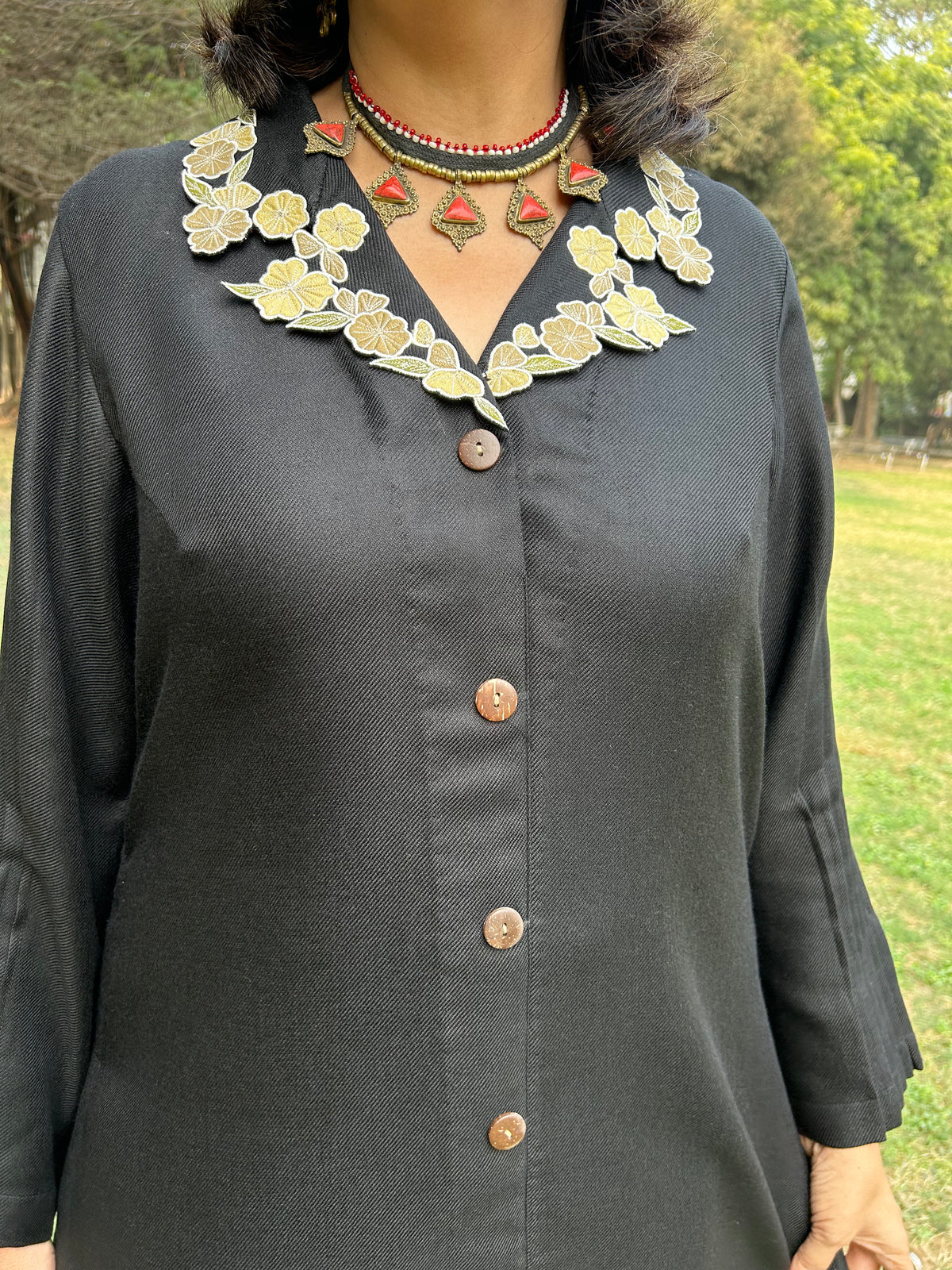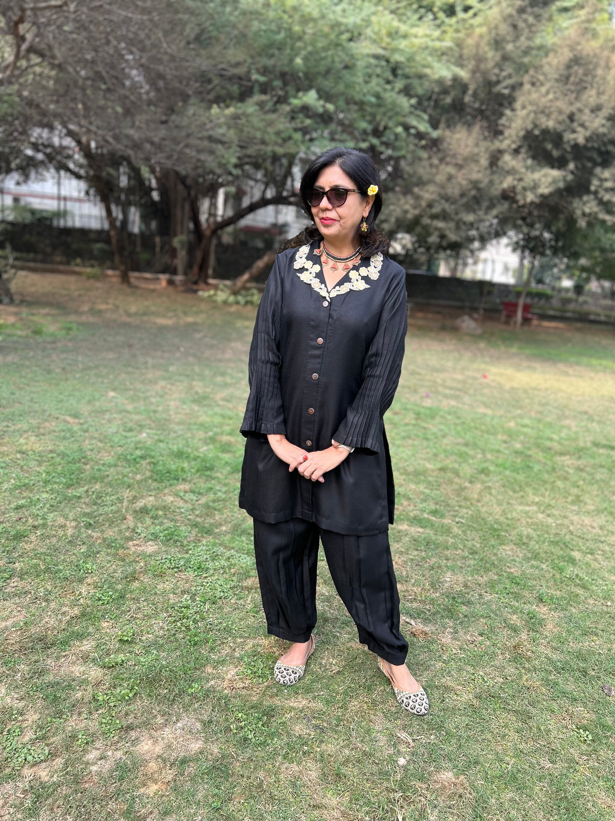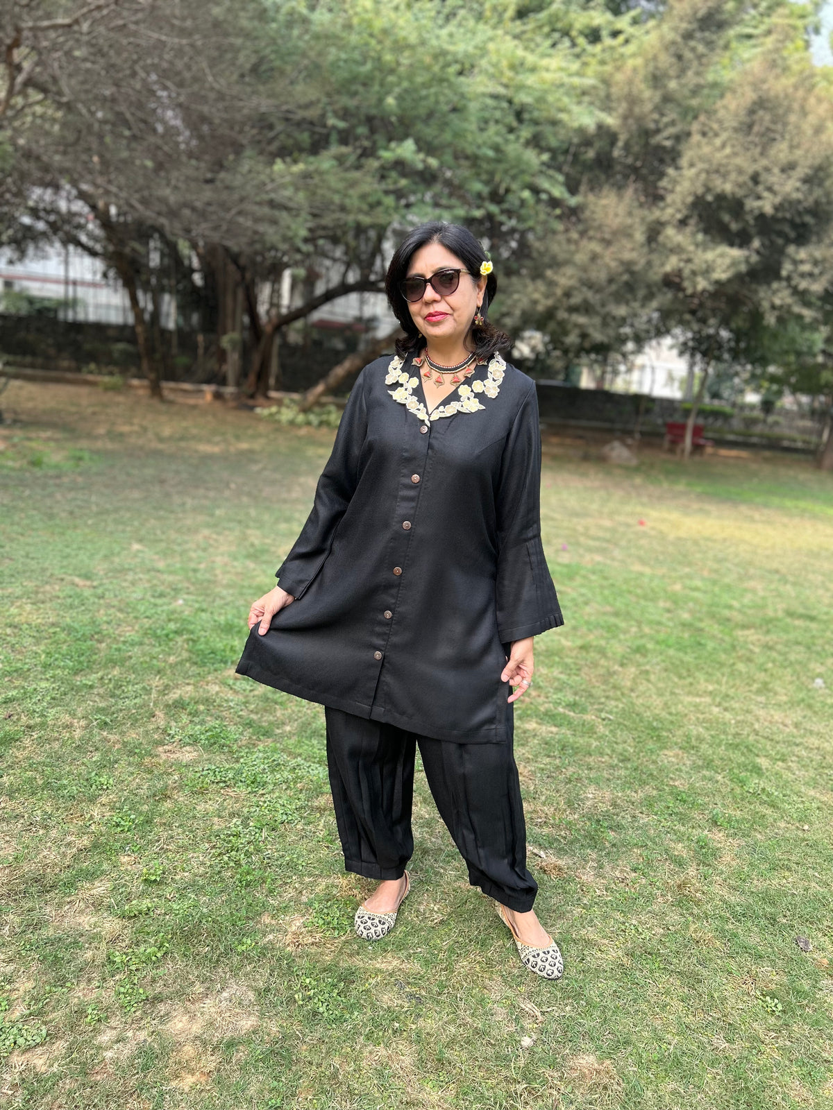 A spun wool blend Co ord set with floral appliqué embroidery on the collar, pleating detailing is paired with a pleated pant salwar with pocket.