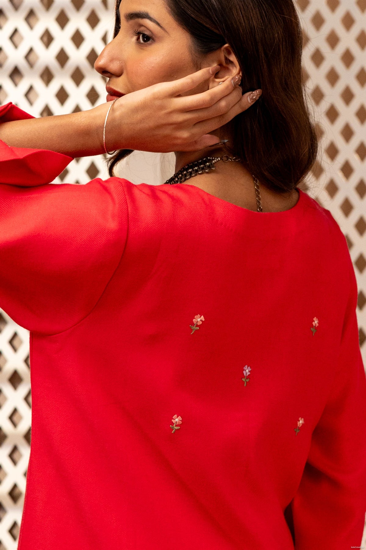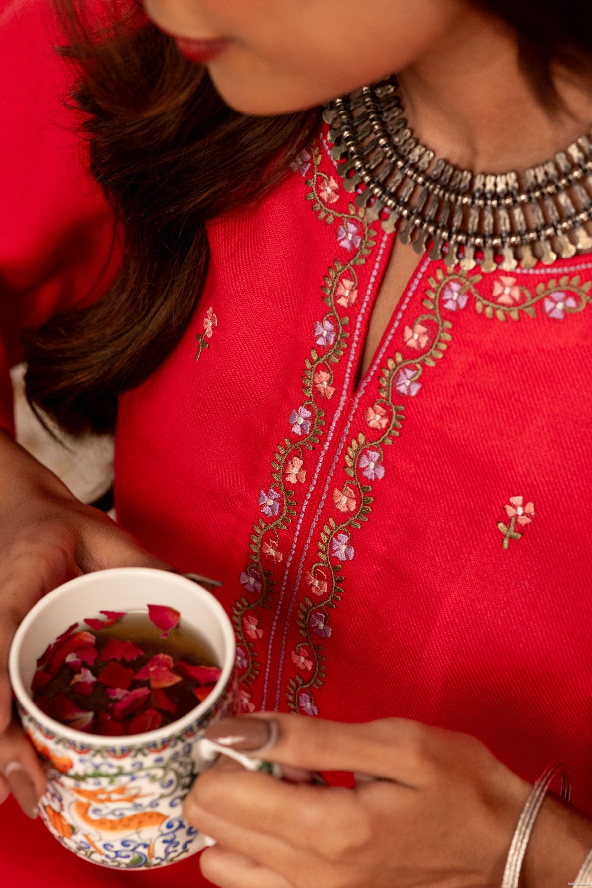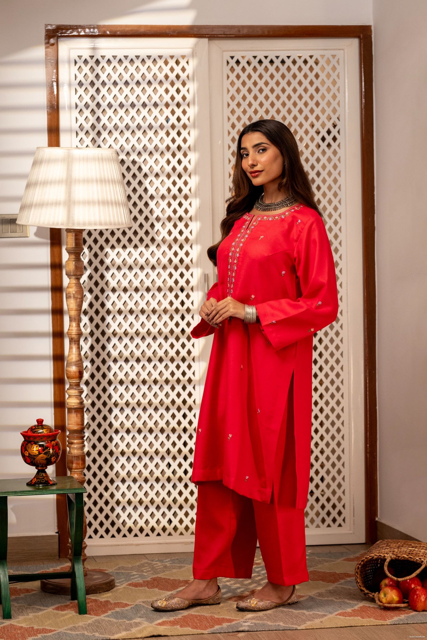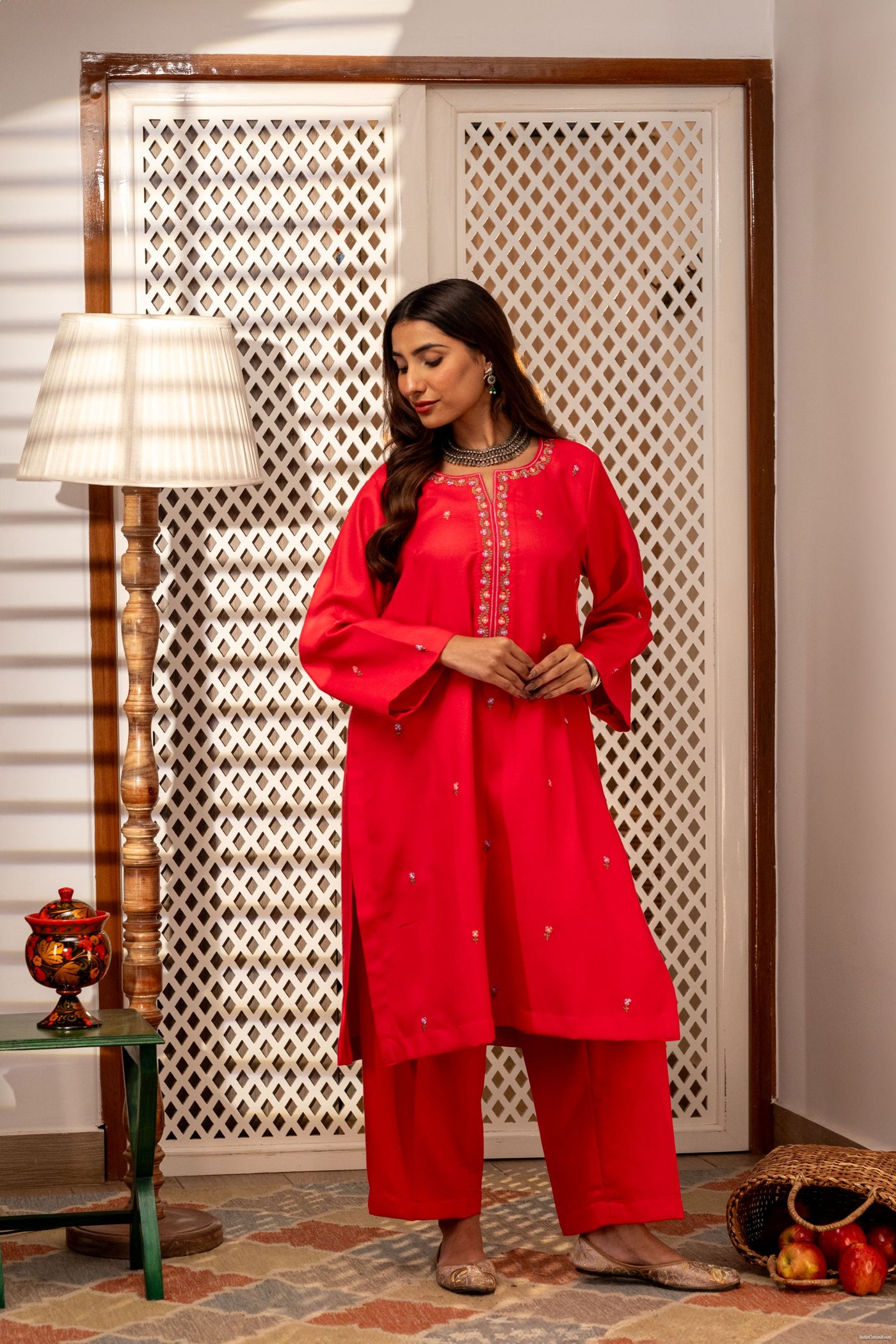 The Mulberry Co-ord Set is an exquisite winter essential designed to elevate your everyday wardrobe with effortless luxury. Crafted in a rich mulberry red hue from premium winter-spun fabric, this co-ord set features a long kurta with a round slit neckline adorned with intricate thread embroidery. Delicate embroidery booties trace the hem, sleeves, and yoke, creating a sophisticated and elegant silhouette. The matching pants in the same fabric complete the ensemble, making it perfect for winter outings, festive lunches, dinner parties, or office occasions. This set combines comfort, elegance, and a touch of color, making it a standout choice for your winter wardrobe.