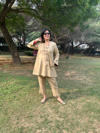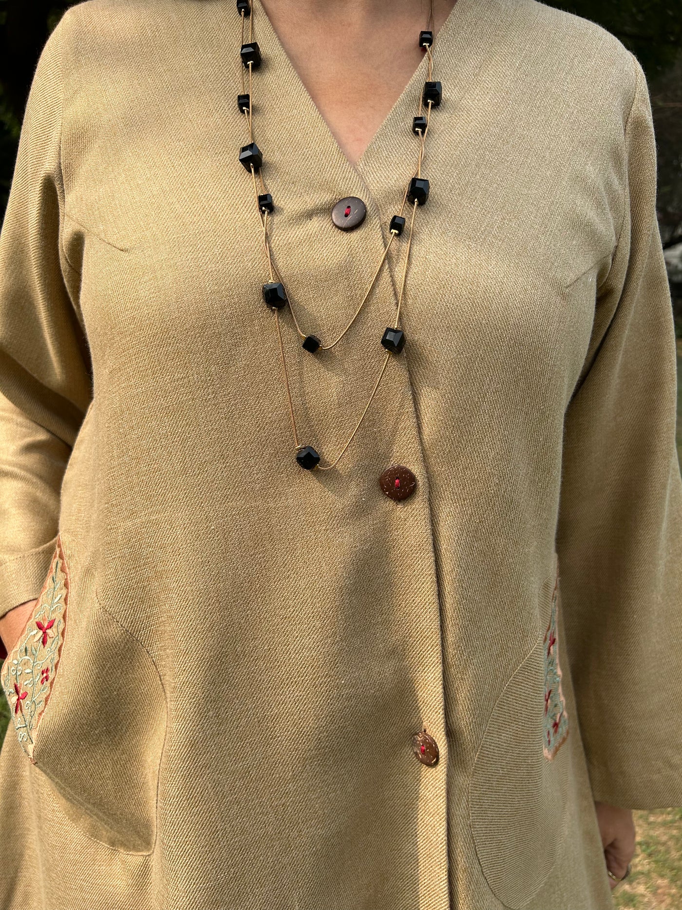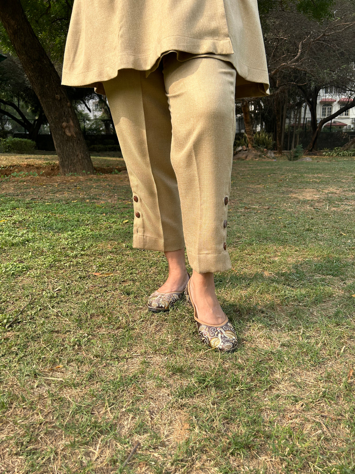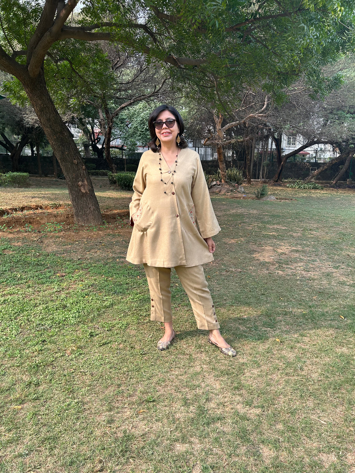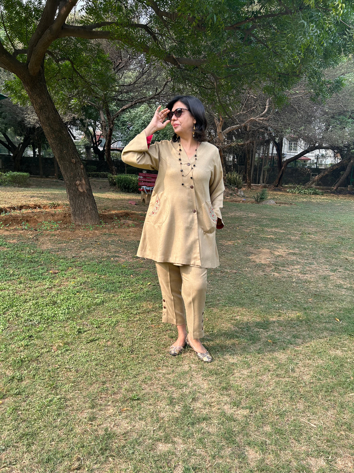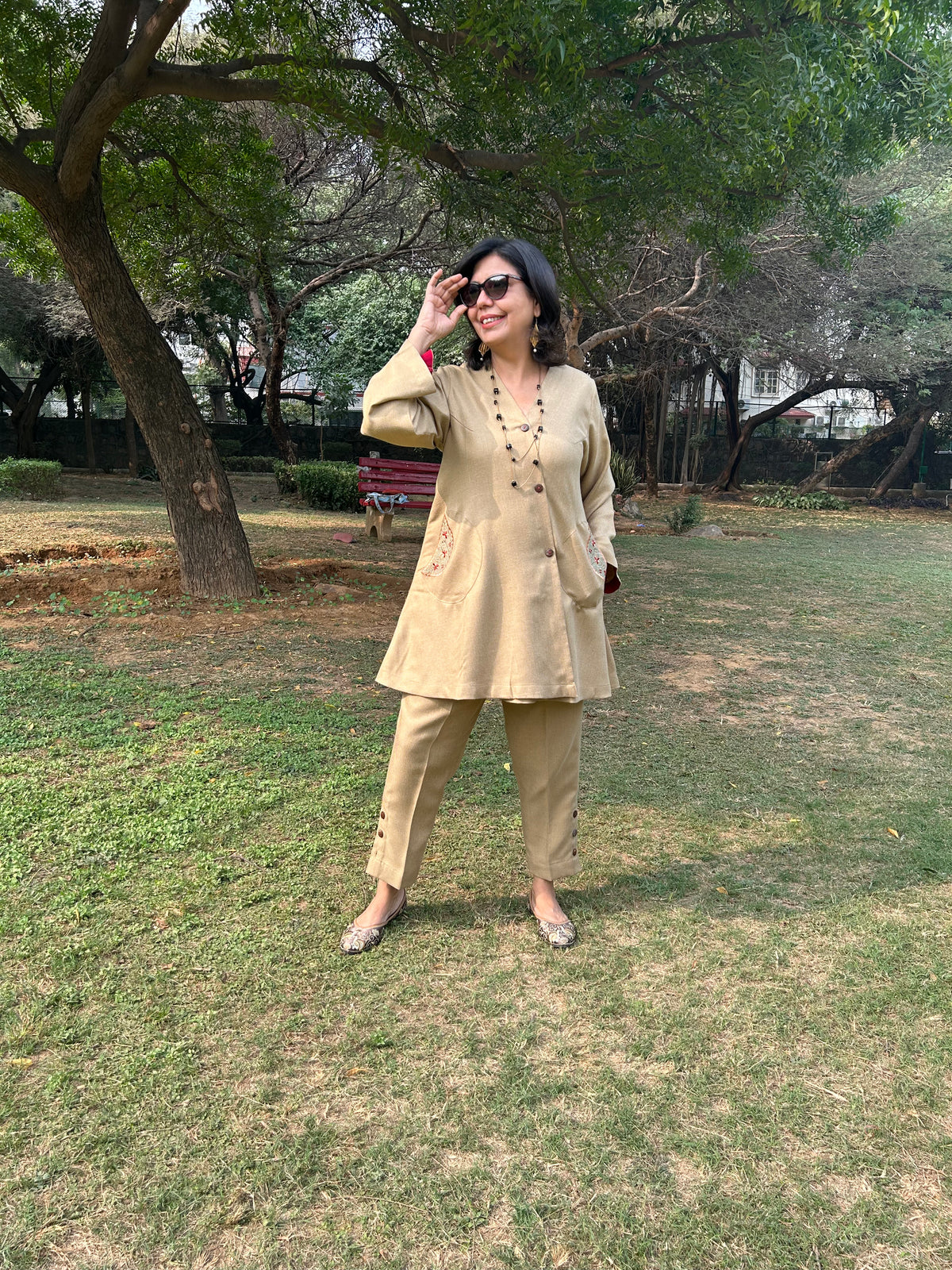 A spun wool blend Co ord set with overlap style with buttons which can be worn as a top or open it up to wear as a jacket with embroidered pockets is paired with narrow pants with side buttons and contrasting facing.