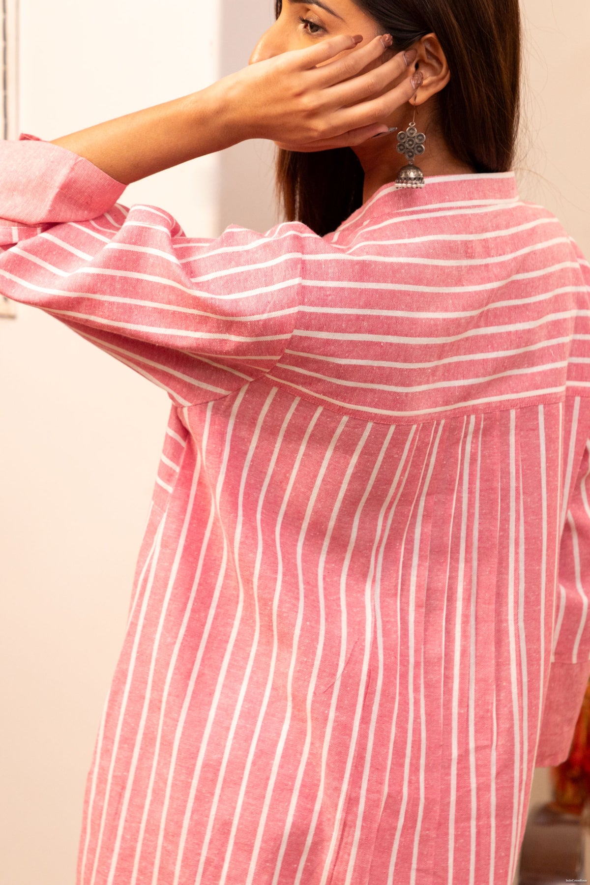 Effortlessly playful and chic, this pink-and-white striped co-ord set combines a top and pants, making it versatile for luxury everyday wear, vacations, office, or stylish outings. Intricate flower-button detailing and color-blocked sleeves elevate the look.