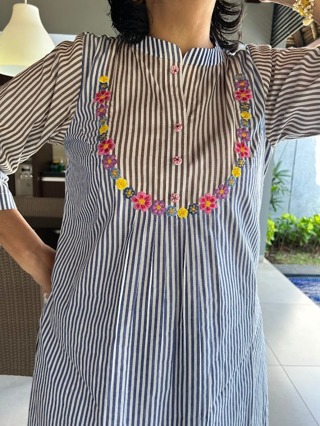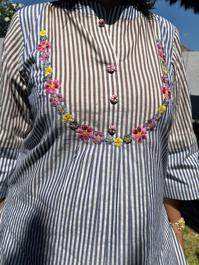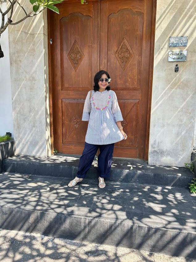 comfortable, vibrant and stylish cottons by Indie Cotton Route customised in your size at reasonable prices is the best way to be in your skin with stunning multicoloured thread embroidery is paired with pure cotton pleated pants