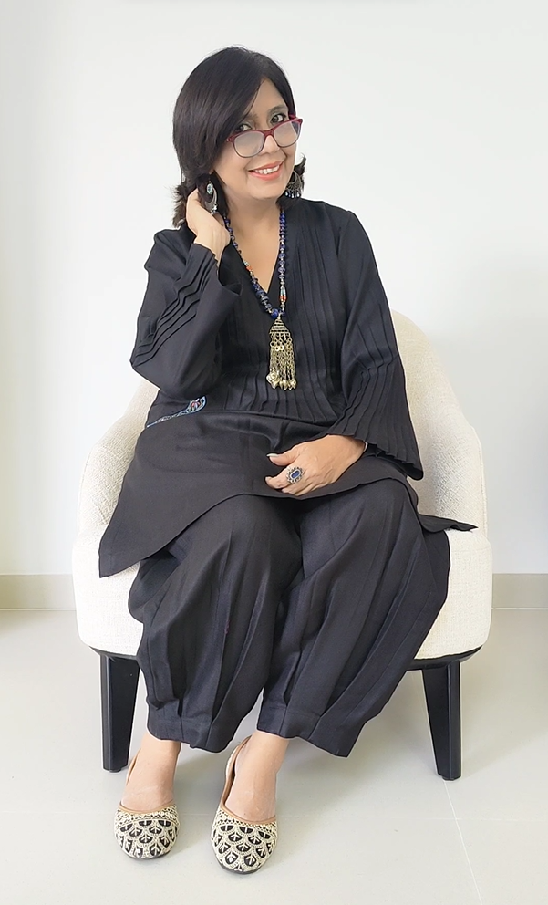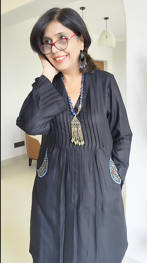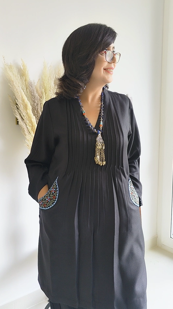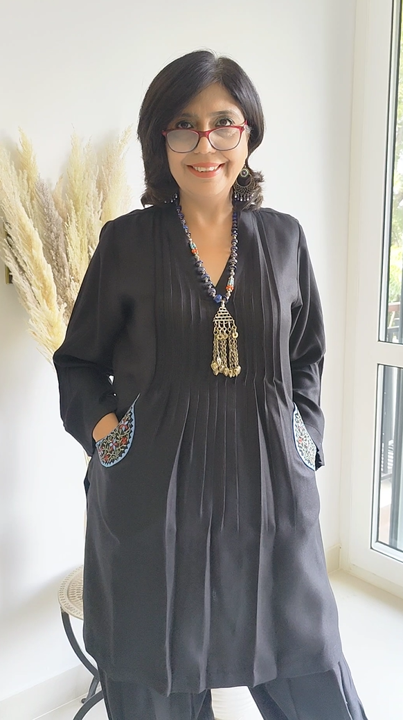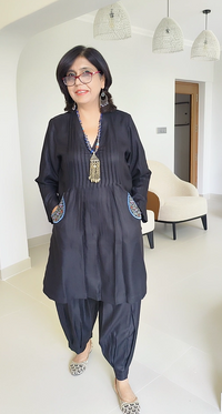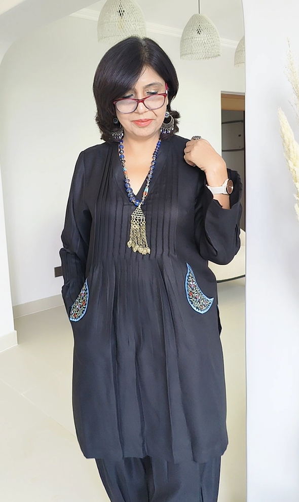 A spun wool blend Co ord set with pleating and embroidery detailing on the pockets is paired with a pleated pant salwar with pocket.