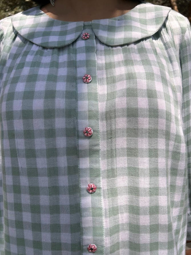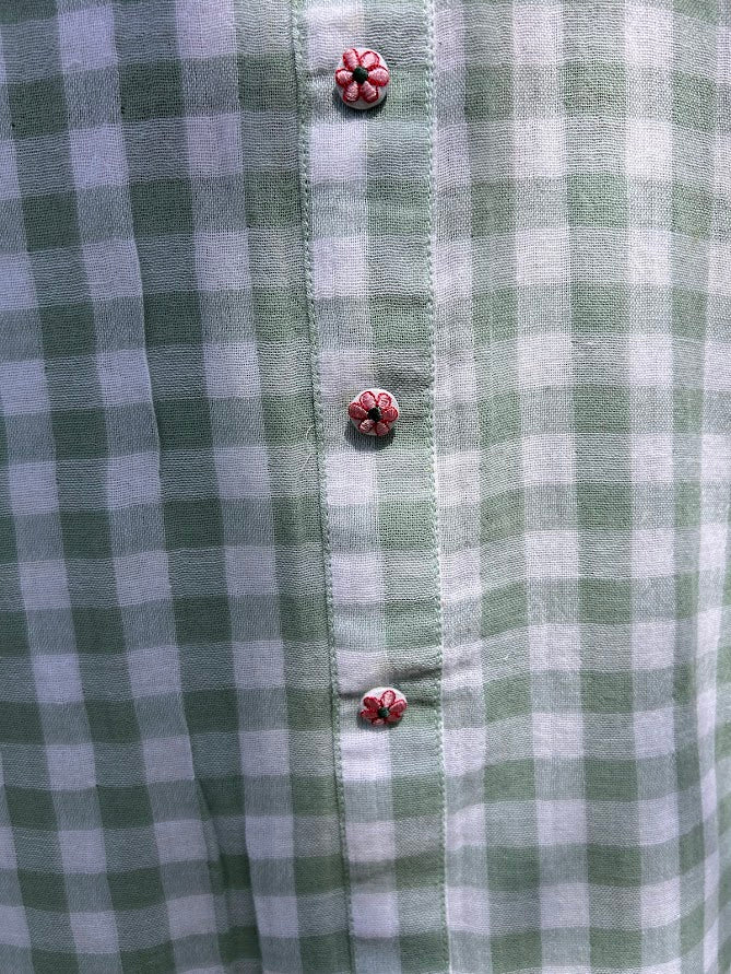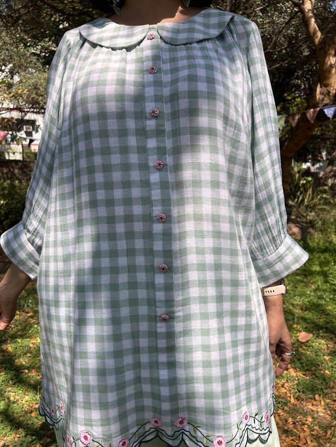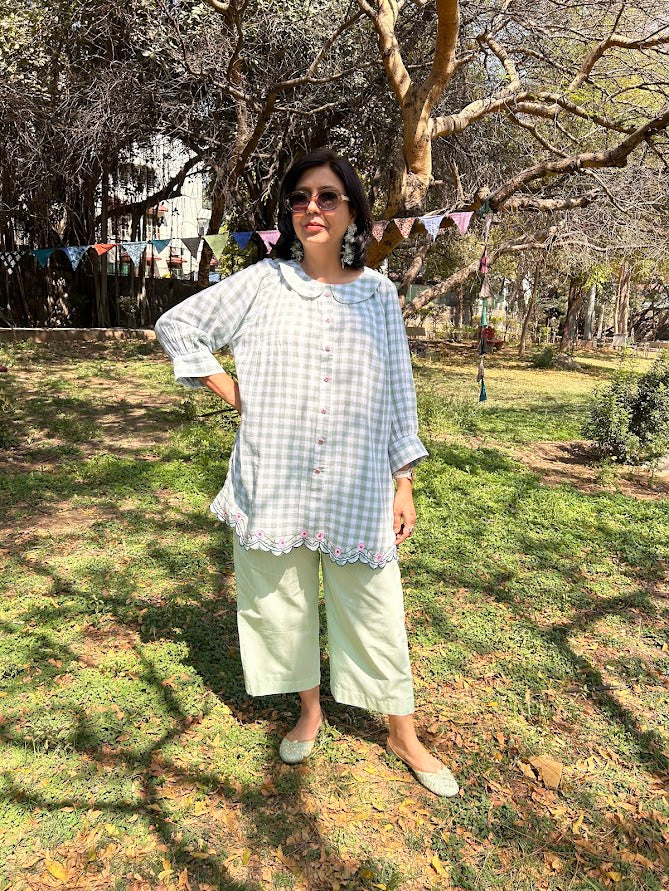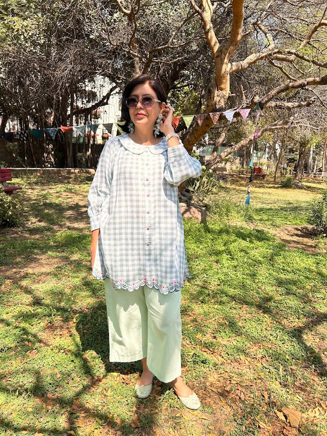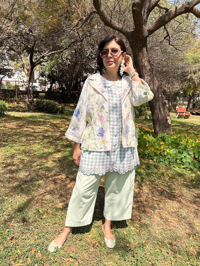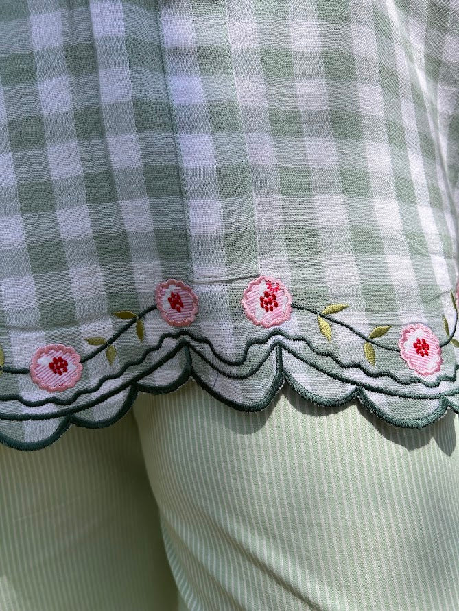 A soft checks pure cotton top with delicate floral thread embroidery is paired with striped pants with pocket.