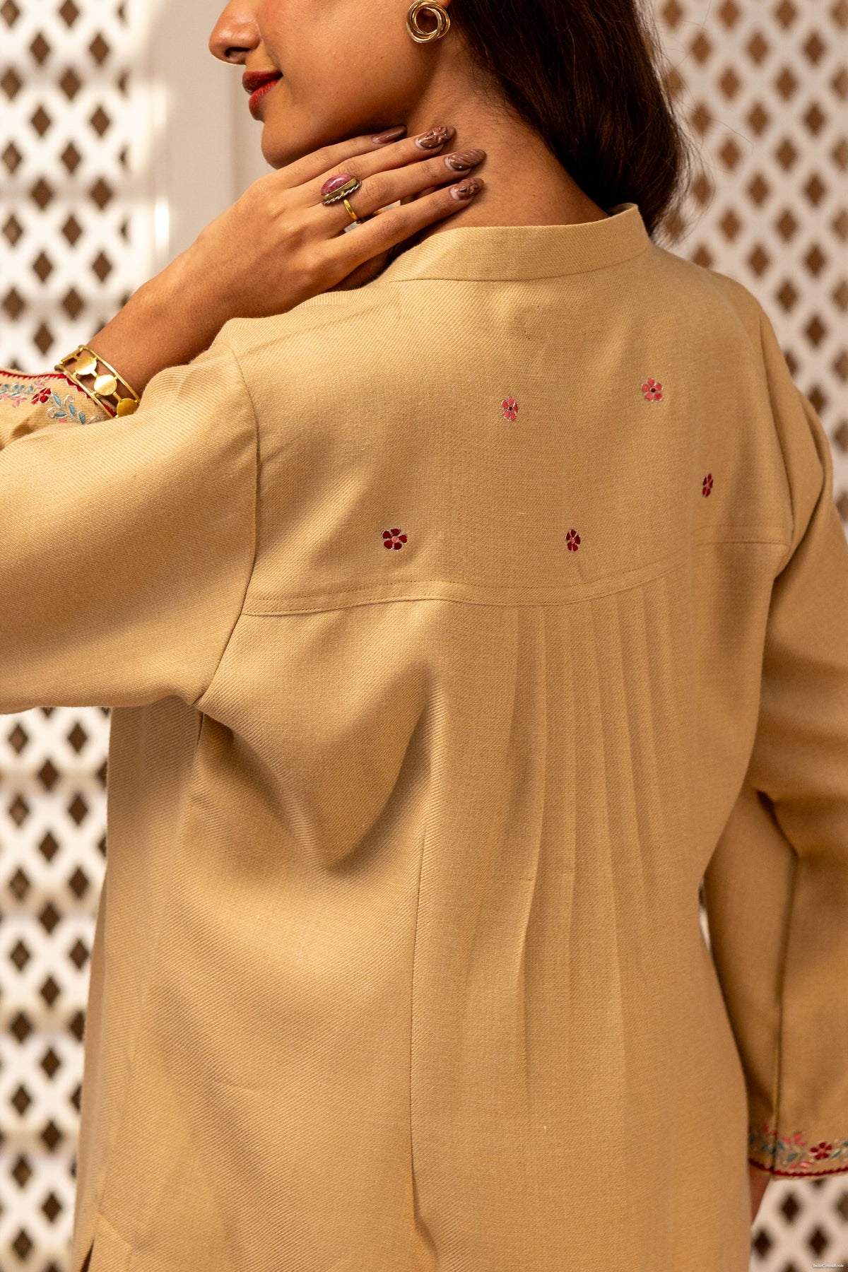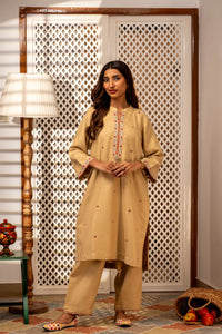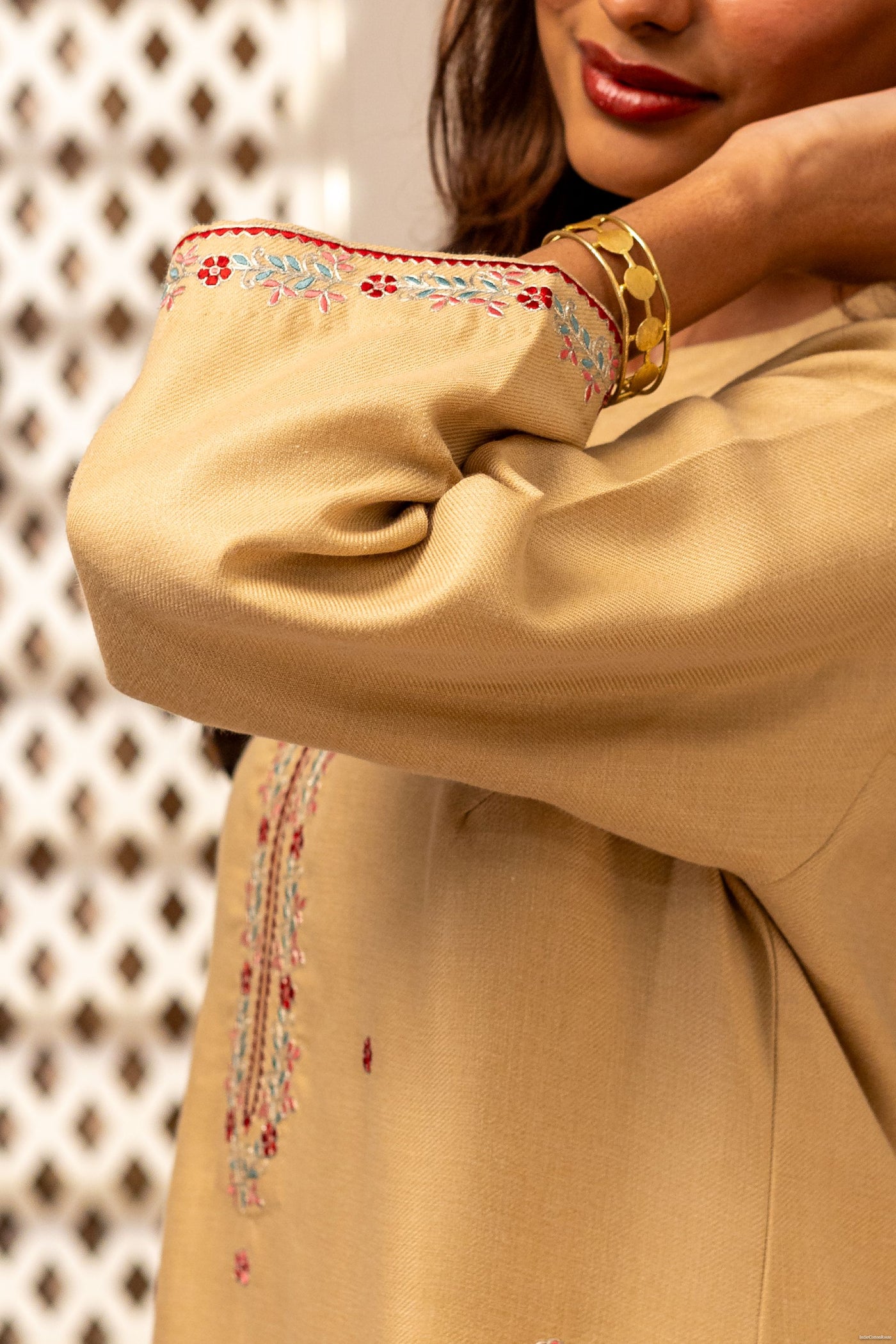 The Kanak Co-ord Set is a timeless blend of understated luxury and winter comfort. Crafted in a warm sand-brown hue from premium winter-spun fabric, this set captures the soft elegance of the season. The kurta features intricate tilla and thread embroidery on the neck and yoke with delicate floral booties scattered across the fabric. Subtle hints of red and blue threadwork add life to the earthy tone, making it look regal yet effortless. The straight-fit pants mirror the same embroidery finesse along the hem for a refined finish. It’s a graceful, warm, and versatile outfit that transitions beautifully from brunches to evening gatherings.