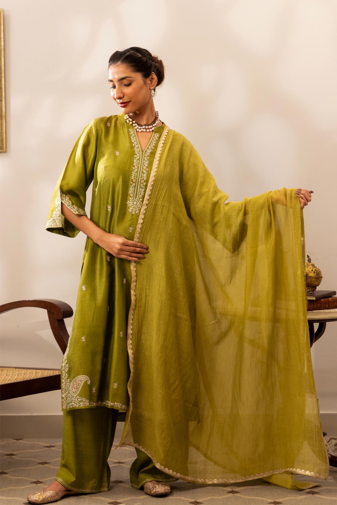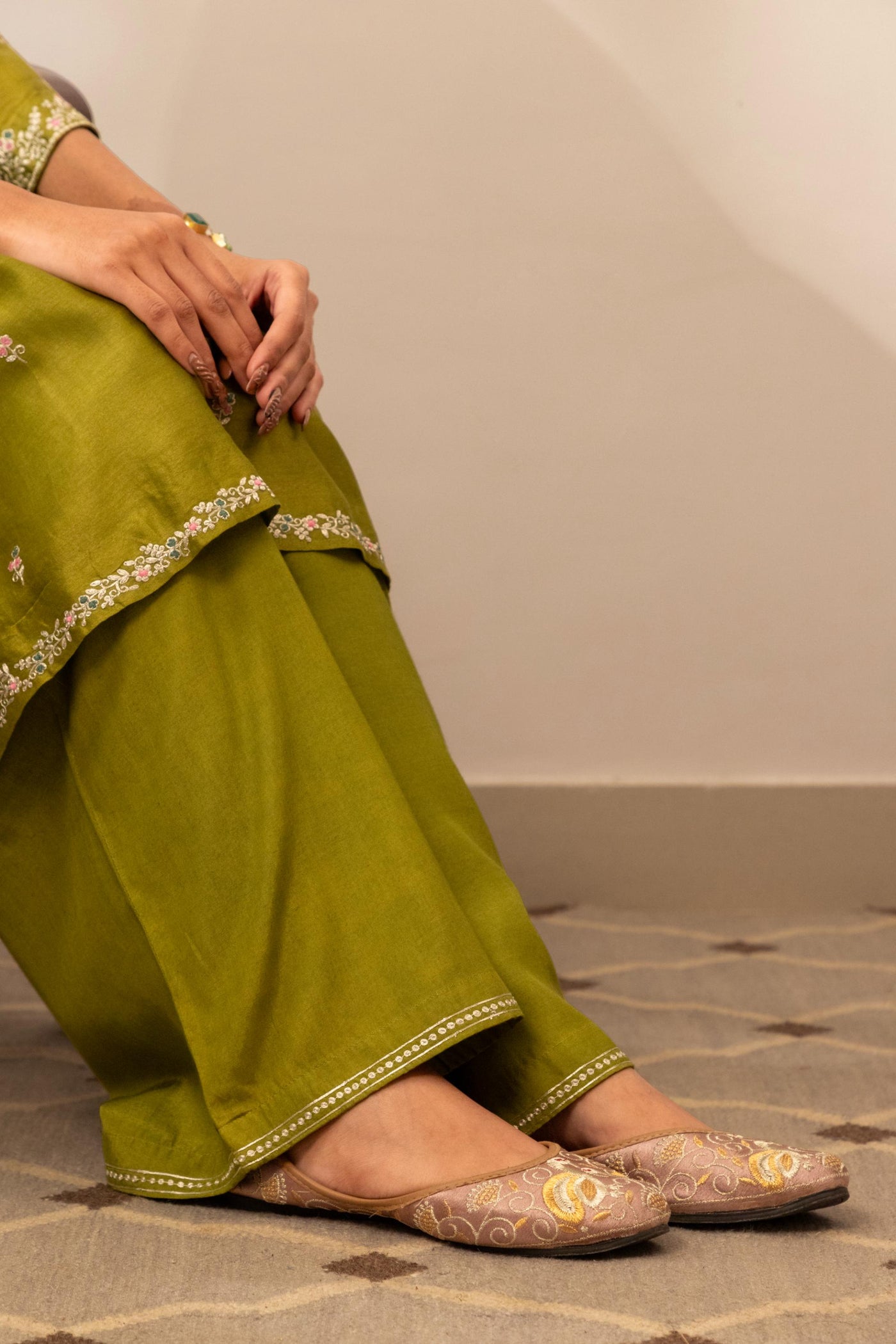 • Elevate your style with these green Keri Chanderi pants featuring delicate metallic tilla embroidery on the edges and hem. Perfectly paired for an elegant and festive look.