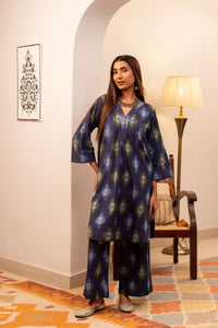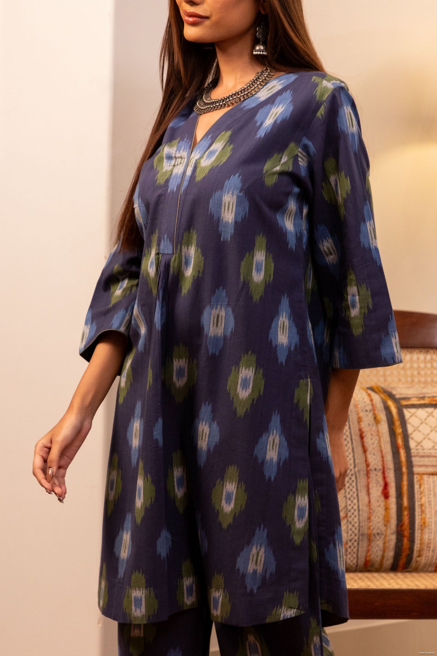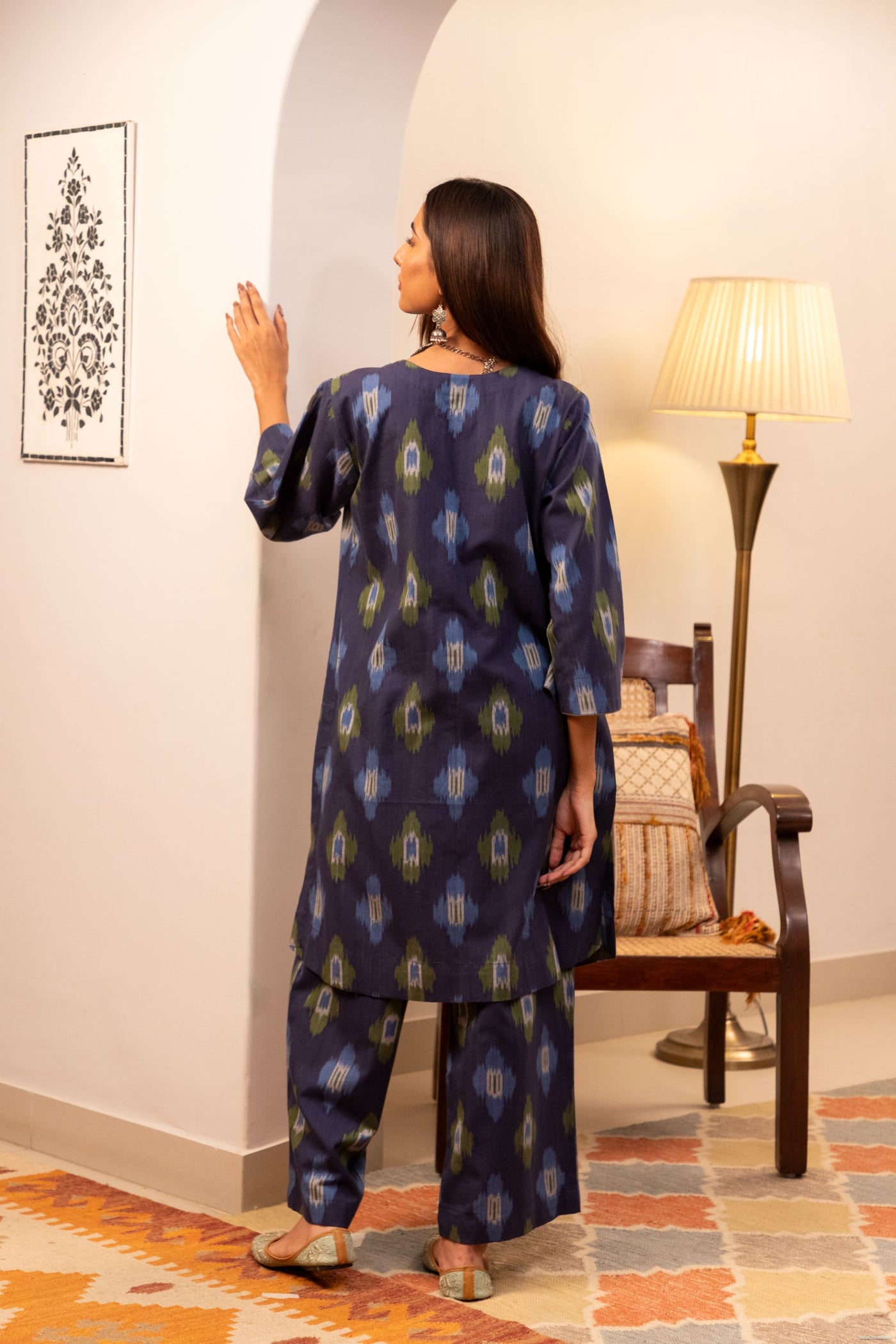 Effortlessly elegant and crafted for modern ease, the Ocean Moss Co-ord Set is made from pure hand-woven Ikkat cotton in a rich navy blue hue adorned with soft green motifs. This timeless piece brings together sophistication and comfort, making it your go-to outfit for any occasion.