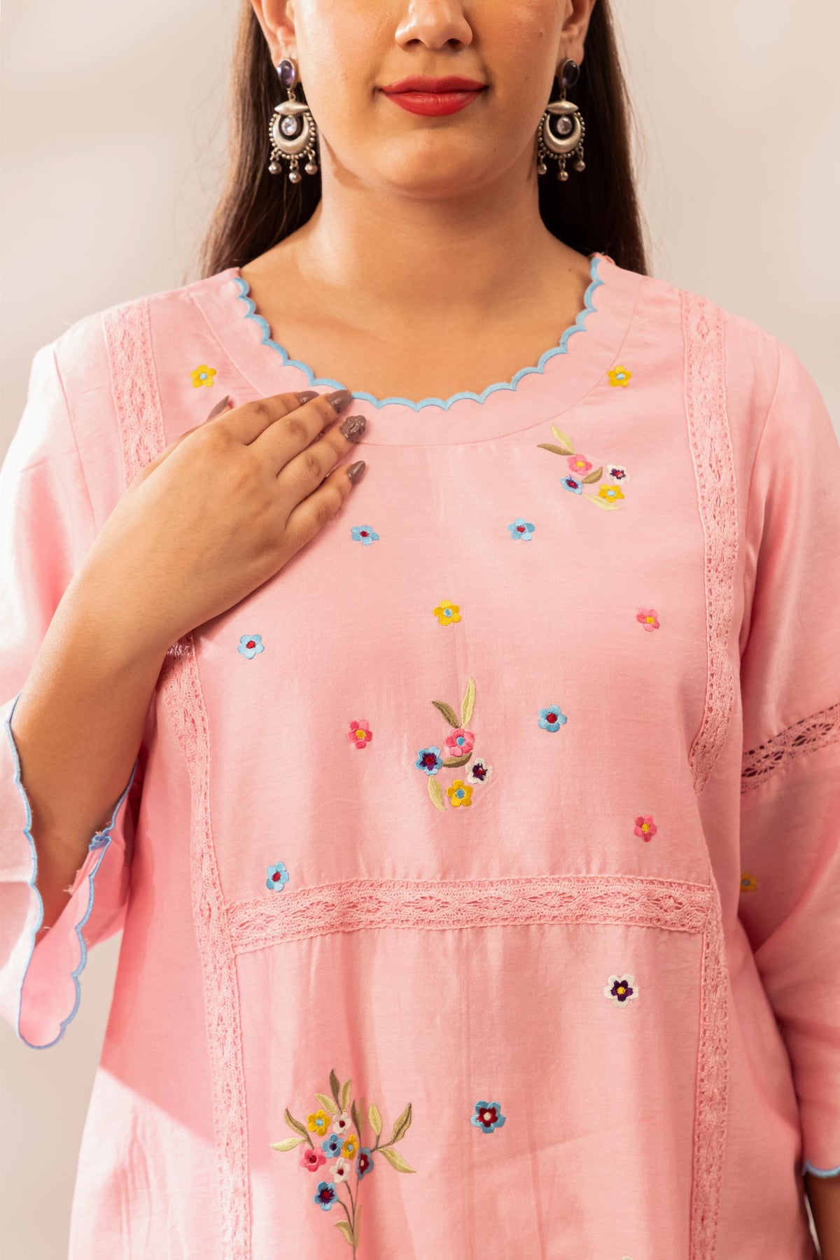 - Step into playful elegance with the Pink Garden Kurta Set, crafted in soft pink Chanderi silk. Adorned with vibrant floral embroidery and scalloped details, this set radiates festive charm.