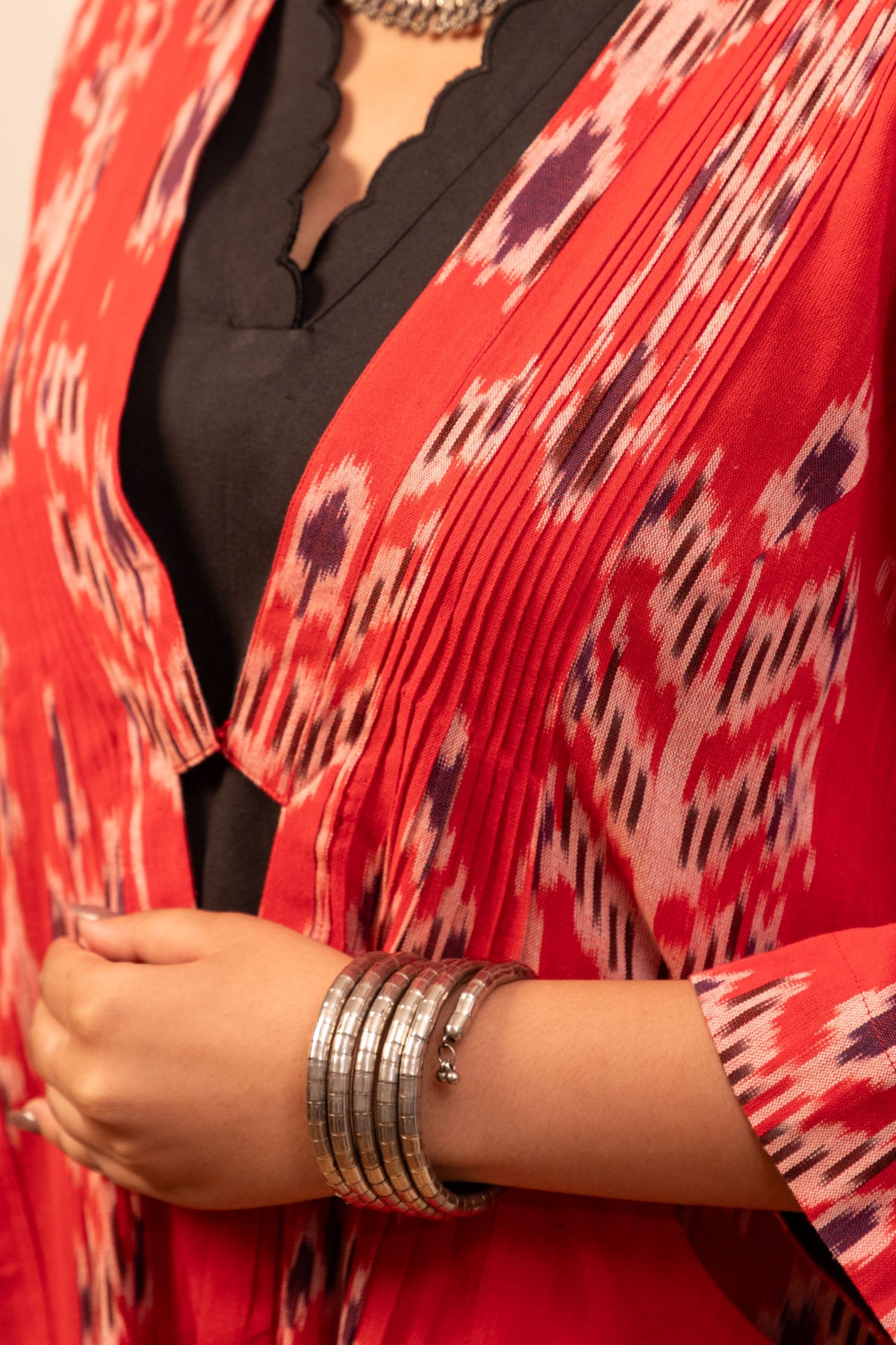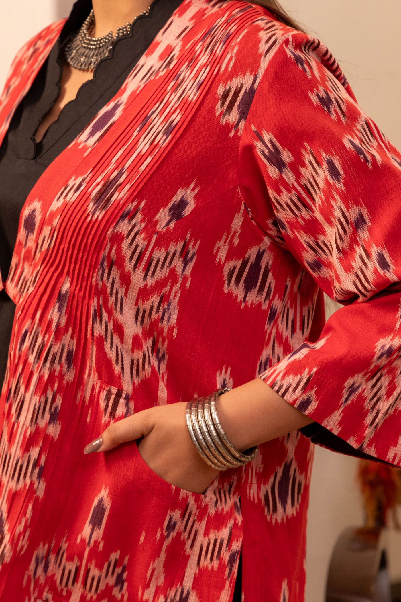 - The Red China Ikkat Jacket is a versatile handwoven statement layer that instantly elevates any outfit. Made from premium ikkat fabric, this jacket combines the artistry of traditional weaving with a modern silhouette, making it perfect for layering over everyday or festive ensembles.