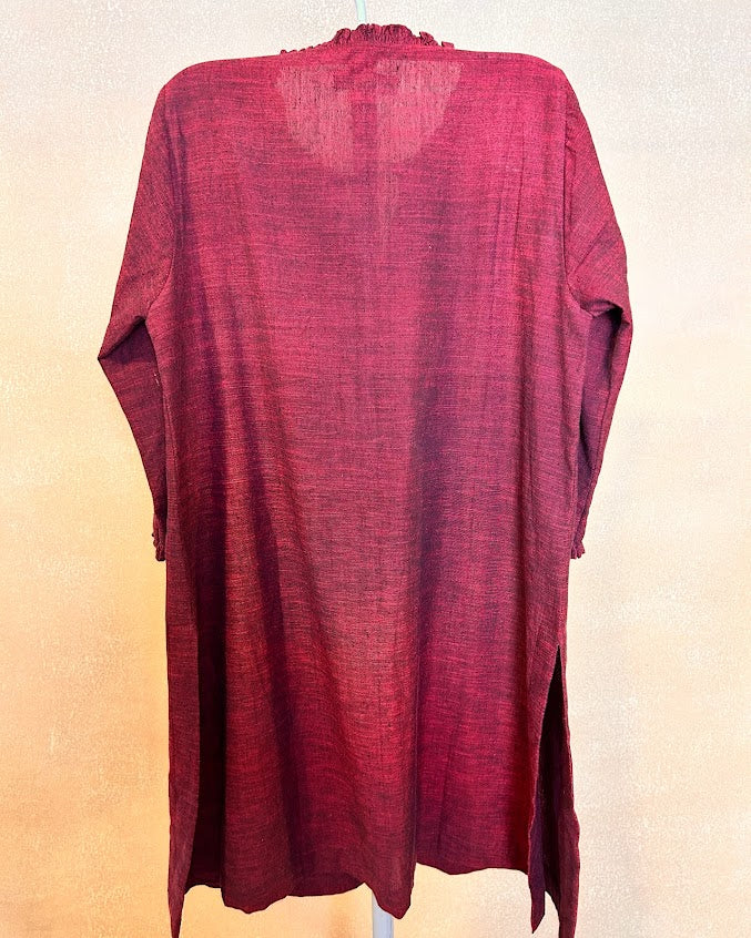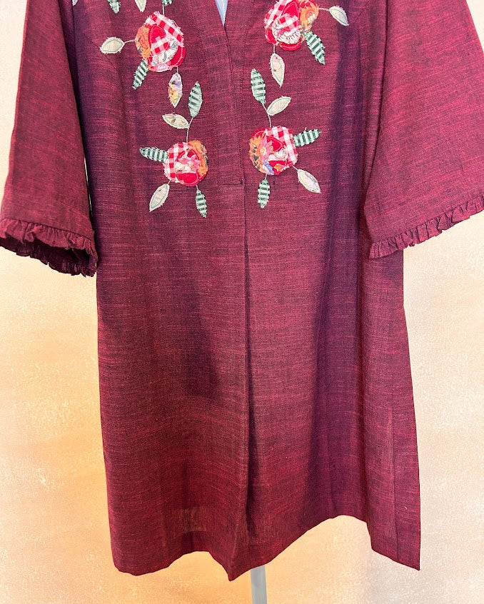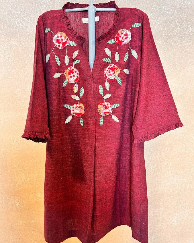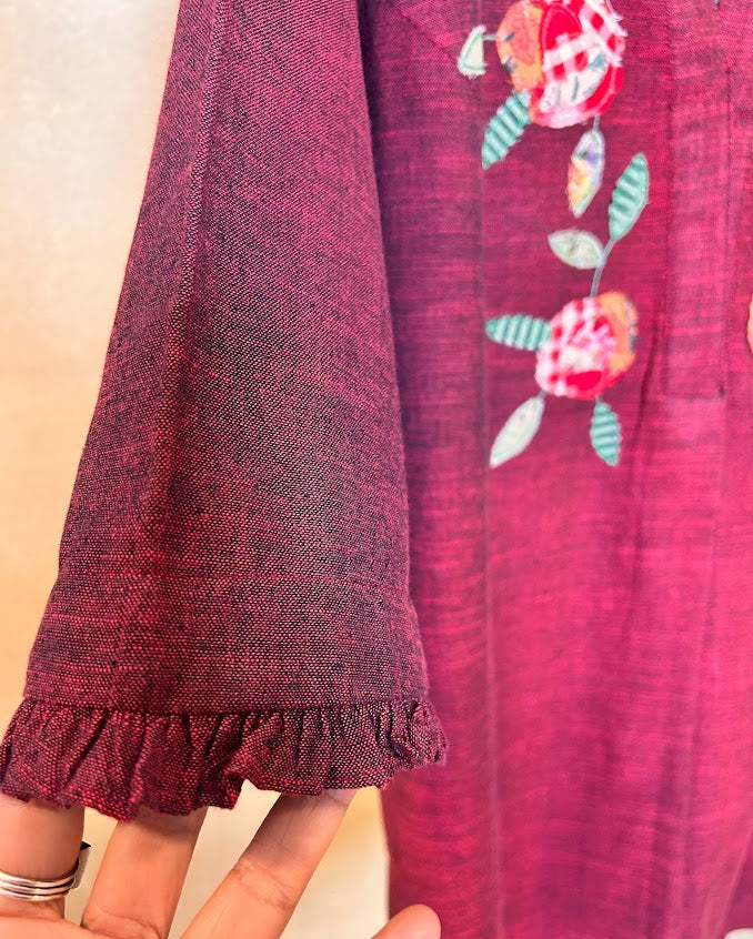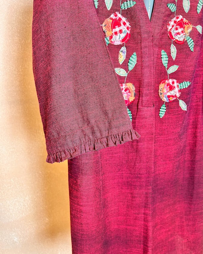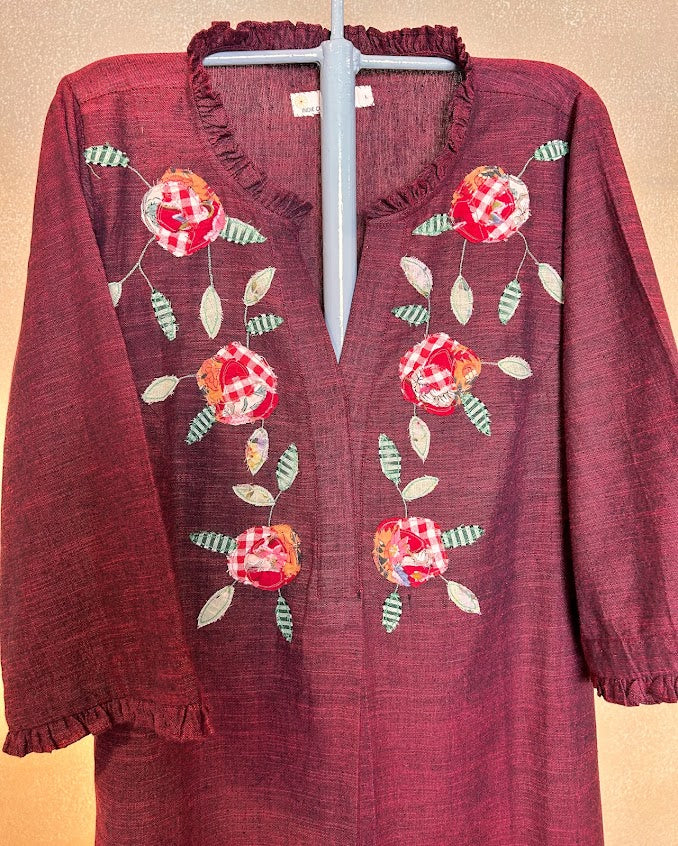 “Red Rose” from the ‘Rosy Picture’ is a pure soft cotton co ord set handwoven by the Artisans of India is an artwork of appliqué with a collage of fabrics with delicate and intricate detailing like frill on the neck and sleeves and curved pants where pocket is a must as women being multitaskers have a lot in hand